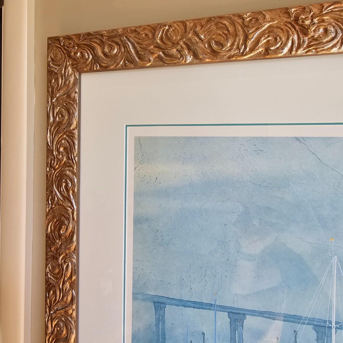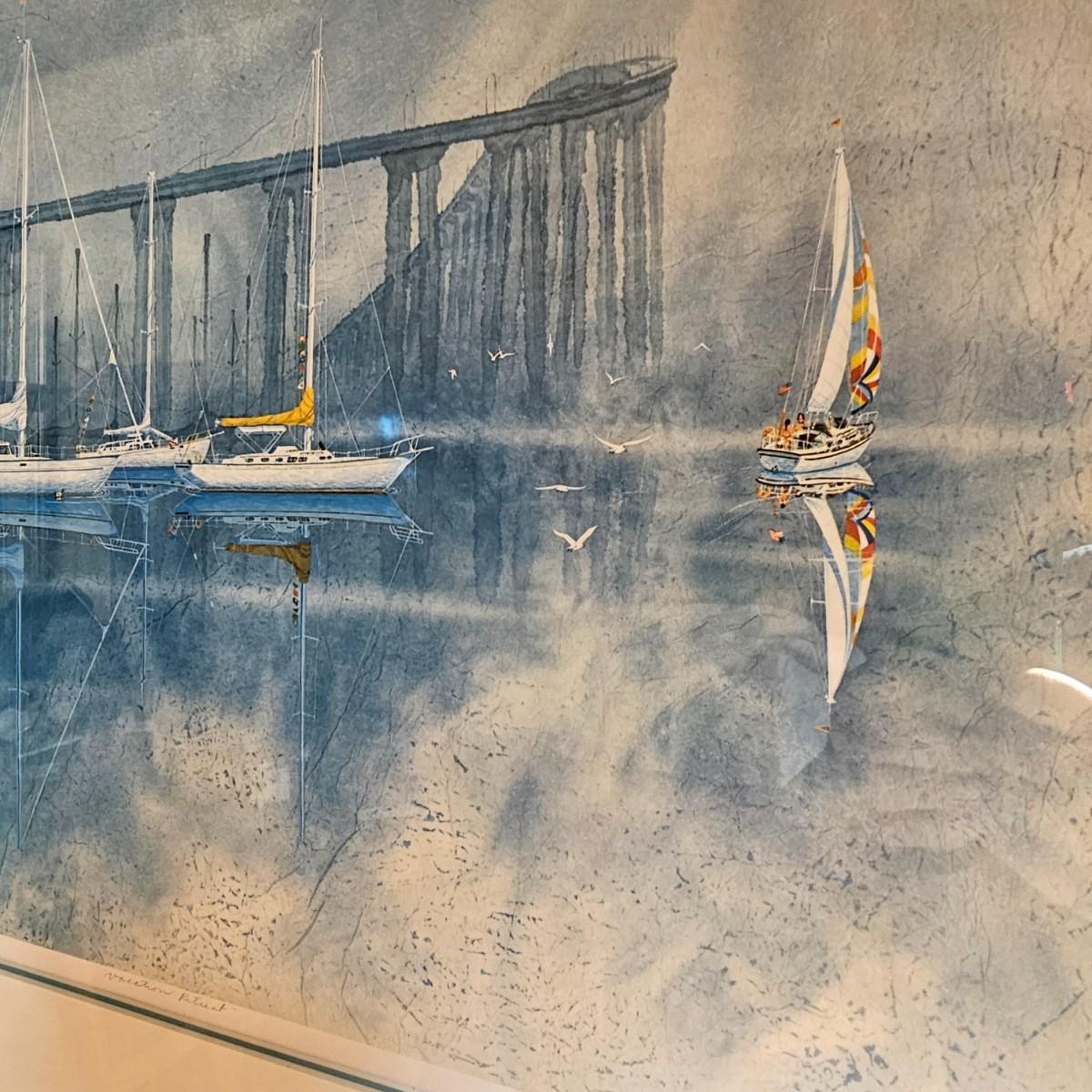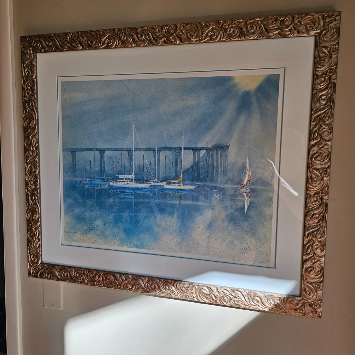 Sailing boats at anchor in San Diego, a favorite area of artist John Yato. This signed/numbered print, 'Vacation Retreat' has soft flowing blues and colorful sailboats. Print measures 33.5" x 28.5"H. Professionally framed. See photos for details.