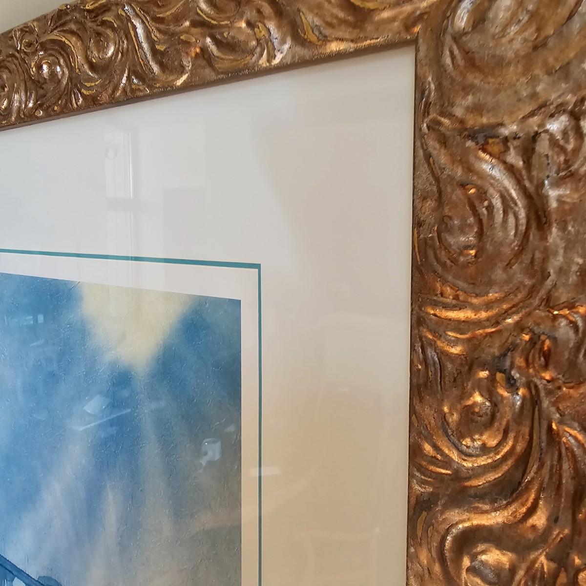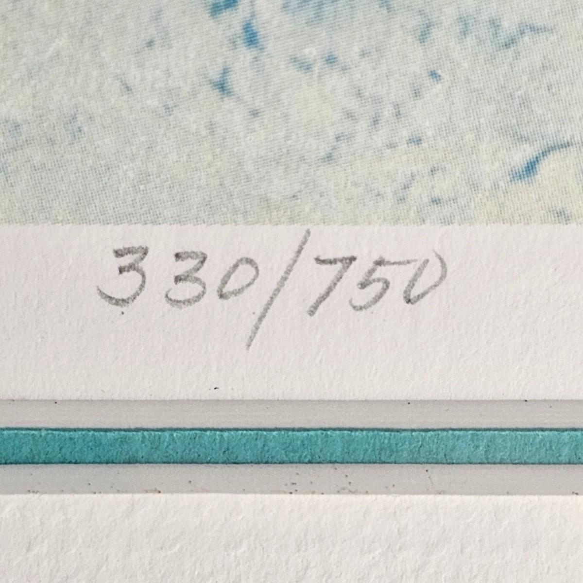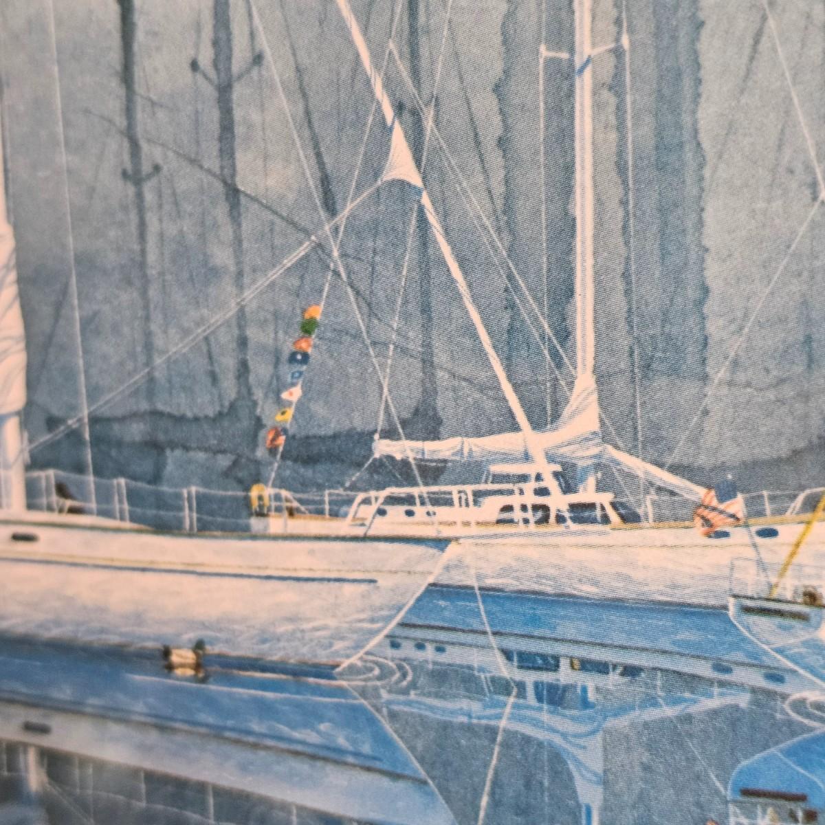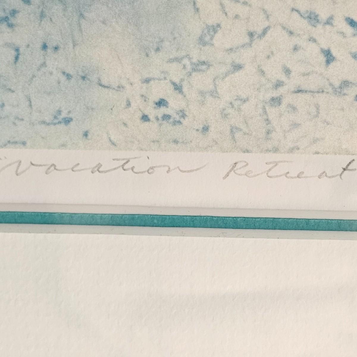 Sailing boats at anchor in San Diego, a favorite area of artist John Yato. This signed/numbered print, 'Vacation Retreat' has soft flowing blues and colorful sailboats. Print measures 33.5" x 28.5"H. Professionally framed. See photos for details.