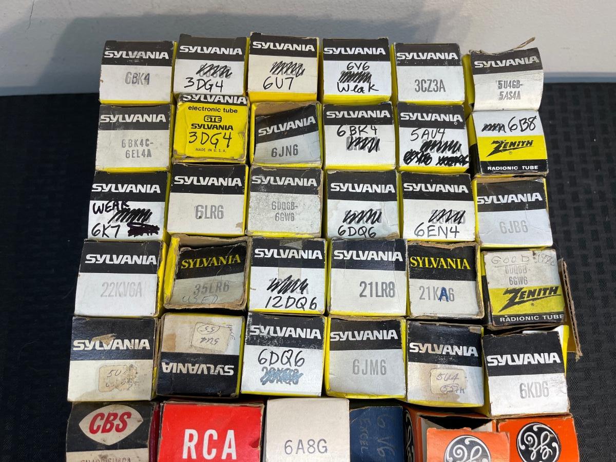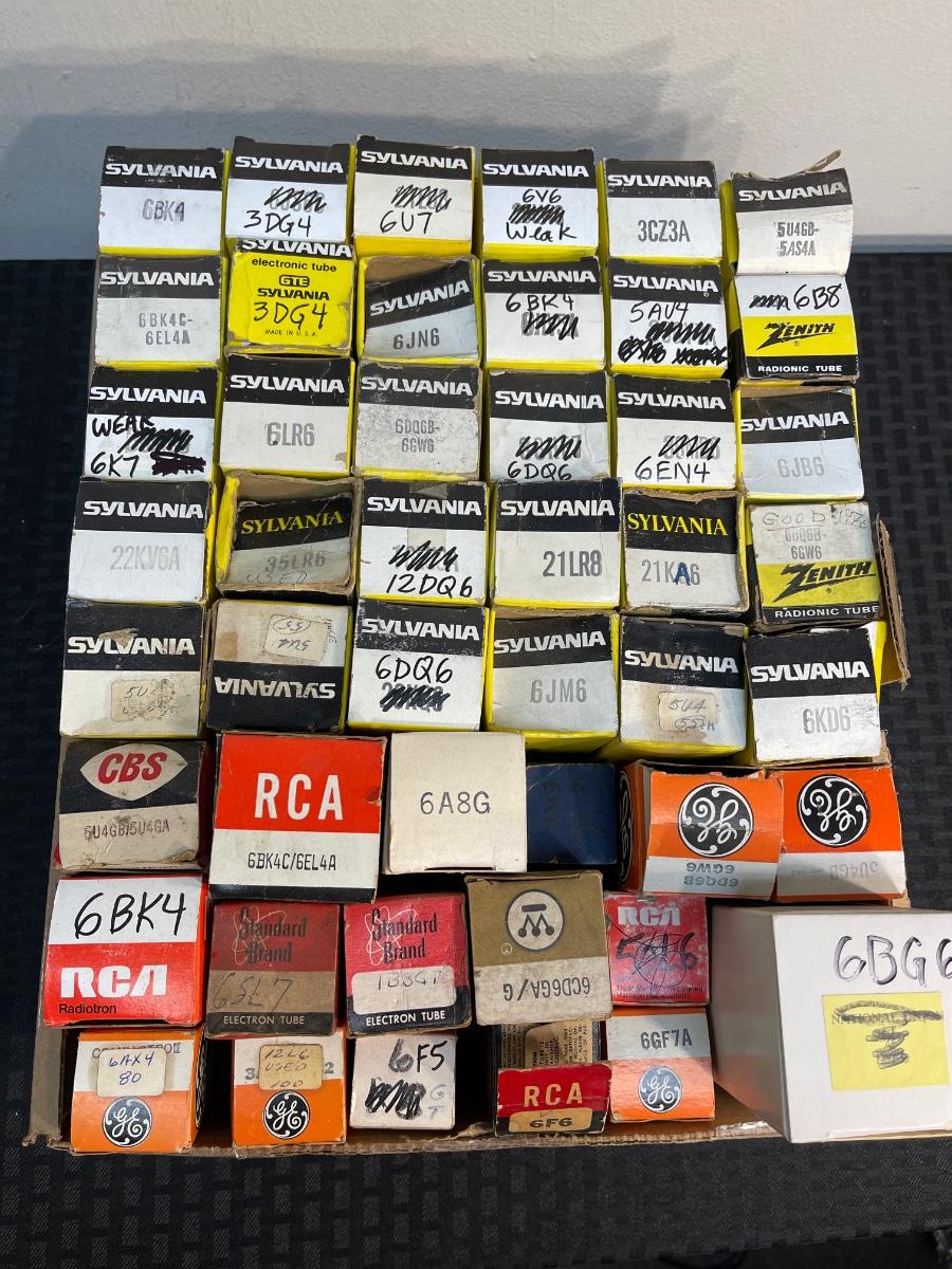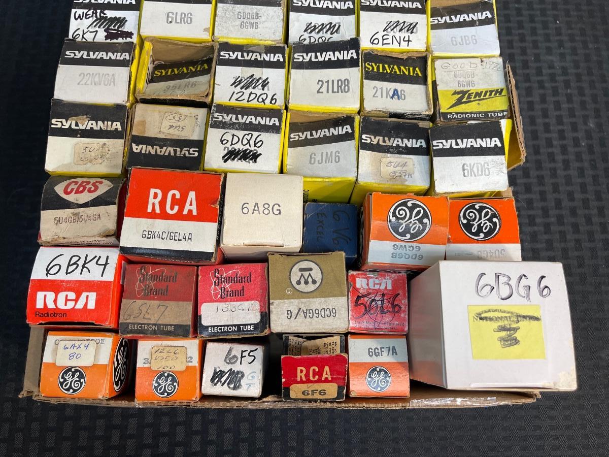 This auction is for this box of tubes from our recent Fullerton estate. These are untested. Looks like previous owner may have reused boxes as numbers have been crossed out and written on in marker.
