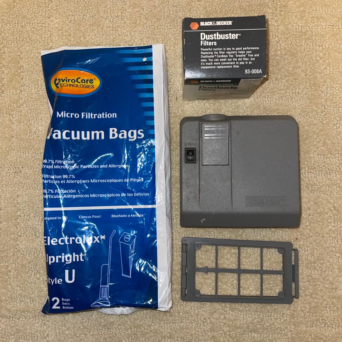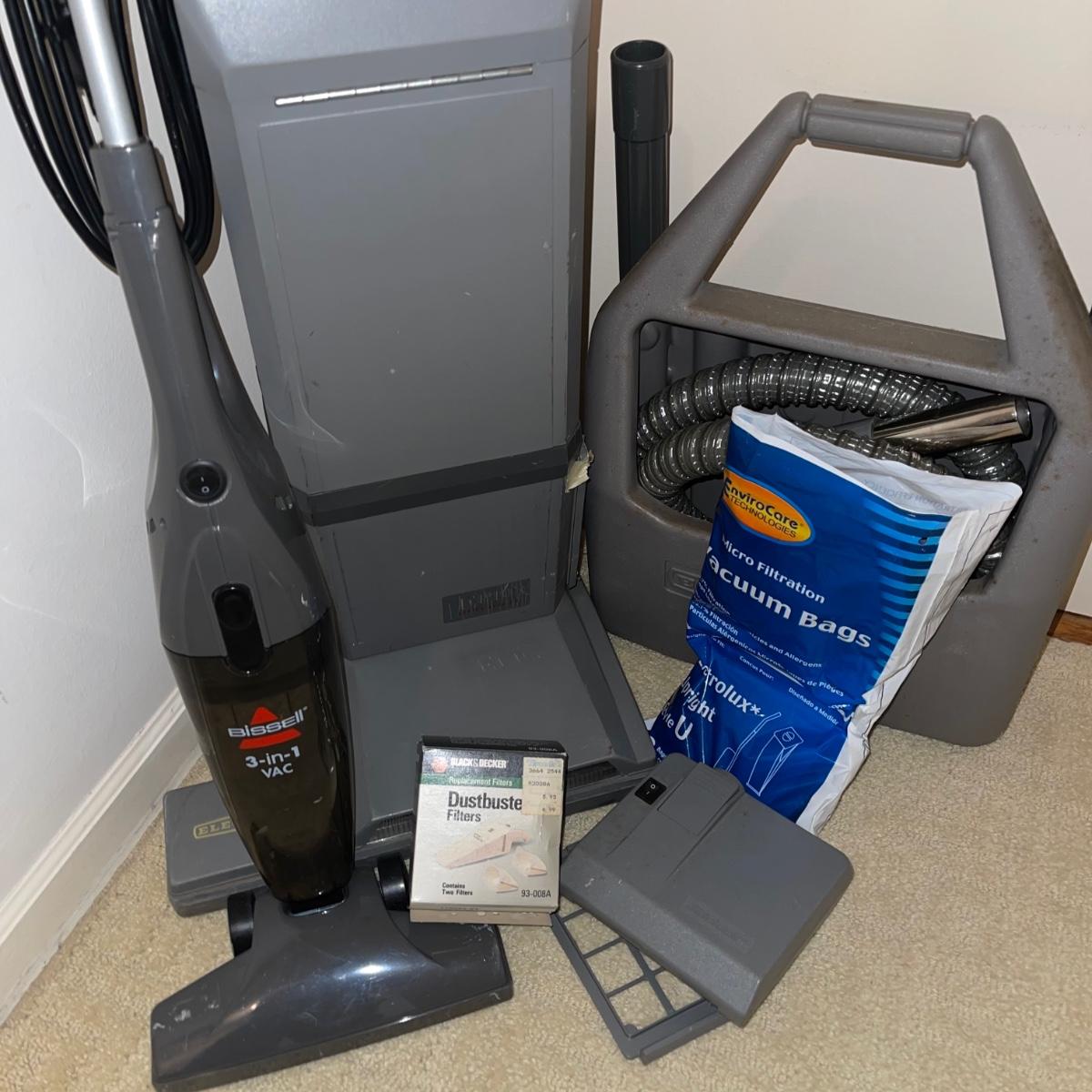 Electrolux vacuum, a Bissell 2-in-1 vacuum, hose extensions for the Electrolux, dust buster filters, vacuum bags, and other part for the Electrolux vacuum. The Bissell is a small and slender lightweight vacuum, easy for portability. Both powered on when tested and are in good condition with no oder.