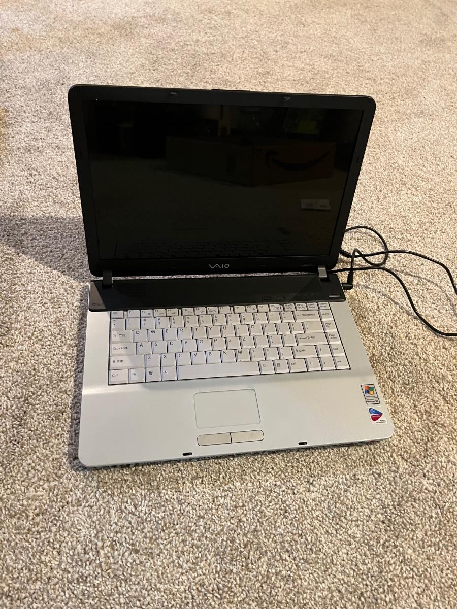 Vaio laptop with charging cord. Unsure on year or if it powers on.