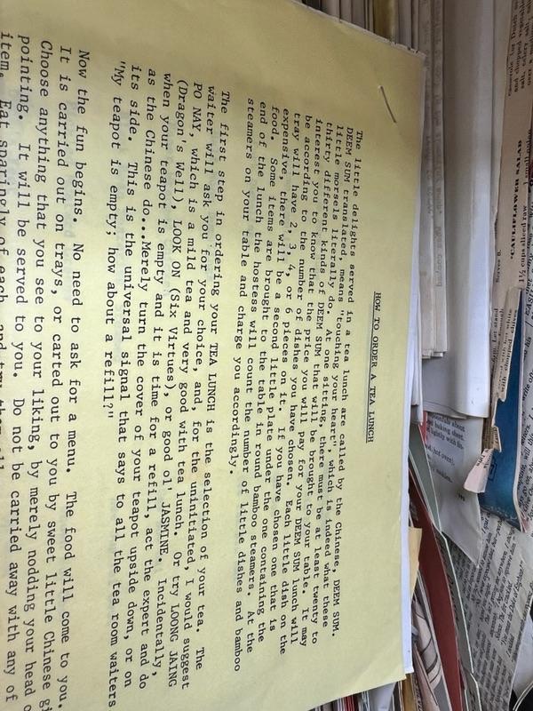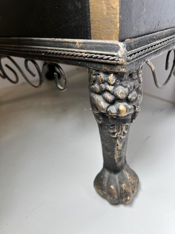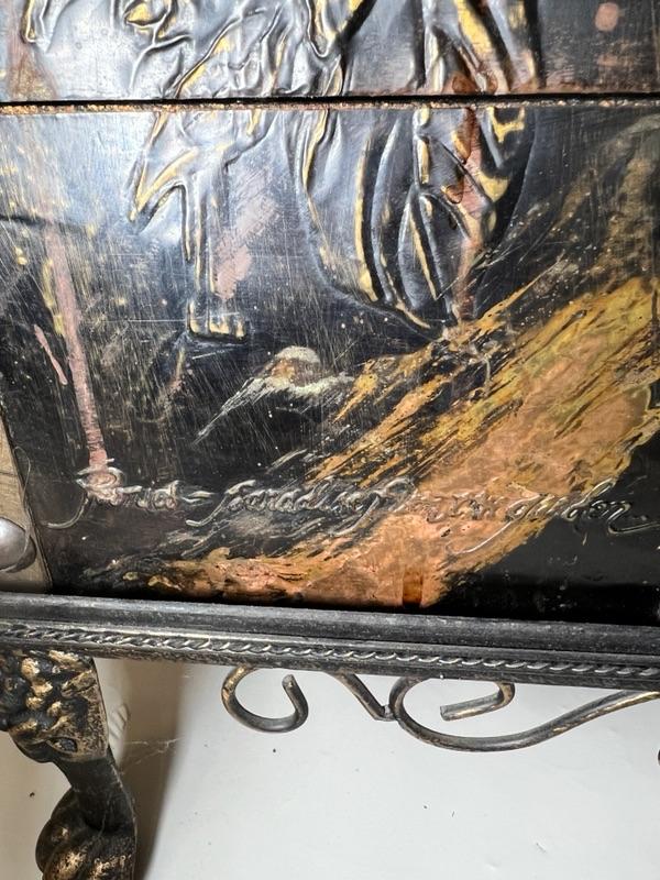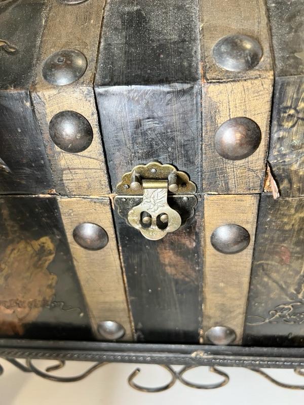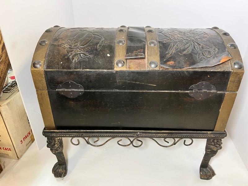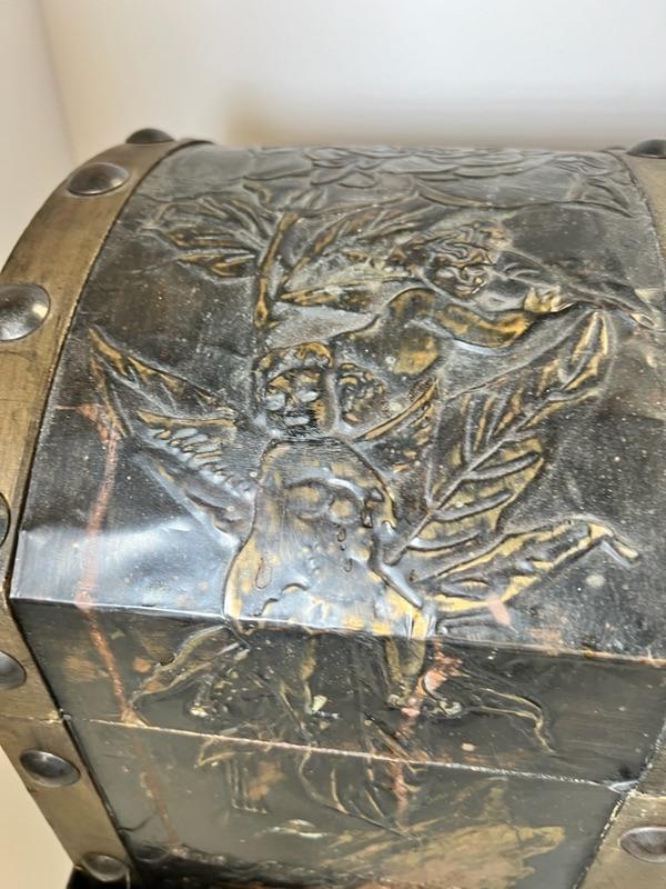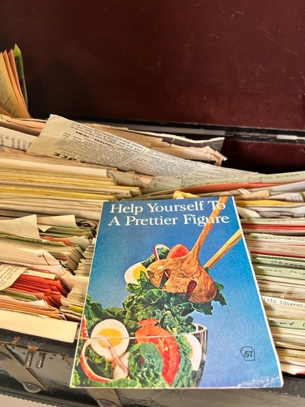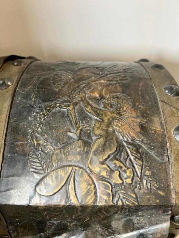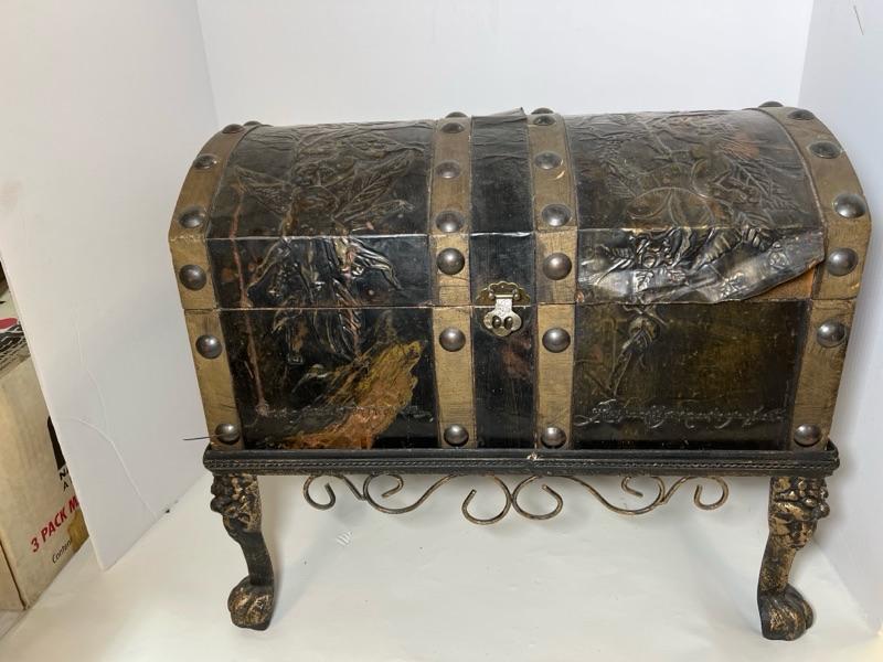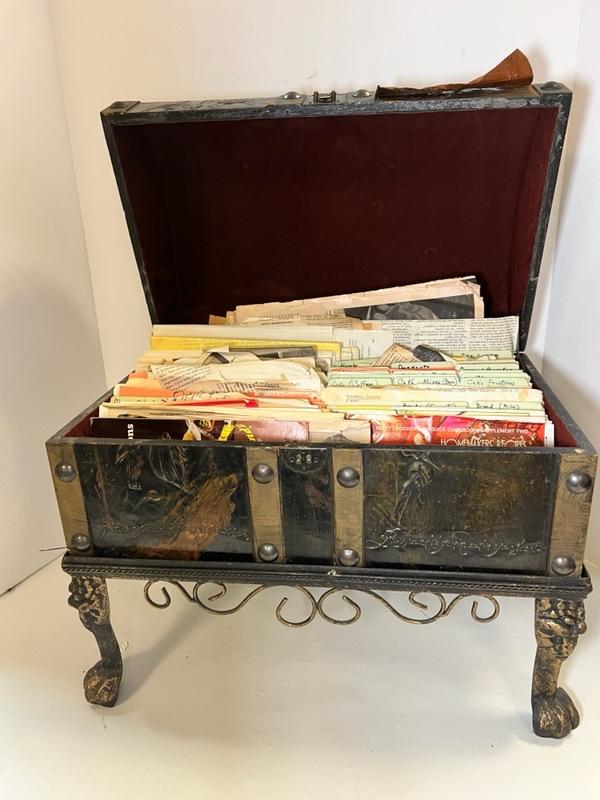 Amazing recipe collection in this wood chest that sits on a cast brass frame the upper part is covered in pressed 10 with images of Cupid inside. The chest is an obsessive collection of recipes, cut outs ,handwritten from the 40s through the 90s. This chest weighs about 30 pounds, and is unable to be shipped.