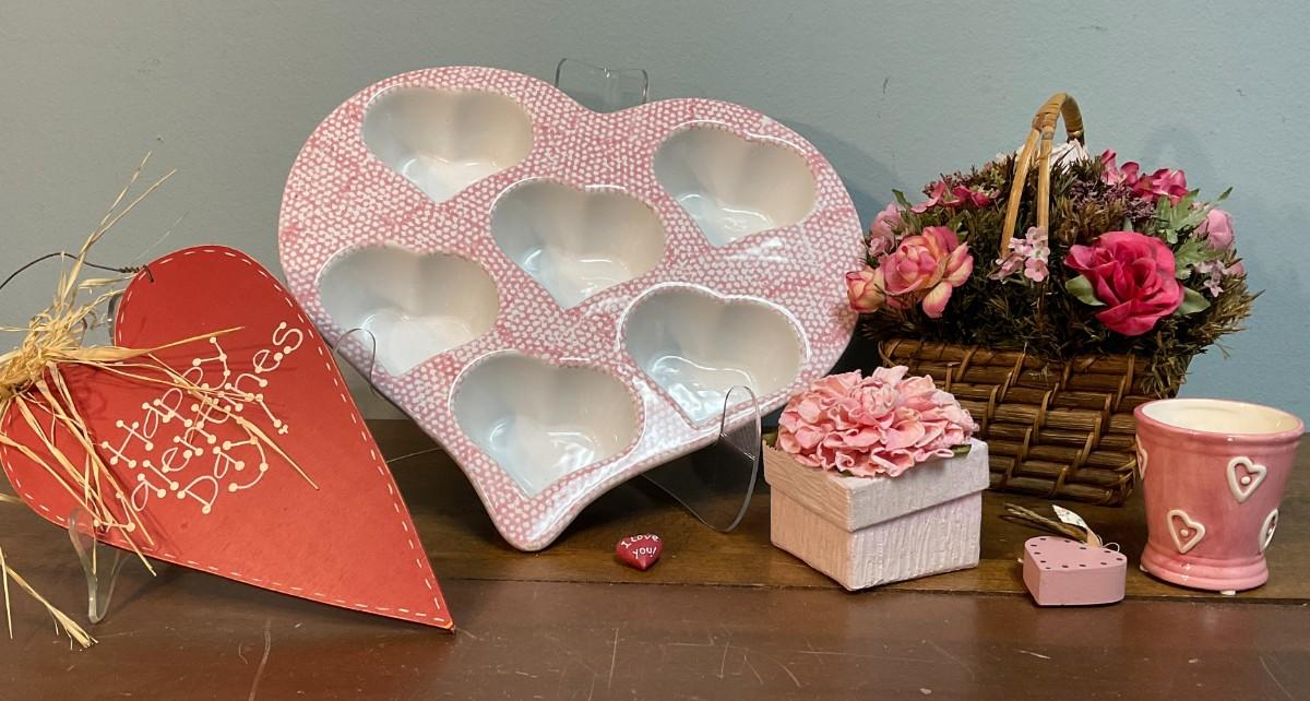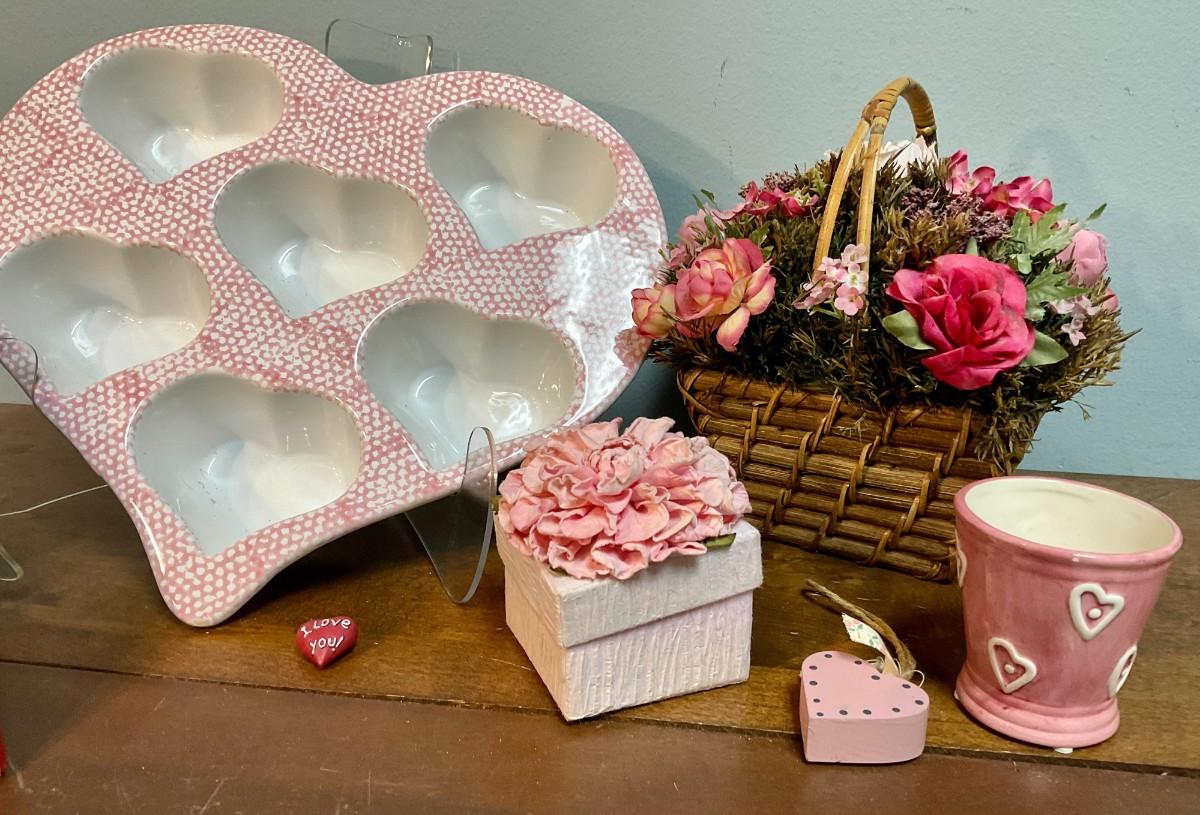 Valentine's Day Lot - Ceramic Muffin Pan, Candleholder, Pretty Box, Basket of Flowers, & More