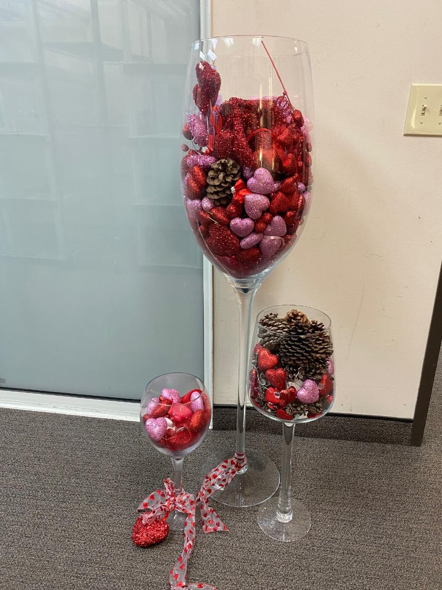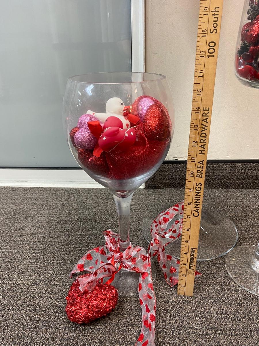 Wine Glasses Goblets Holiday Seasonal Decor. In good condition. Goblets are made of glass not plastic. The tallest one is about 4’ tall. Great for Valentines, anniversary, romantic date night decor or repurpose ideas.