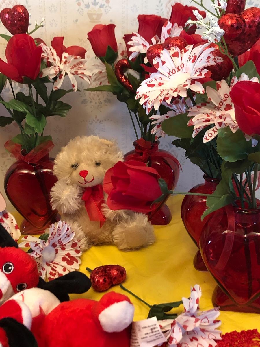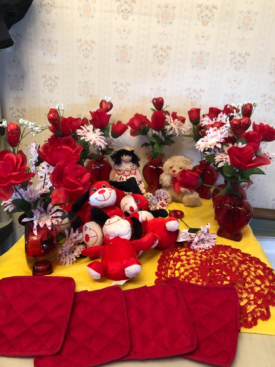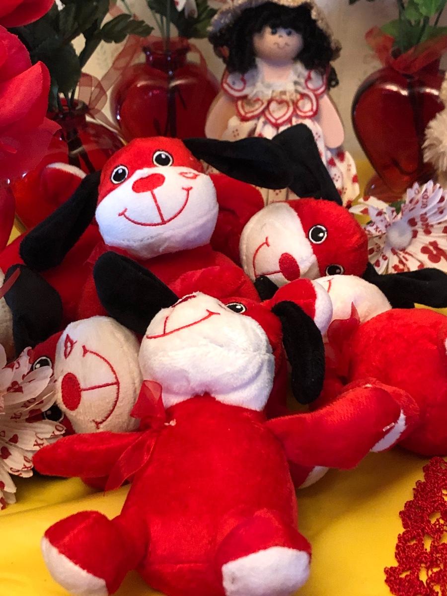 Valentine’s Day table Decor lot::vases, flowers, plush dogs, doll, etc.In good condition.
