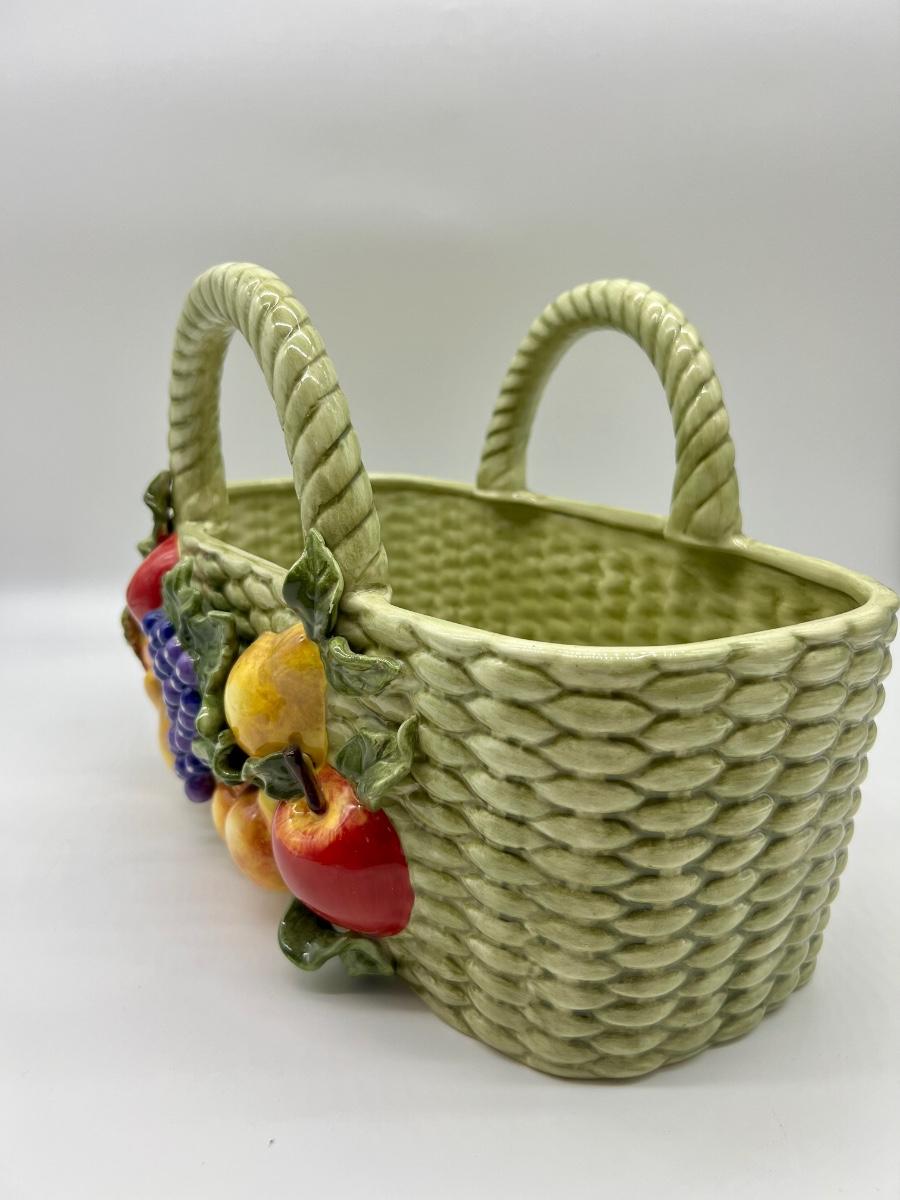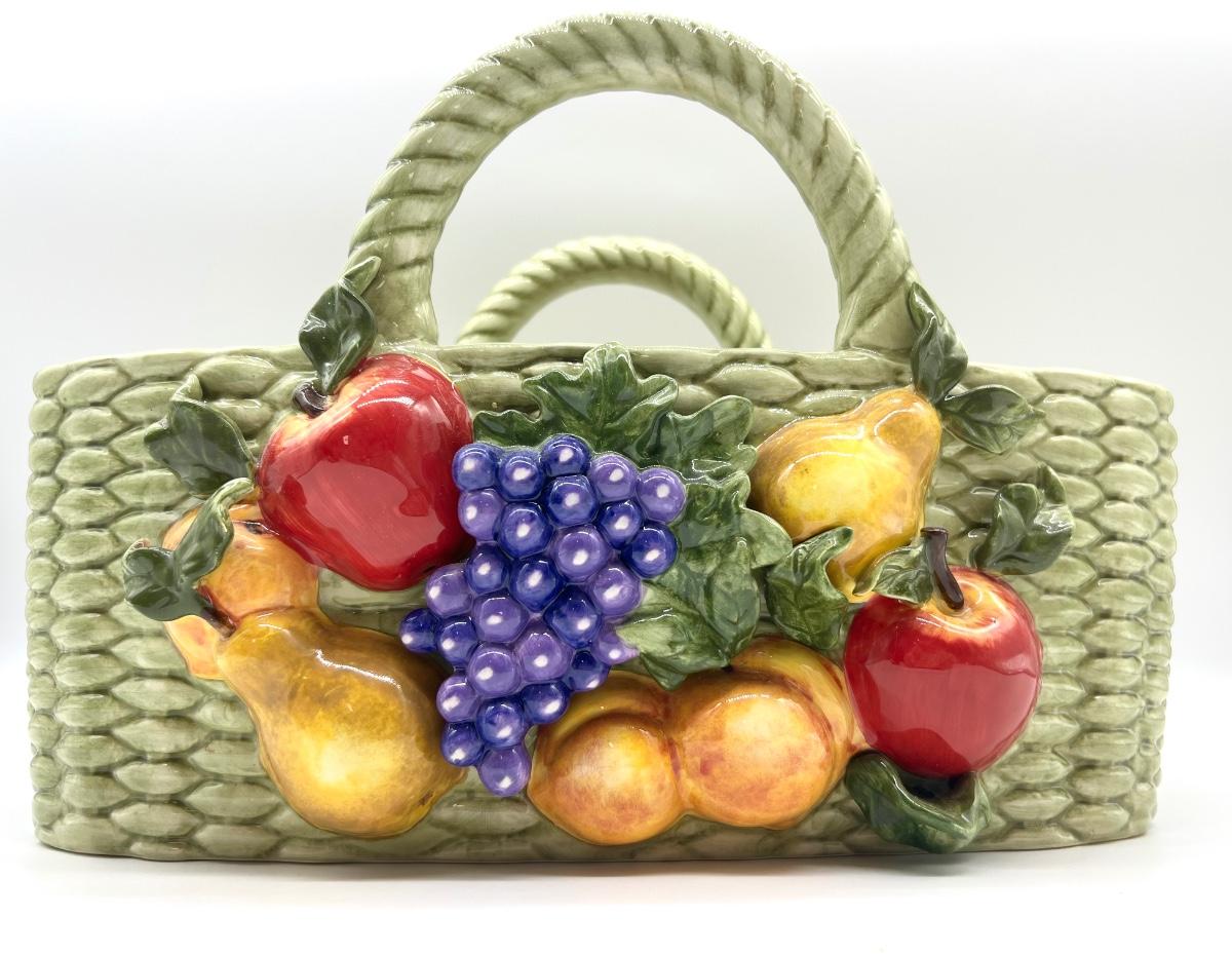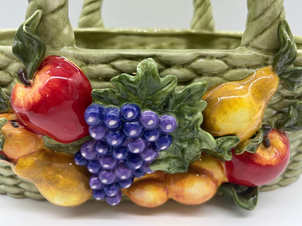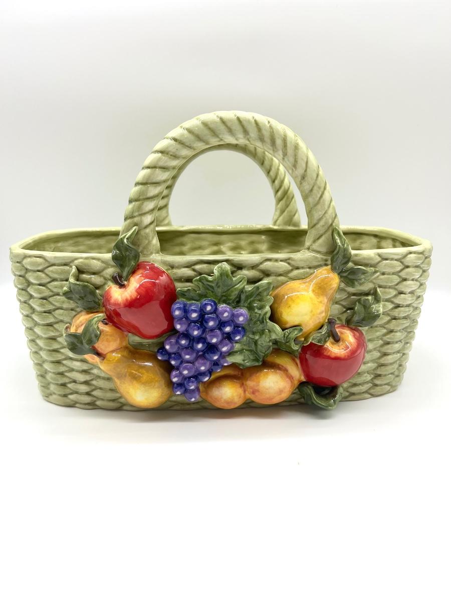 New, never used Valerie Past Jill Green Ceramic Basket Handles Fruit Motif measures 10 1/2 inches tall, 16 inches wide, approximately 8 inches deep.