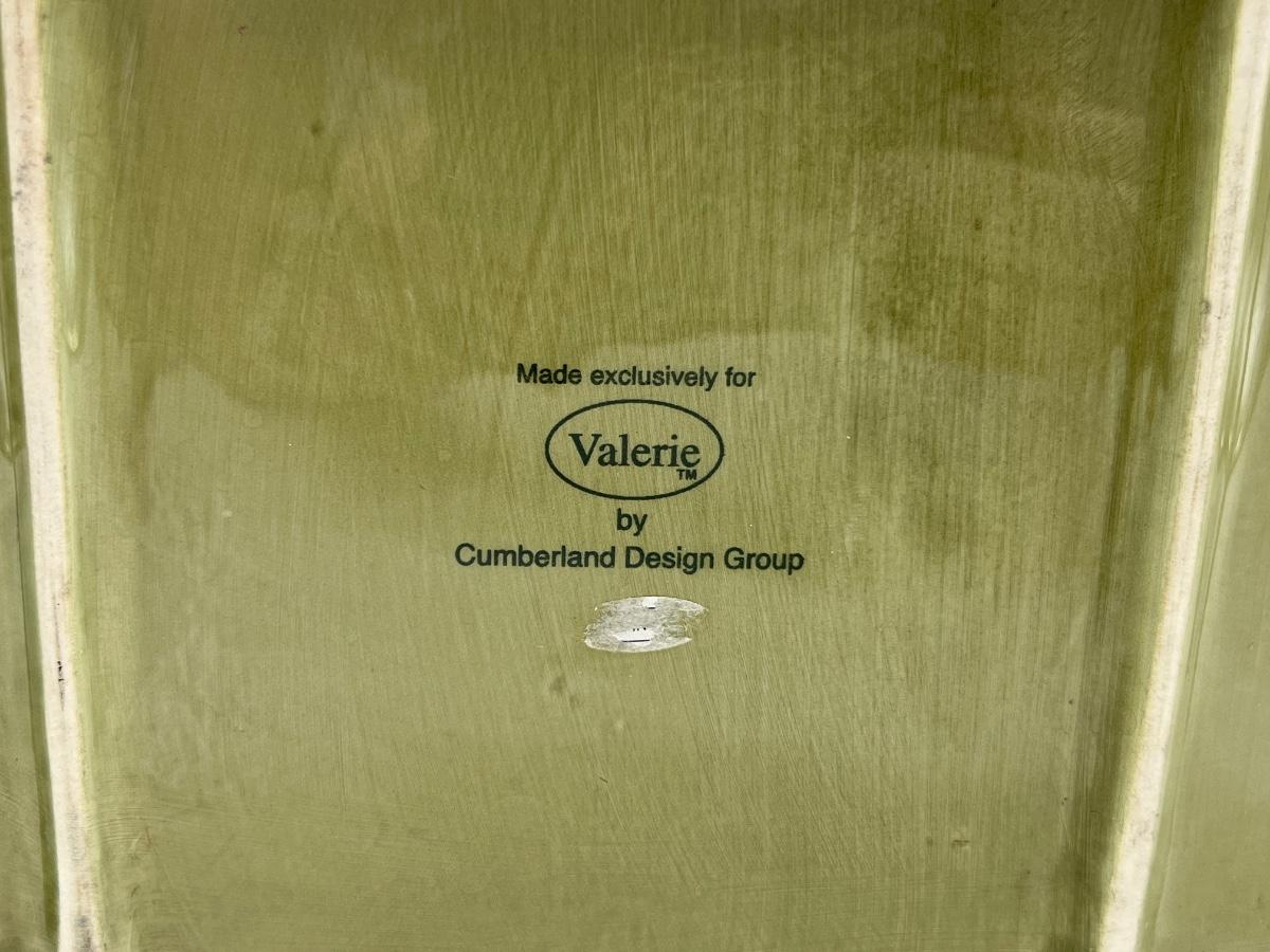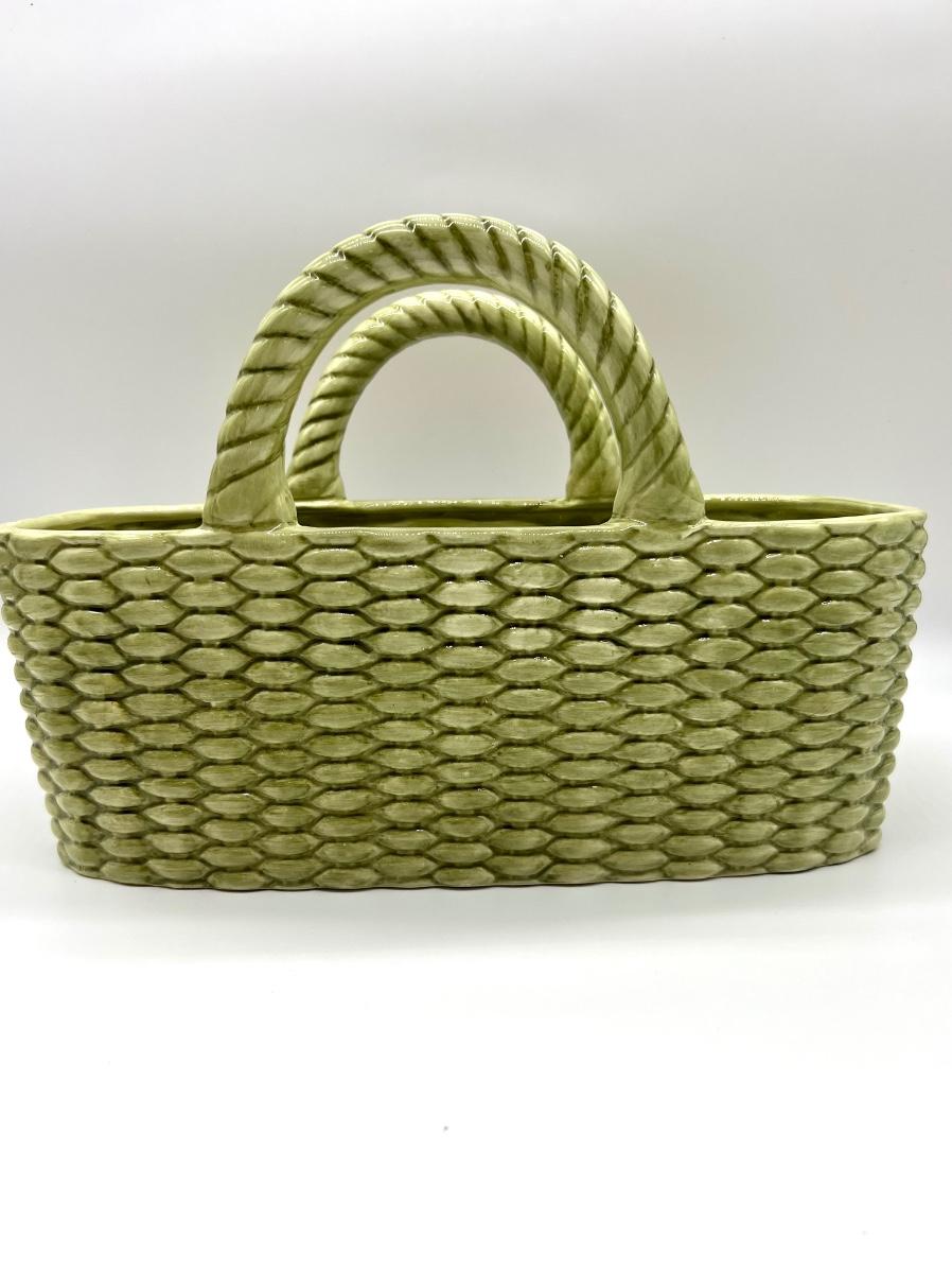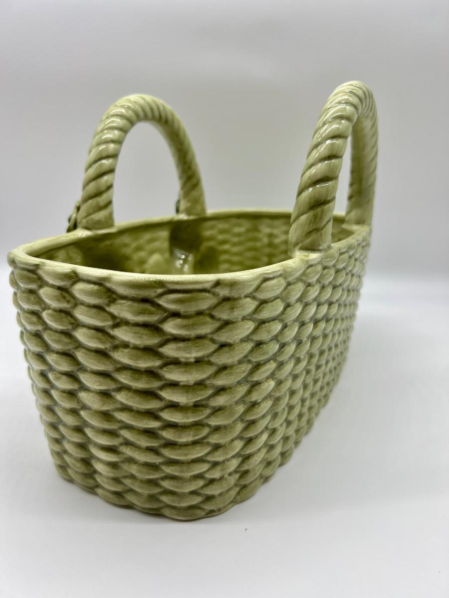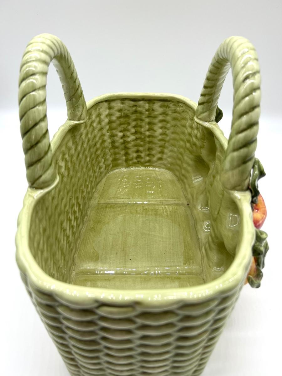 New, never used Valerie Past Jill Green Ceramic Basket Handles Fruit Motif measures 10 1/2 inches tall, 16 inches wide, approximately 8 inches deep.
