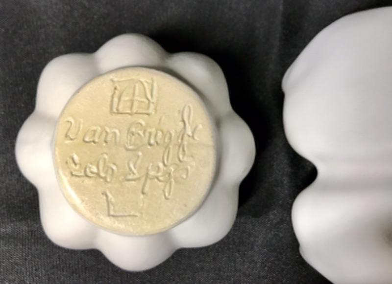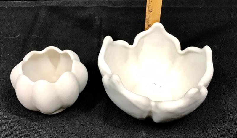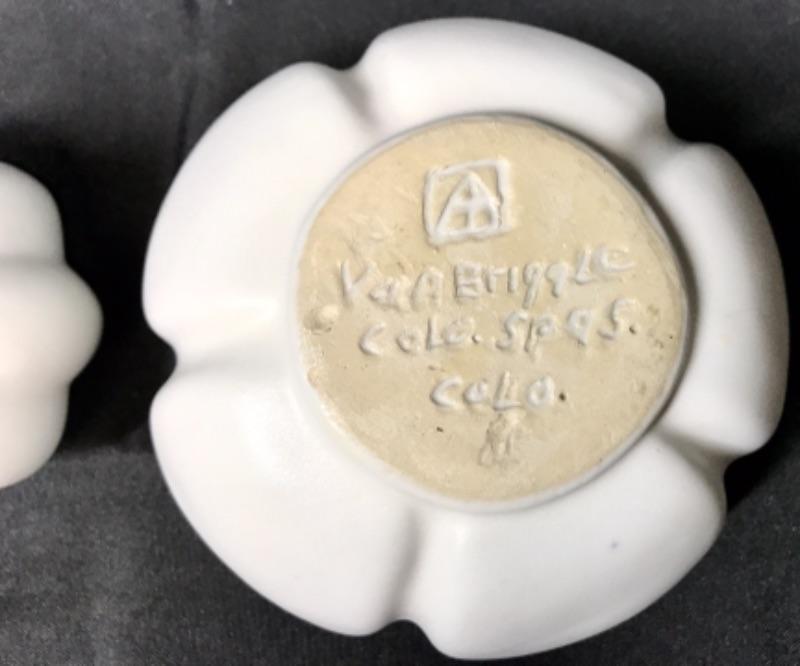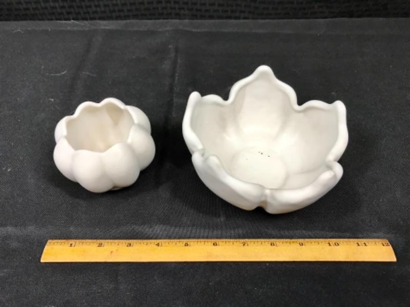 VINTAGE 2 PIECE VAN BRIGGLE POTTERY MATTE WHITE TULIP VASE / CANDLE HOLDER & MELON BOWL VASE