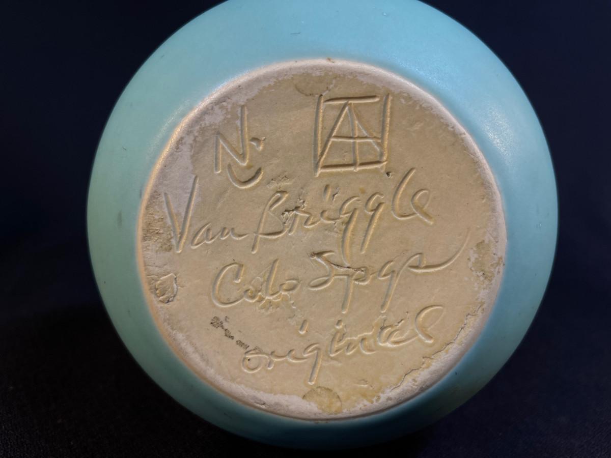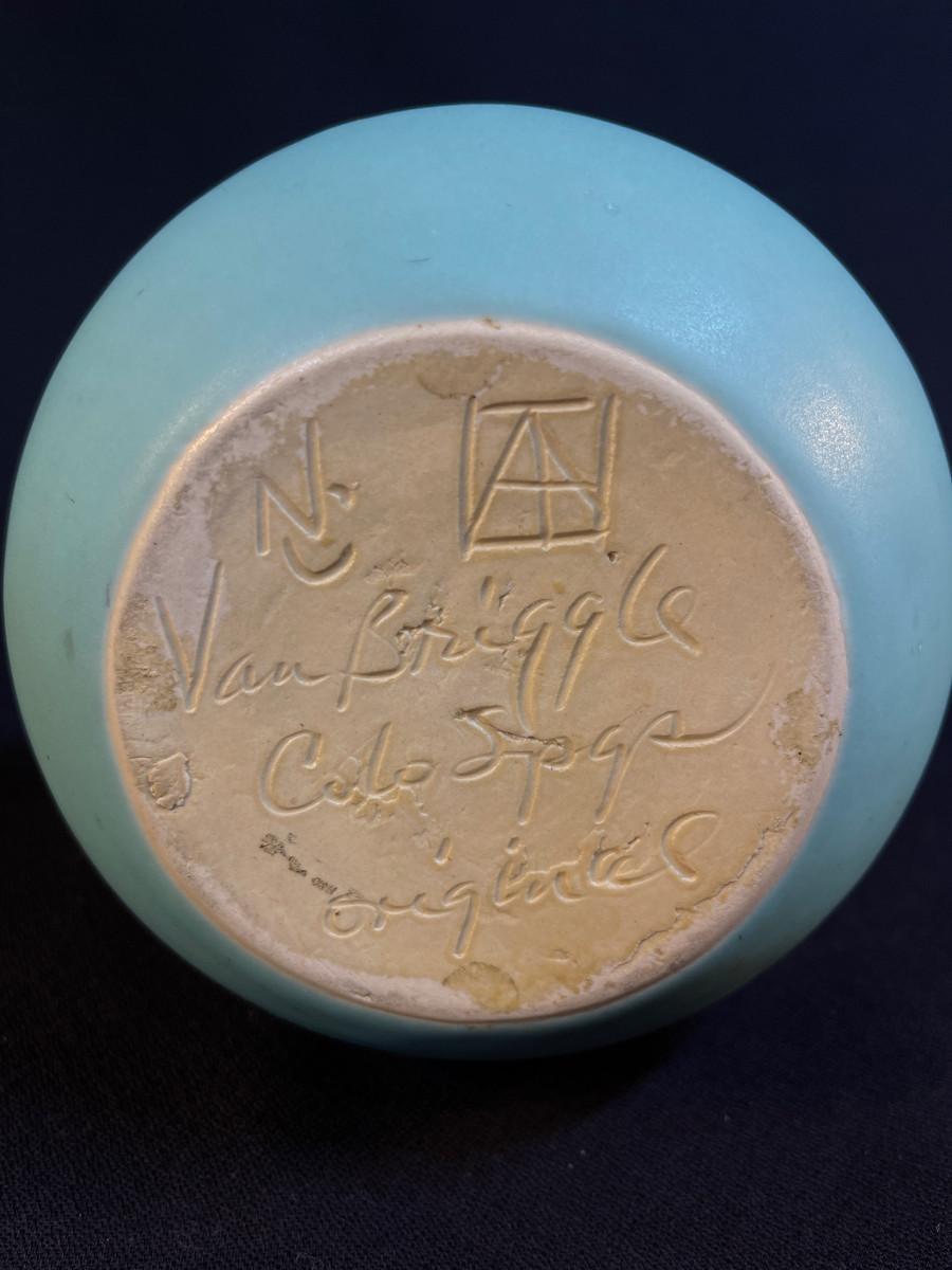 The subject item is a Van Briggle, flare-lipped vase in turquoise blue, marked “original” with an “NC” monogram, AA chop mark, and “Van Briggle, Colorado Springs.” (See Photos). The interior of the vase is etched with lime, and has a random applied brown glaze marks inside the lip.