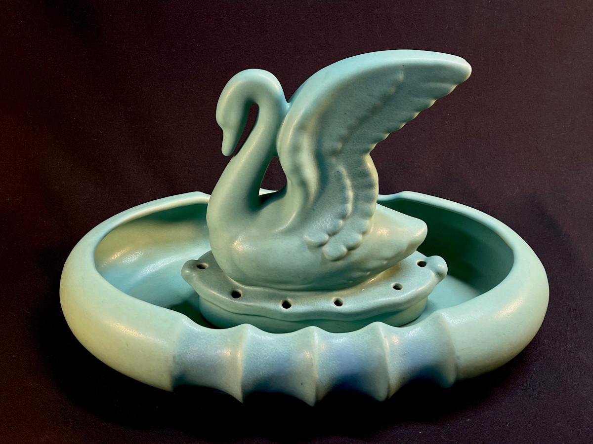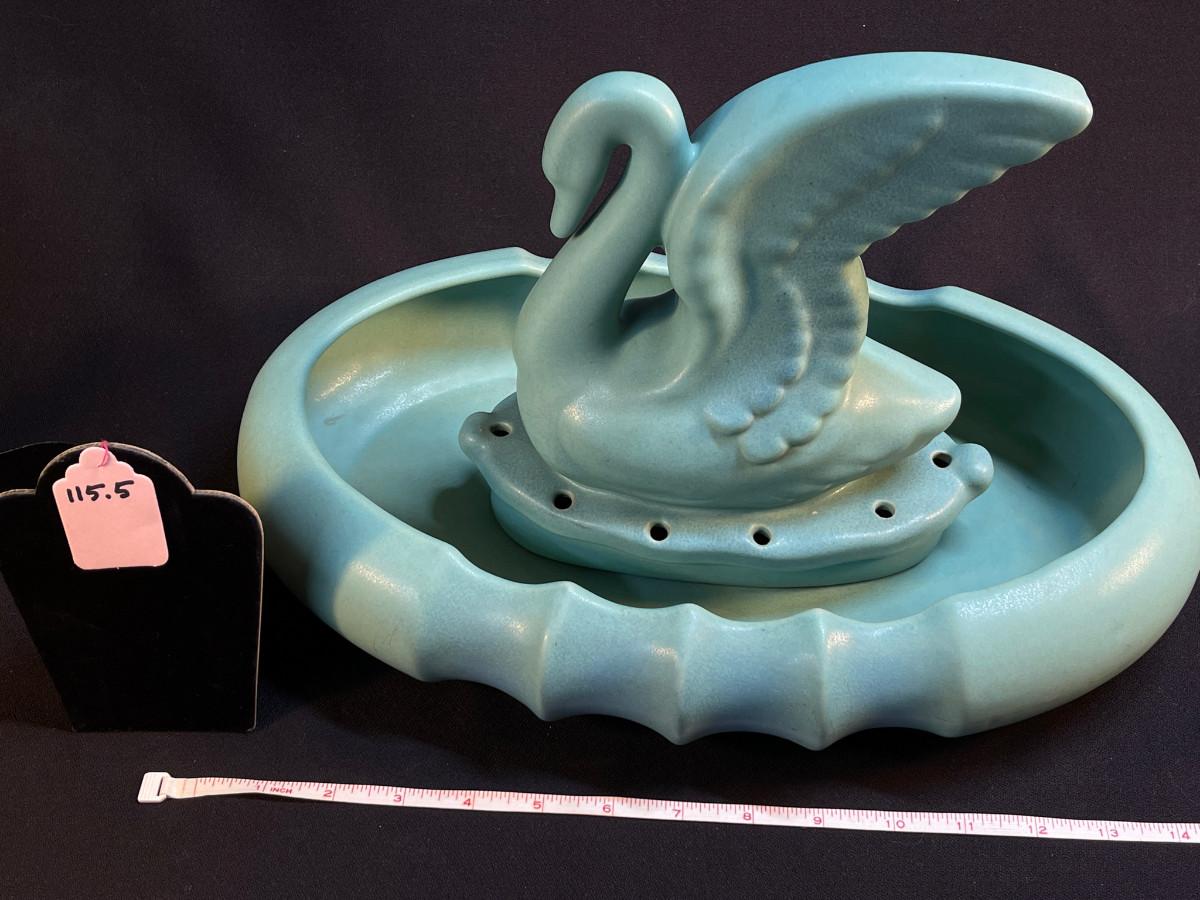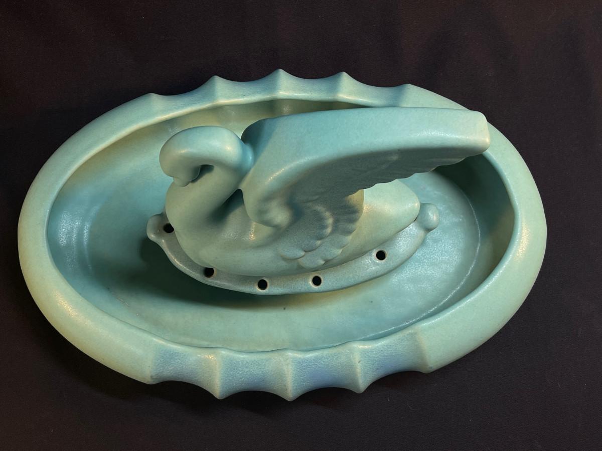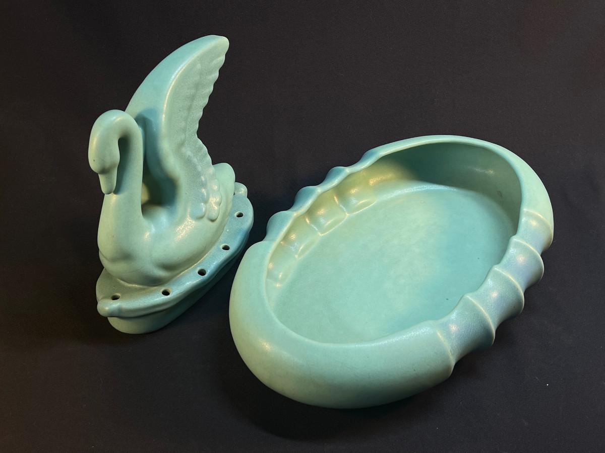 The subject item is a classic American, grand two-piece console piece by Van Briggle - the center flower frog being a large swan measuring about 8 1/2in. high by about 8in. wide while the bowl itself measures about 14in. in. long and just shy of 10in. wide. Both pieces look to be in perfect condition finished in a blue green glaze. Both pieces are signed a full signature on the bottom of the bowl with a mark on the swan as well, if you collect Van Briggle it's a great set and nice to still find the two examples together as they were purchased.