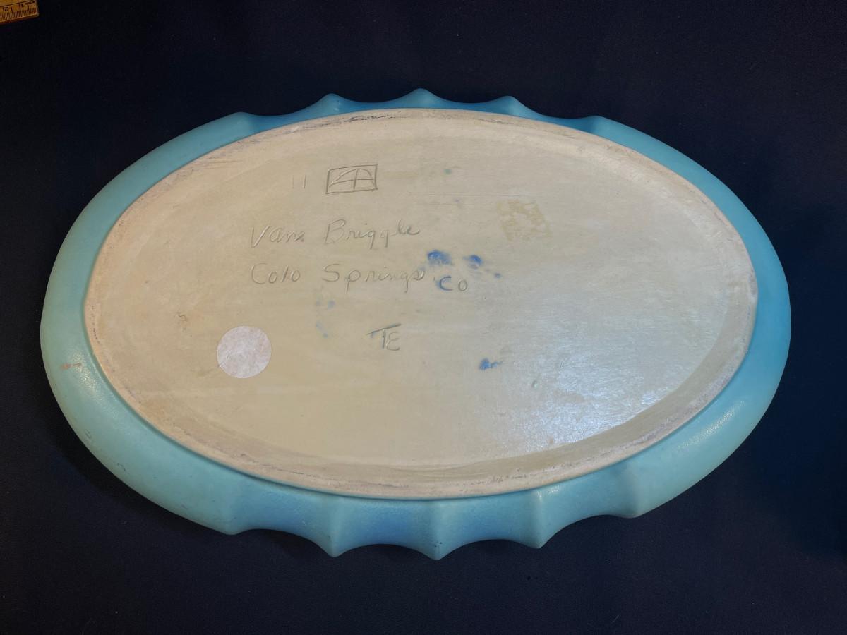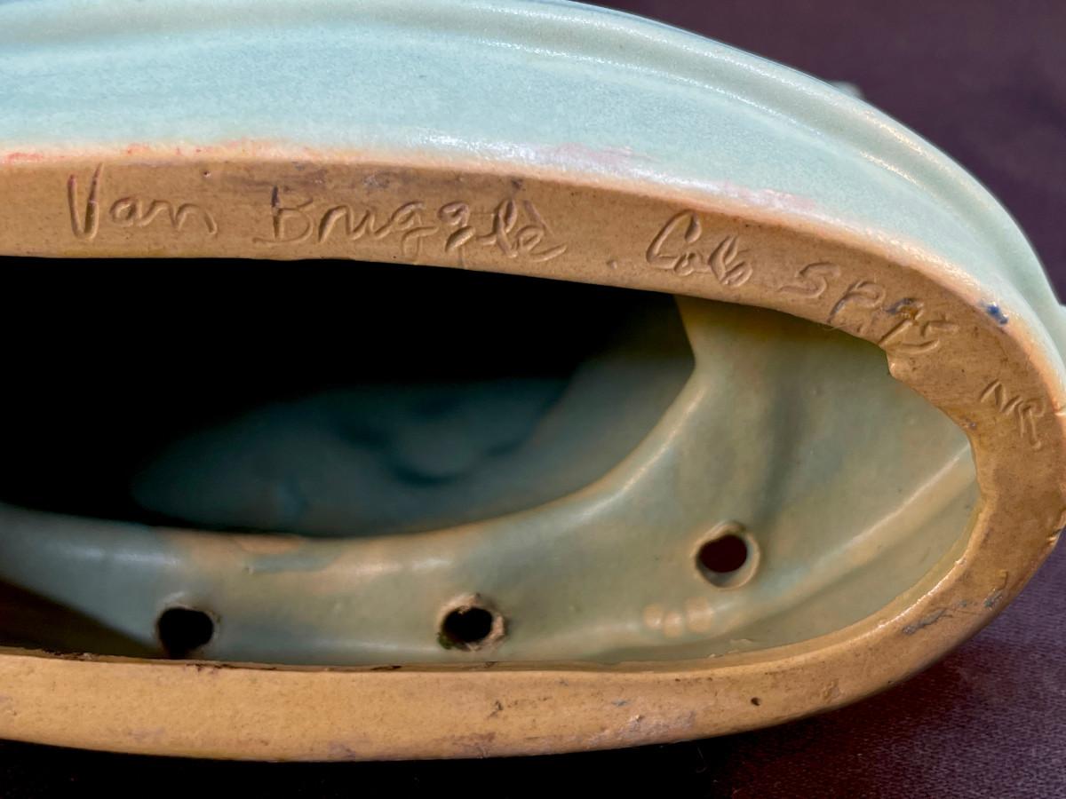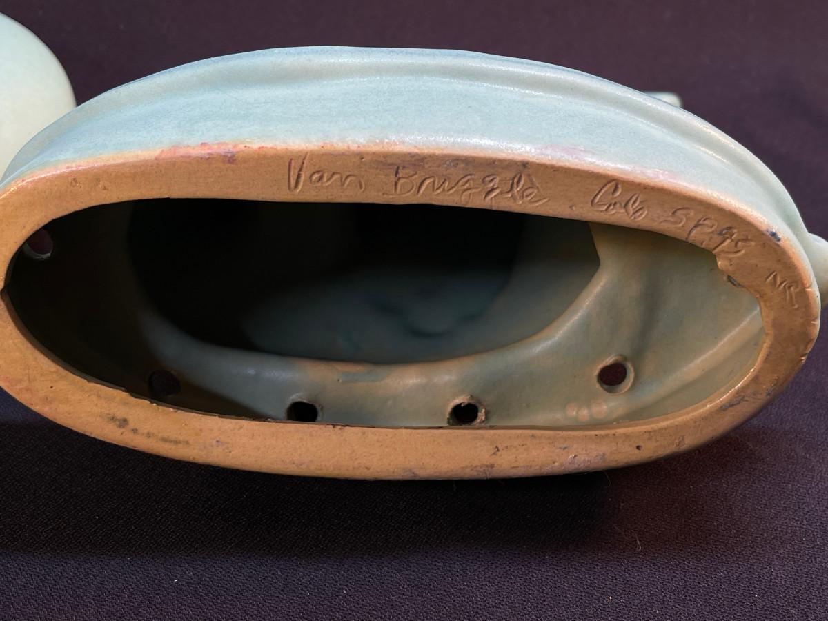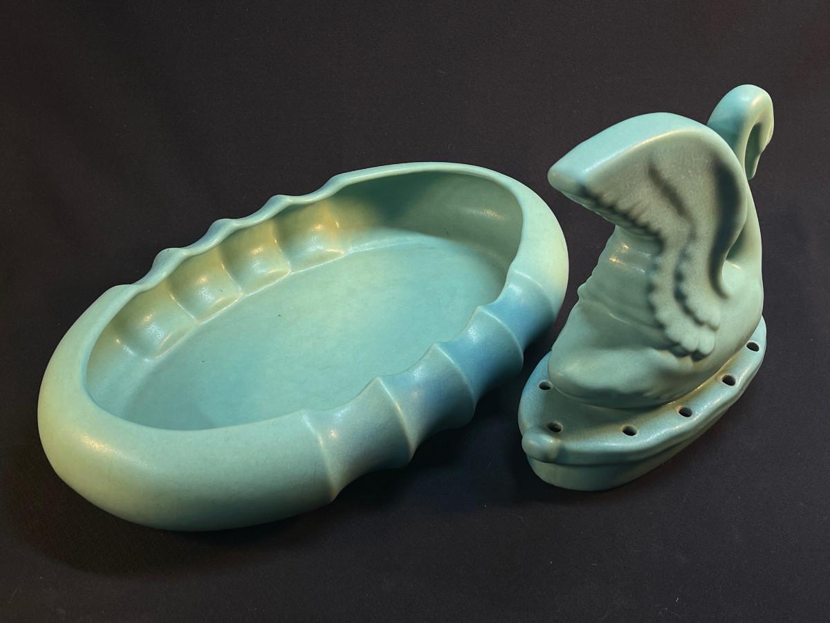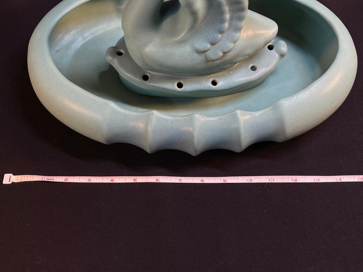 The subject item is a classic American, grand two-piece console piece by Van Briggle - the center flower frog being a large swan measuring about 8 1/2in. high by about 8in. wide while the bowl itself measures about 14in. in. long and just shy of 10in. wide. Both pieces look to be in perfect condition finished in a blue green glaze. Both pieces are signed a full signature on the bottom of the bowl with a mark on the swan as well, if you collect Van Briggle it's a great set and nice to still find the two examples together as they were purchased.