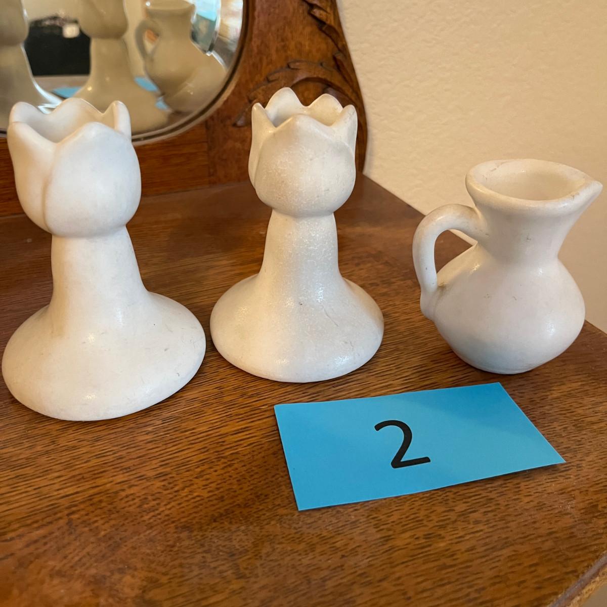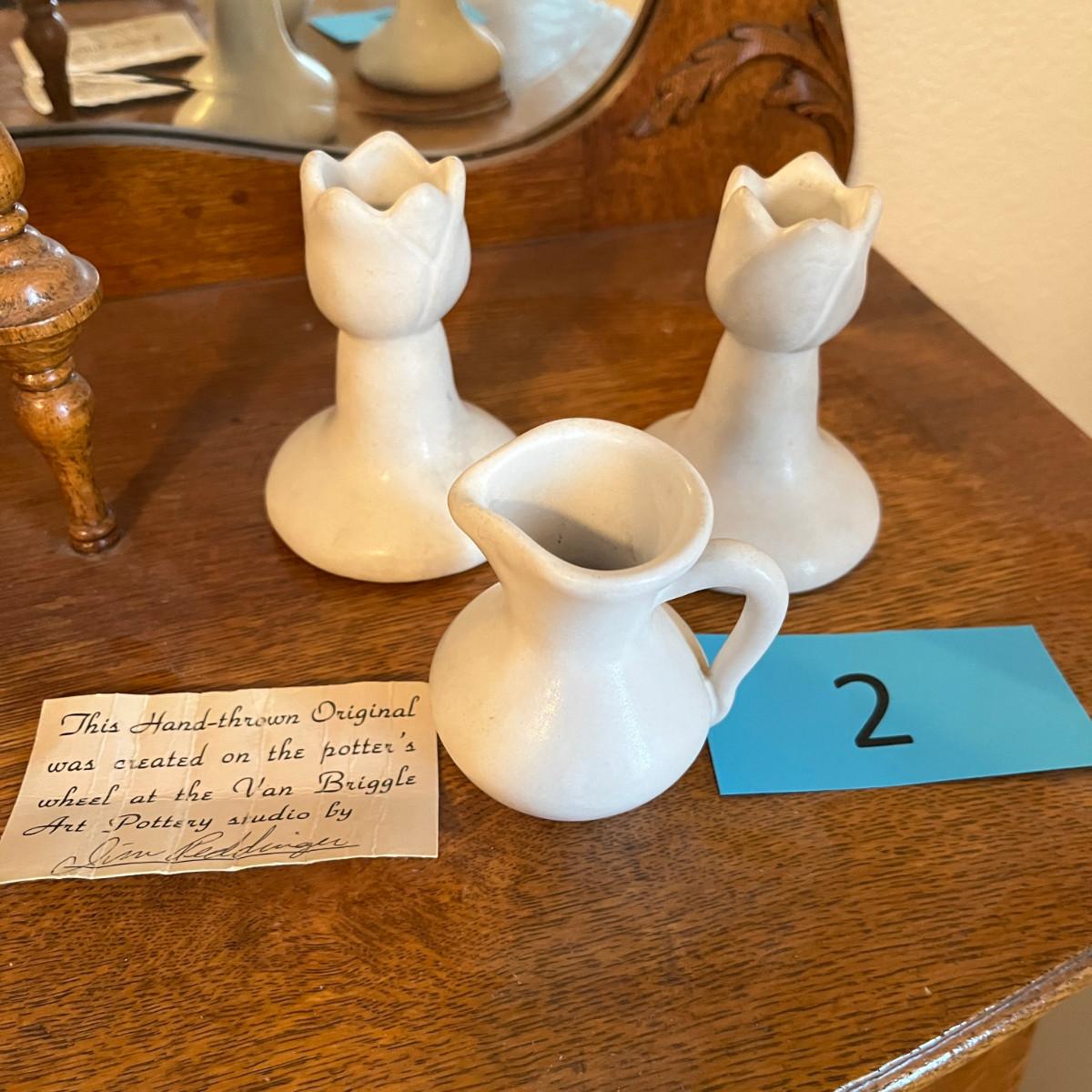 Van Briggle White matte glaze grouping. Pitcher is an artist original!