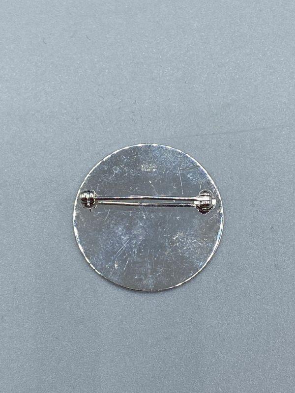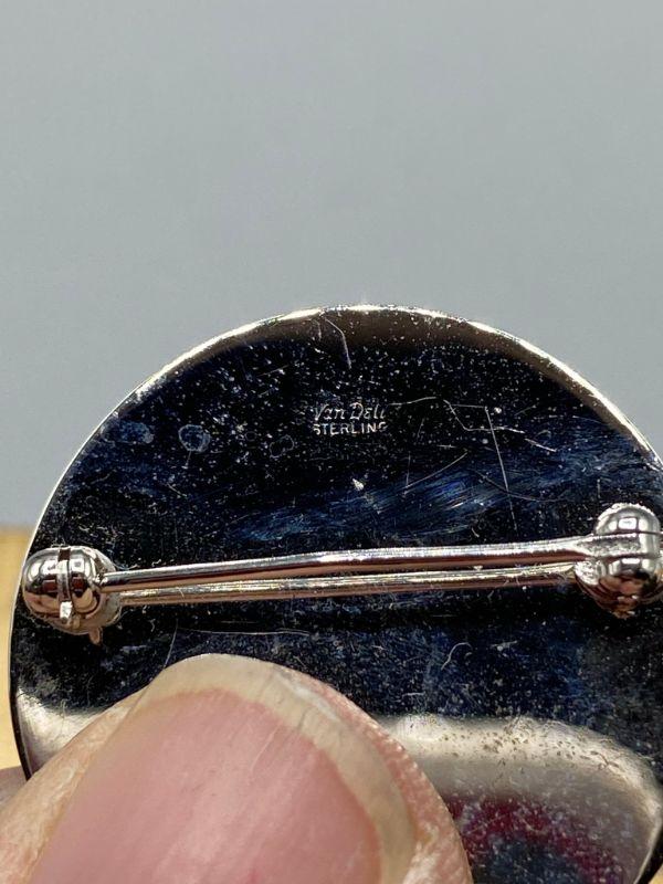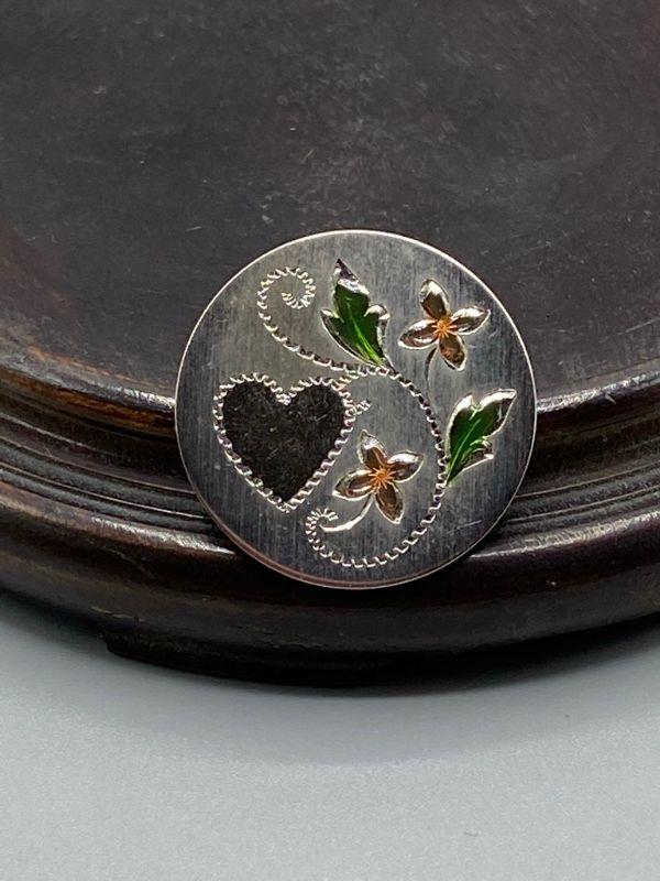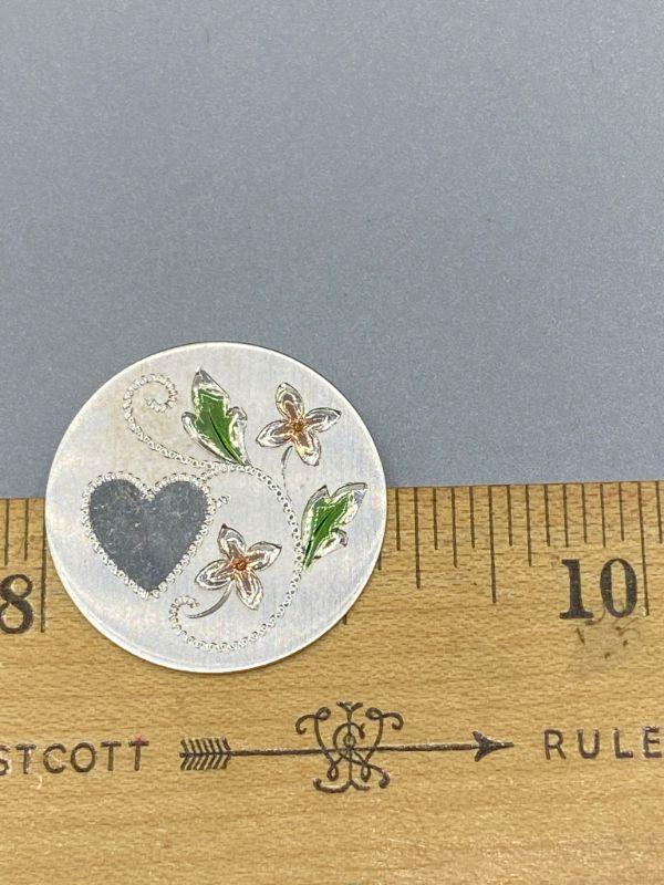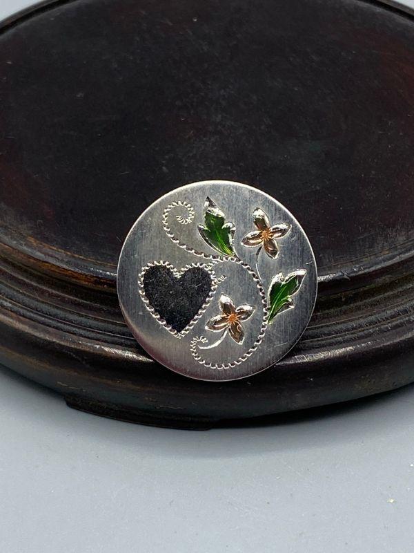 Vintage sterling Van Dell pin. Round with a heart and flower pattern. Flowers and leaves have been enamels. Heart is shiny will the rest of the pin is matte. A little over 1" size. Stamped on the back.