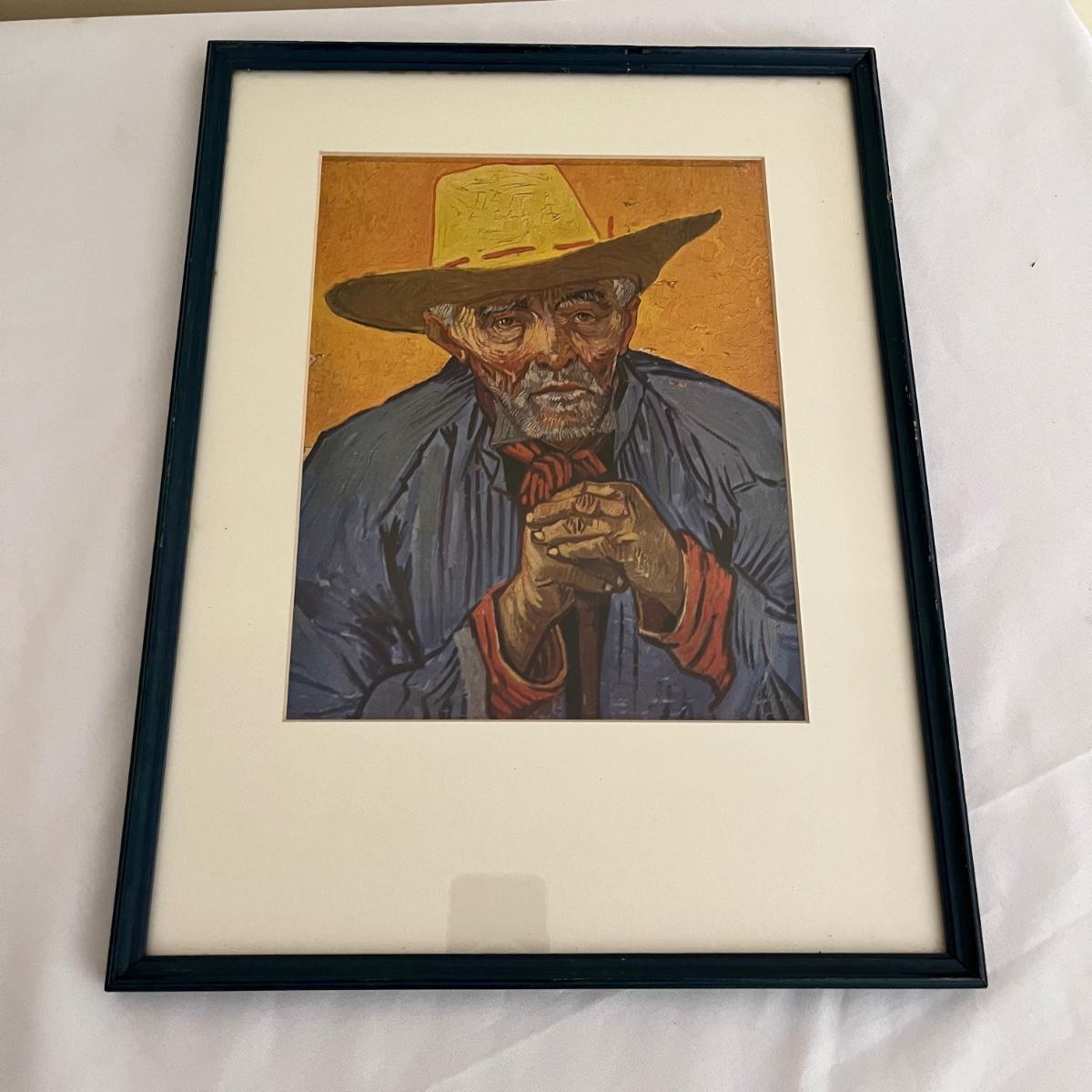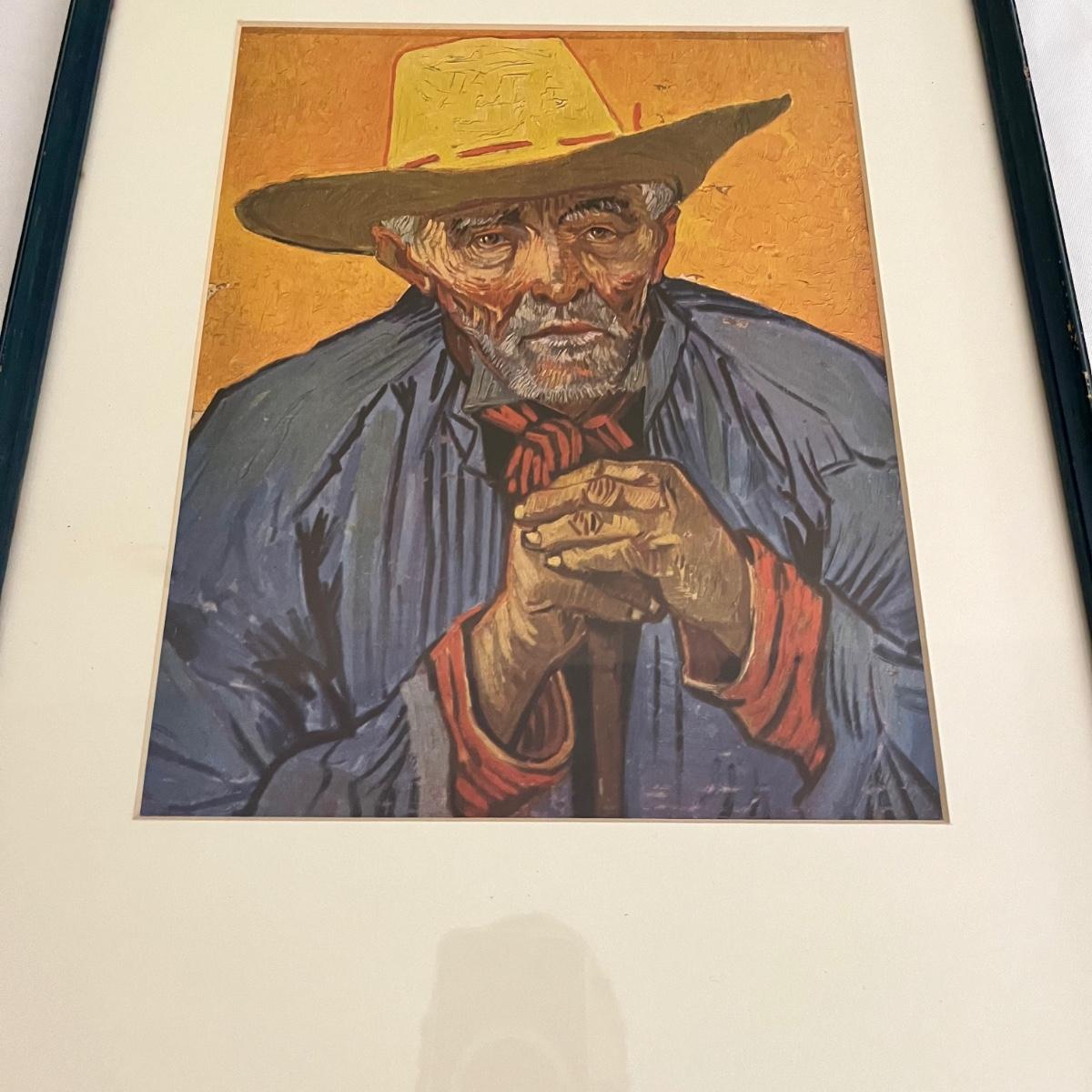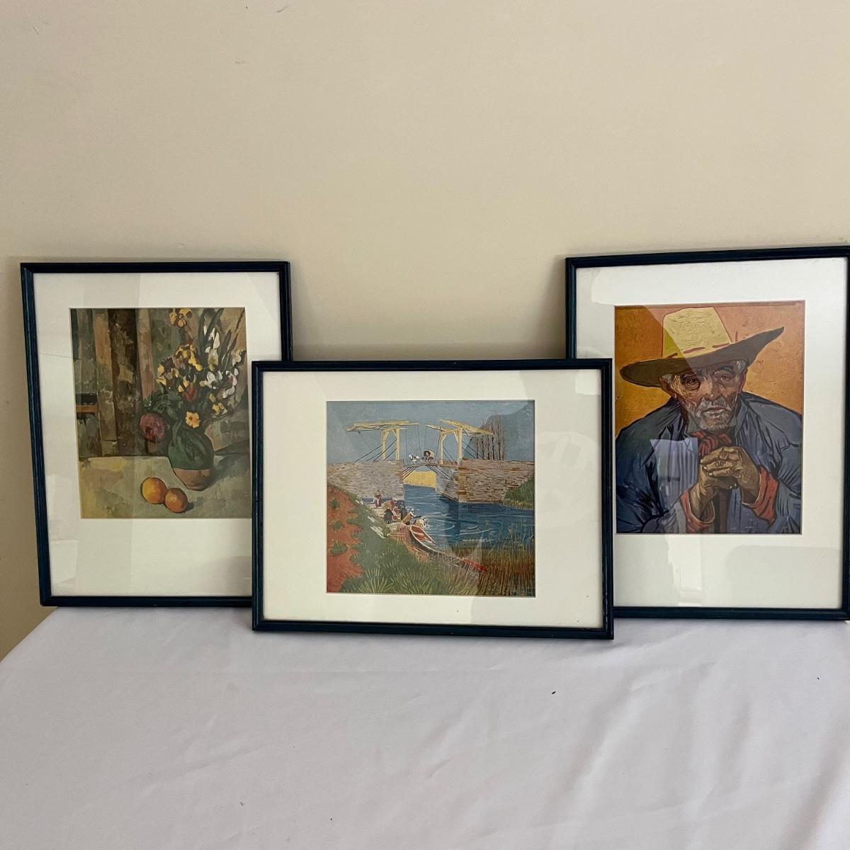 Lot includes three wooden framed and matted art prints. Two are by Vincent Van Gogh and one by Paul Cèzanne. Frames measure 12” x 16”.