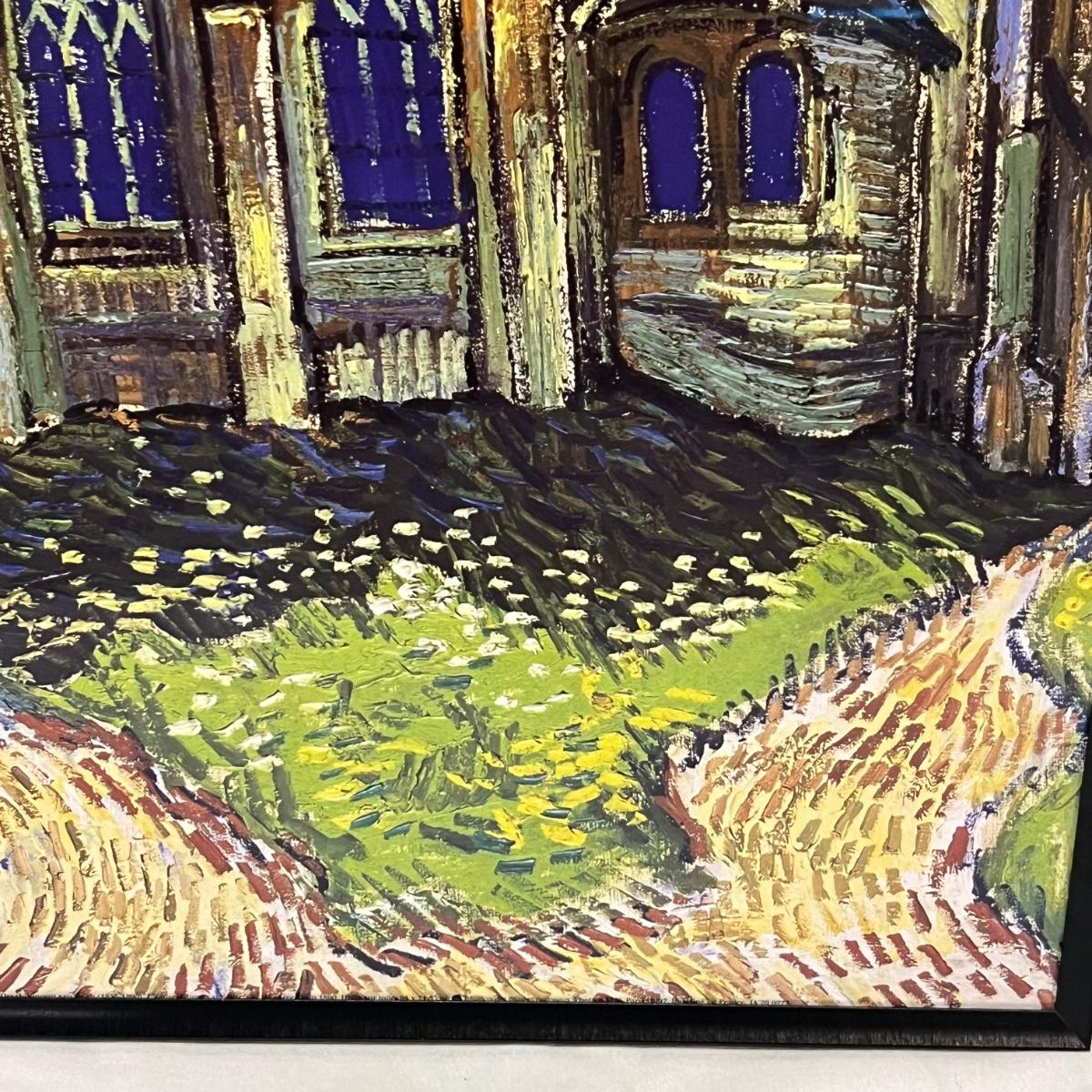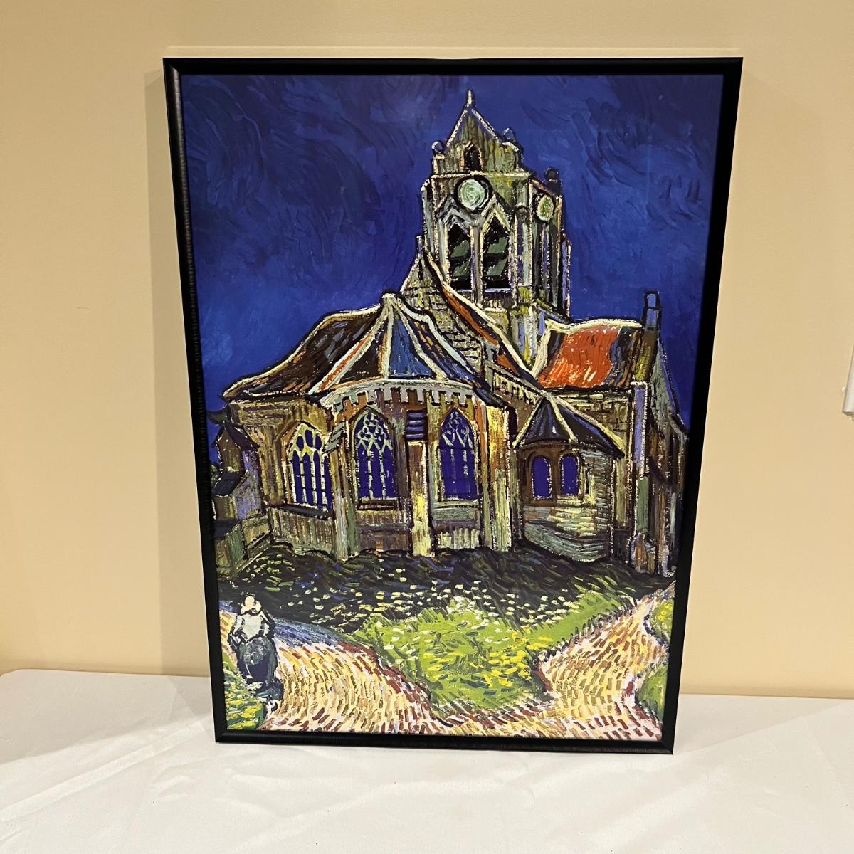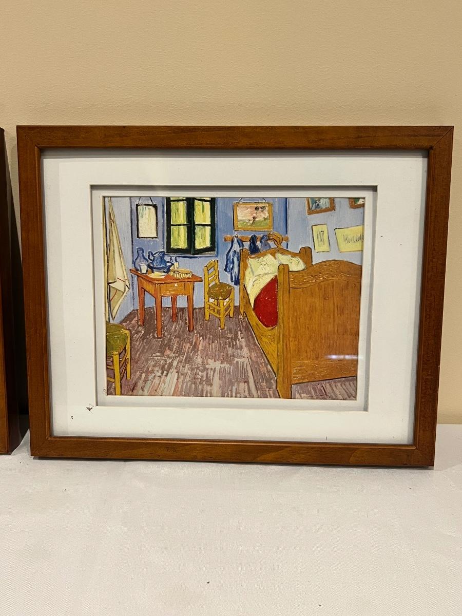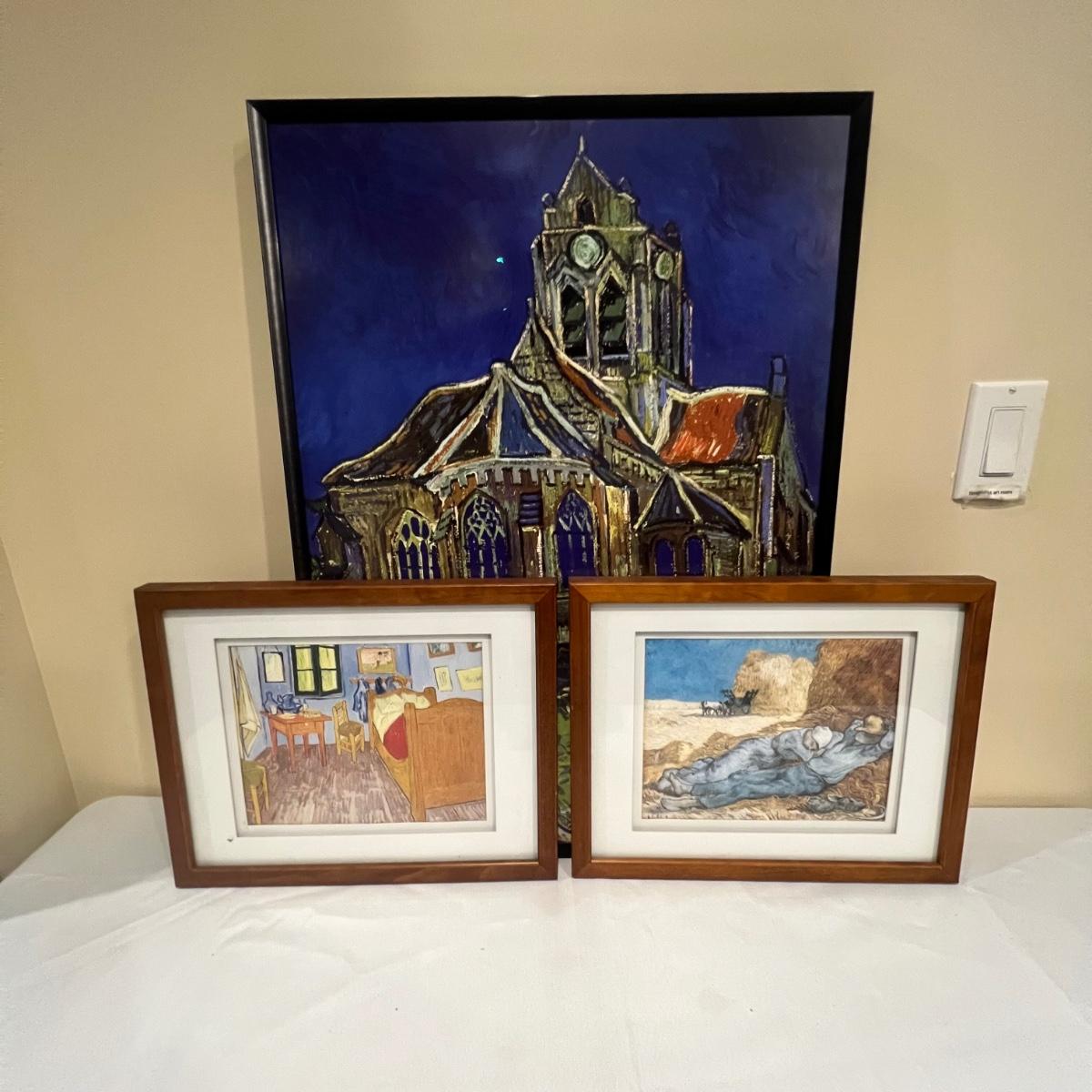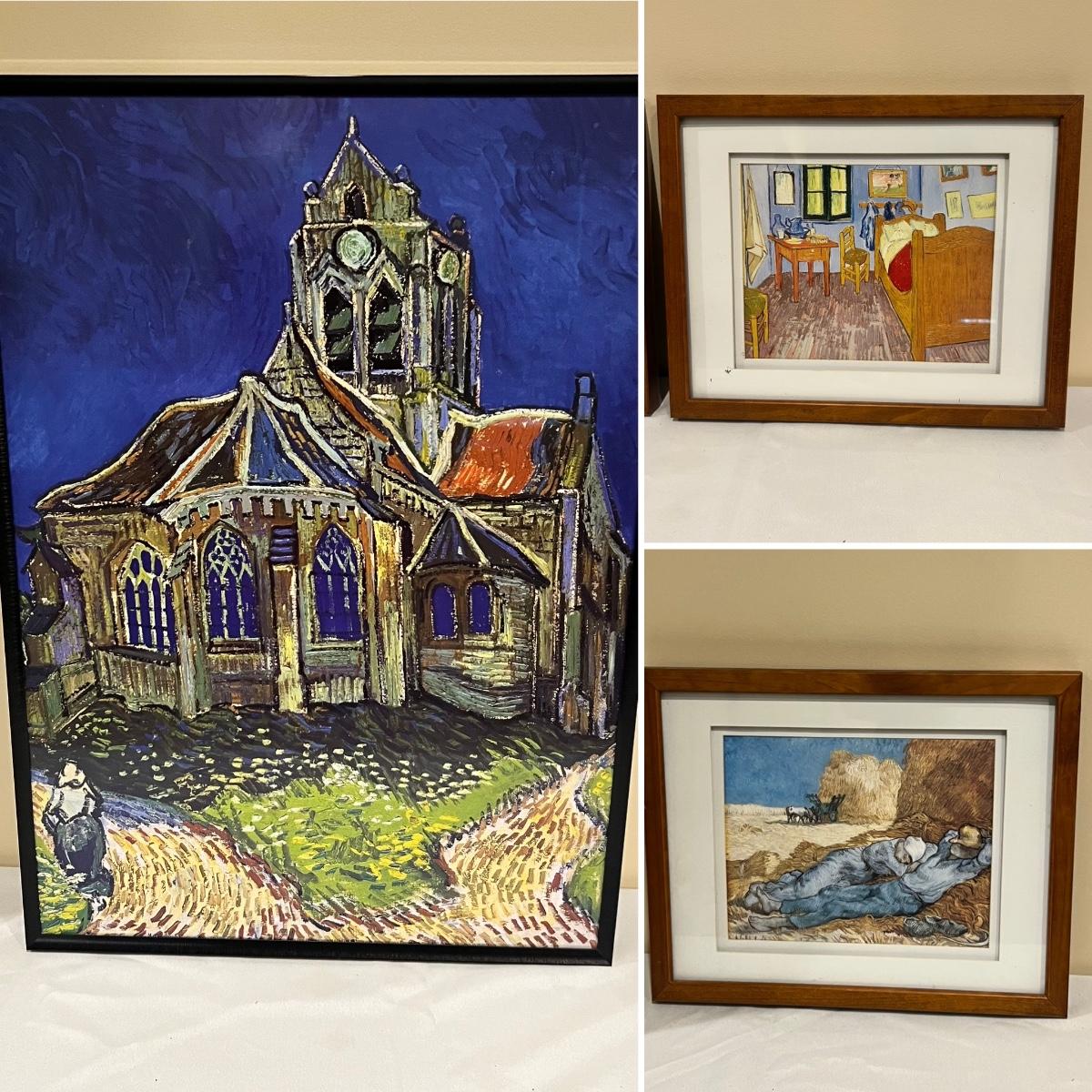 Three framed Van Gogh prints. All are under glass. The two smaller ones are in matching faux wood frames. The larger one is in a black metal frame that measures 20” x 28”H.