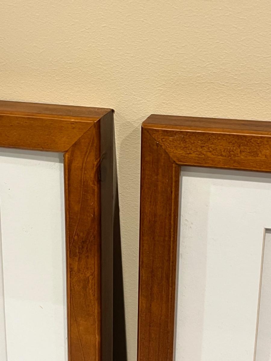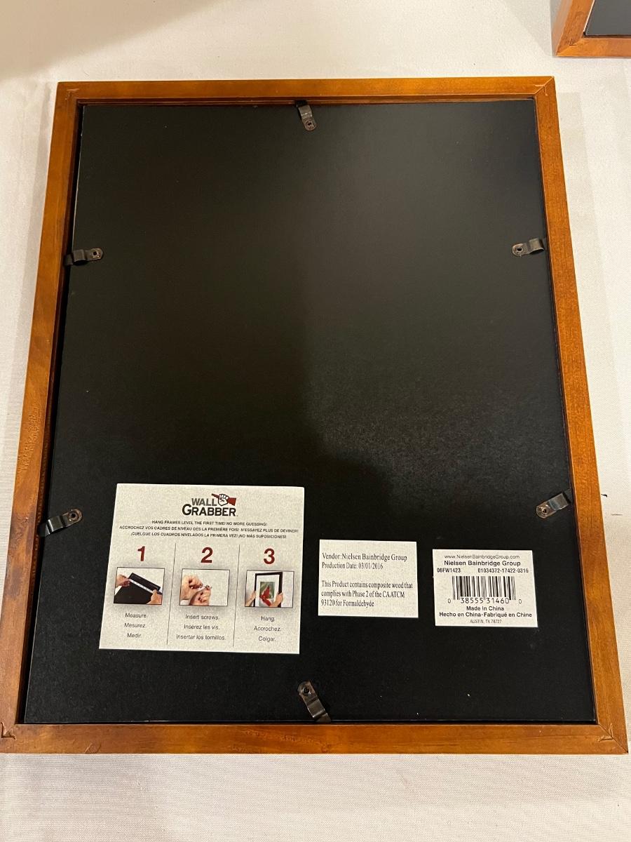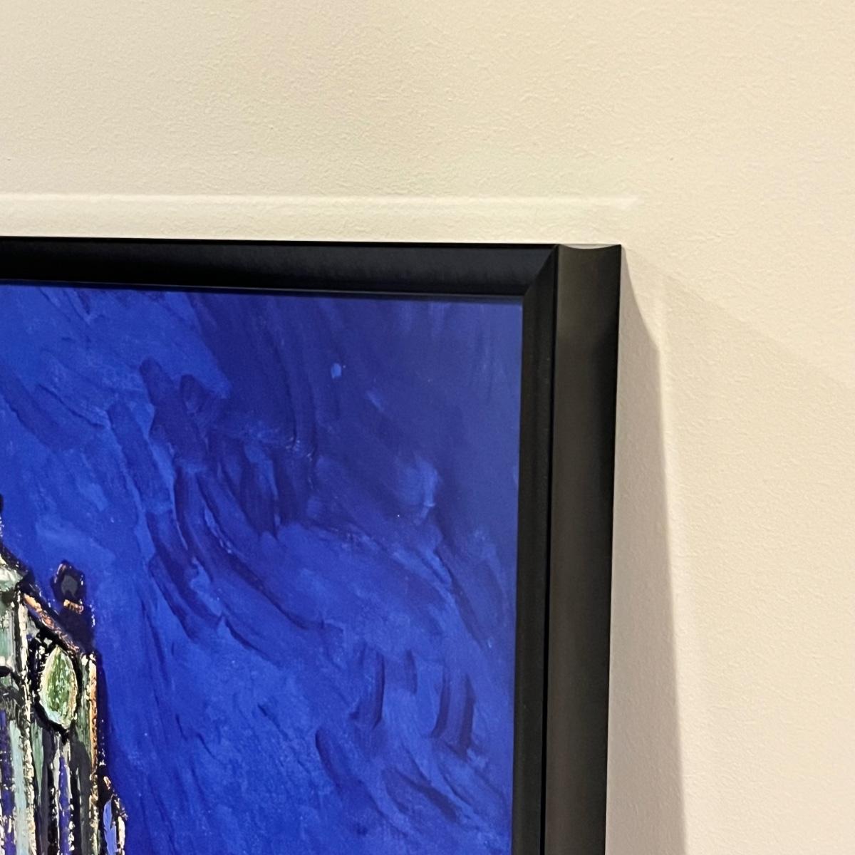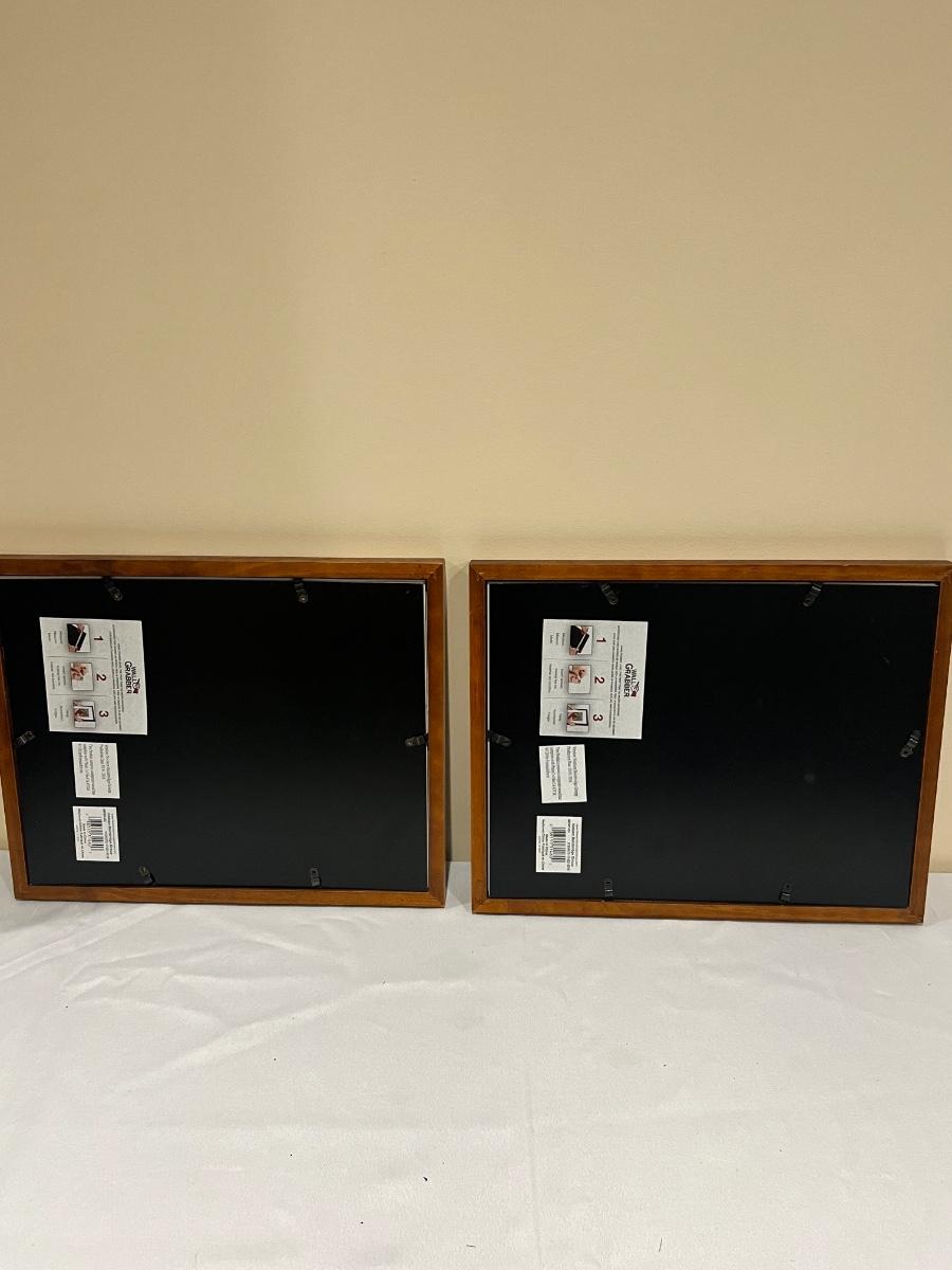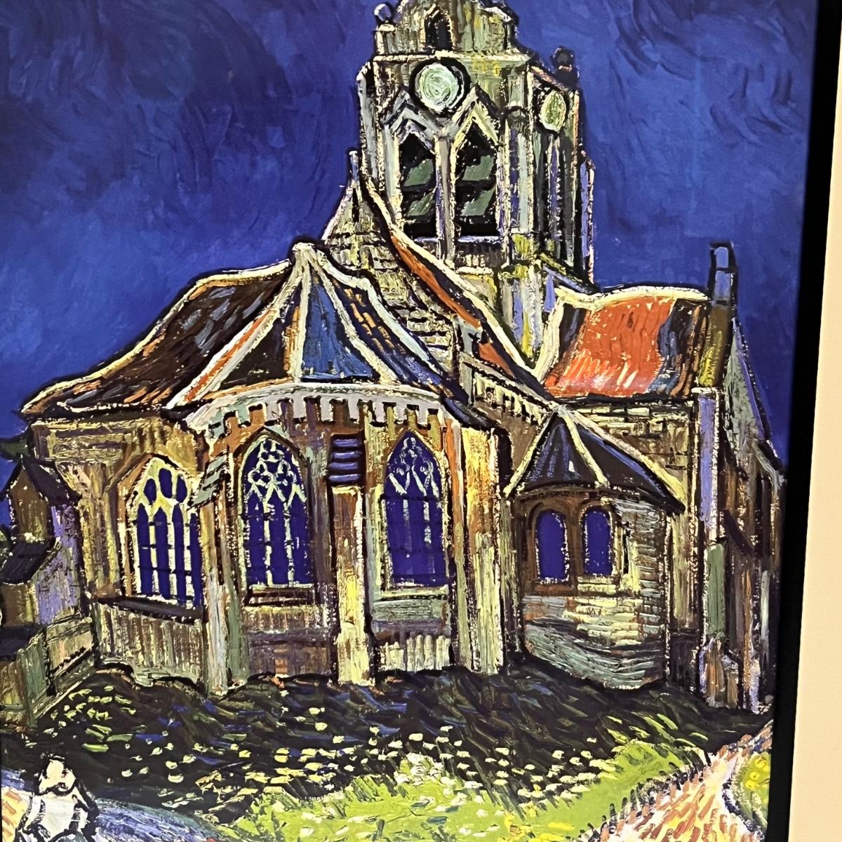 Three framed Van Gogh prints. All are under glass. The two smaller ones are in matching faux wood frames. The larger one is in a black metal frame that measures 20” x 28”H.