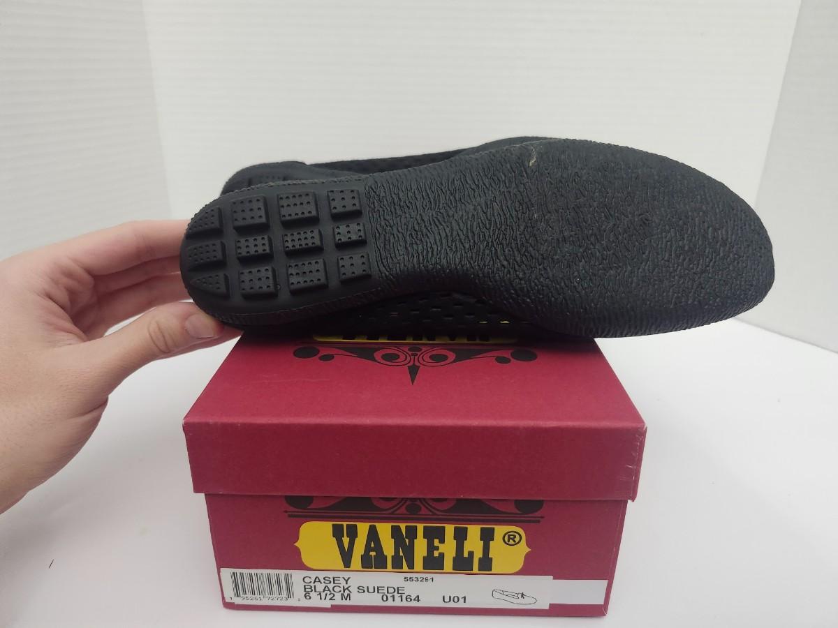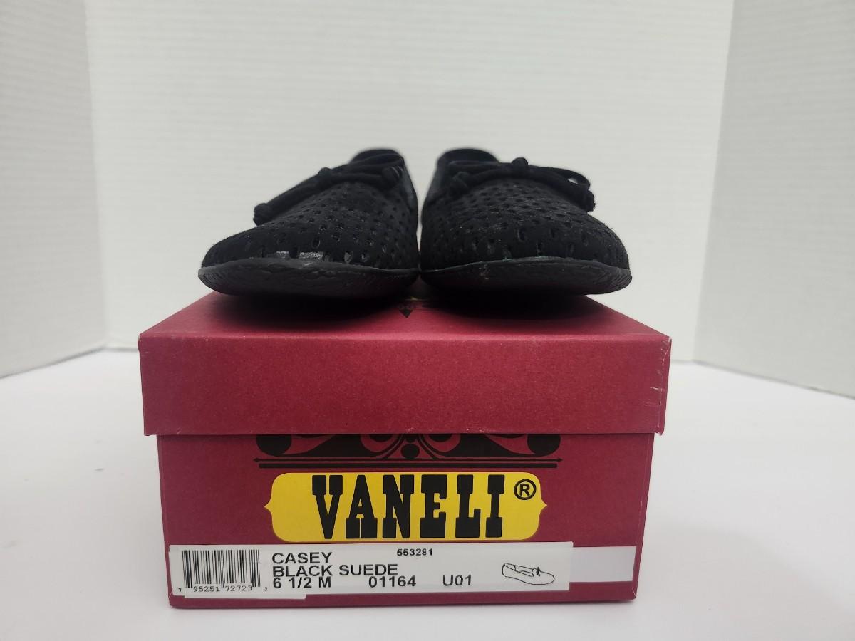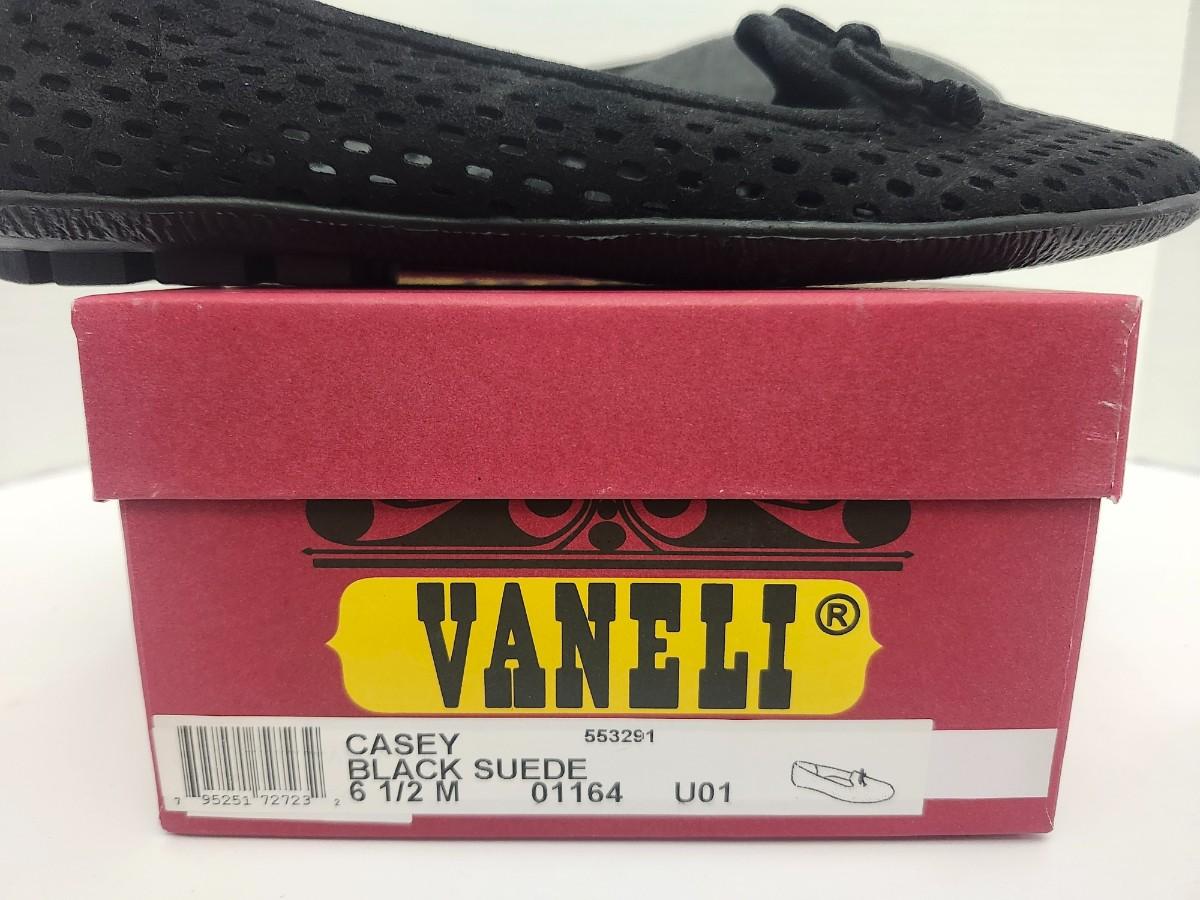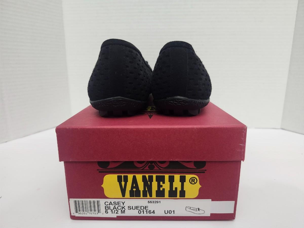 Vaneli Casey women’s slip on loafers in black suede with perforated upper and bow detail at the vamp. Labeled Casey Black Suede size 6 1/2 M on original Vaneli shoe box. Low profile loafer style with flexible sole and textured outsole visible. Includes original Vaneli box as shown. Description based strictly on visible labels and photographs only.