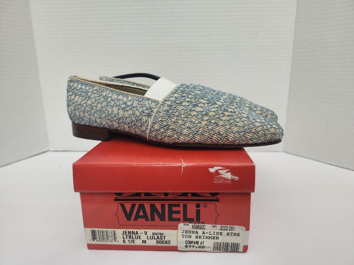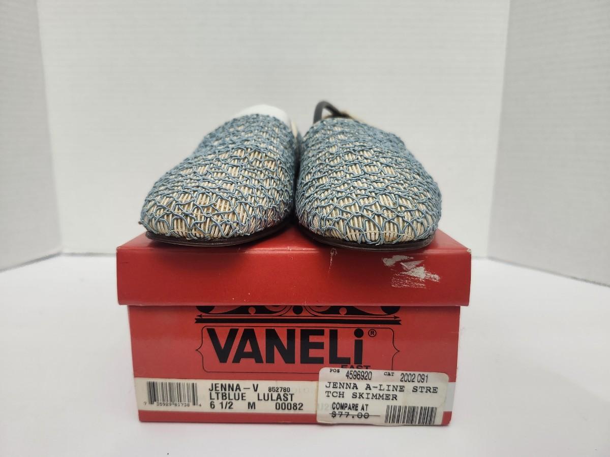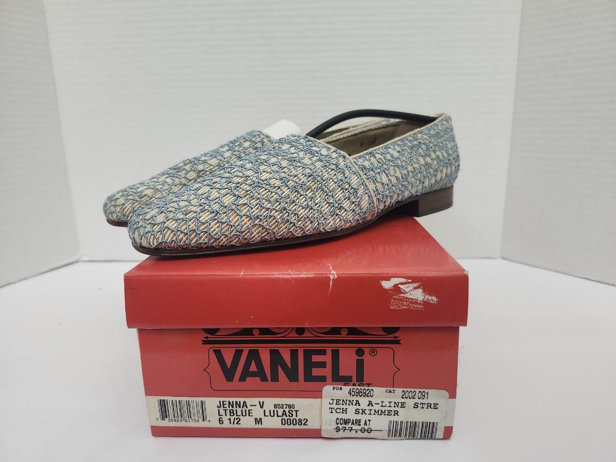 Vaneli Jenna V women’s skimmer style flats in light blue Lulast woven material with low stacked heel and slip on design. Marked size 6 1/2 M on original Vaneli box. Box label reads Jenna V LTBLUE LULAST and Jenna A Line Stretch Skimmer with compare at pricing noted. Includes original branded box as shown. All details stated based solely on visible labels and photographs.