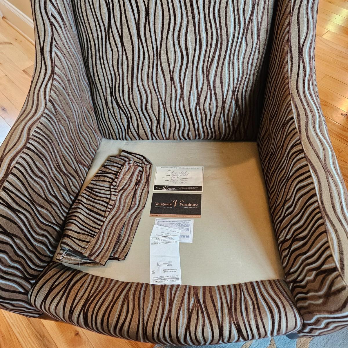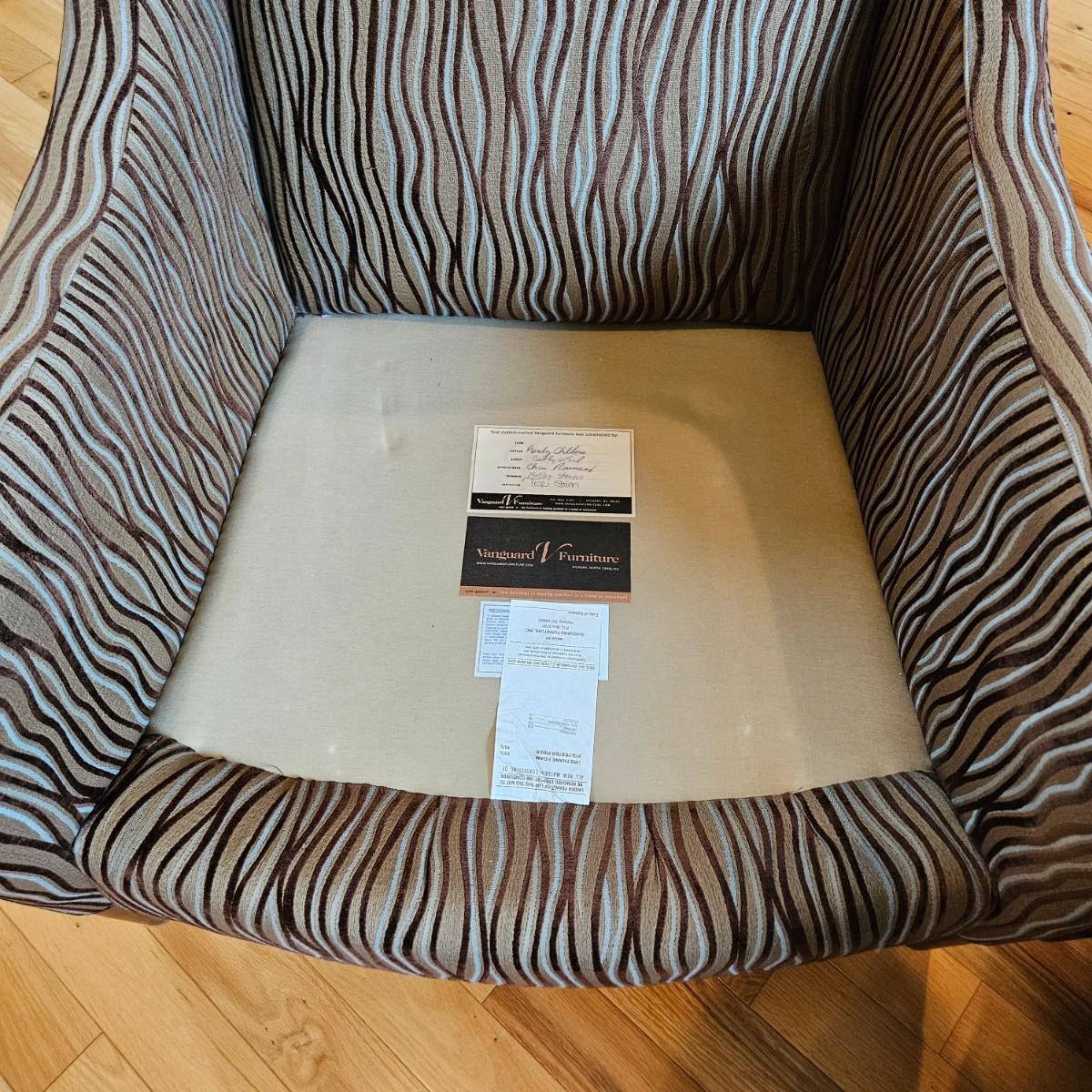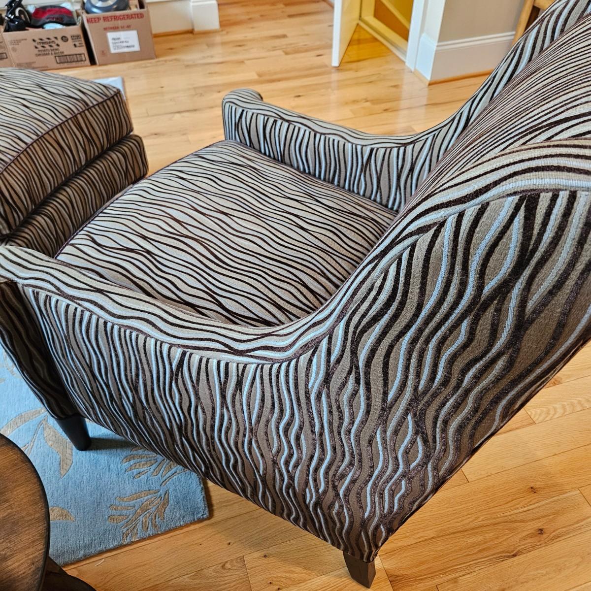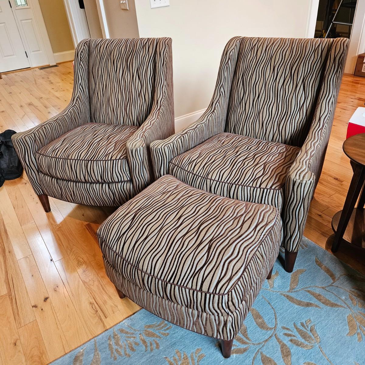 A pair of Vanguard chairs with a modern upholstery pattern. Each chair measures approximately 33" x 36" x 37"H with a seat height of 19". This lot also includes a matching footstool. Local pickup only. Winning bidder must bring assistance to help move and load this item due to its weight and/or size.