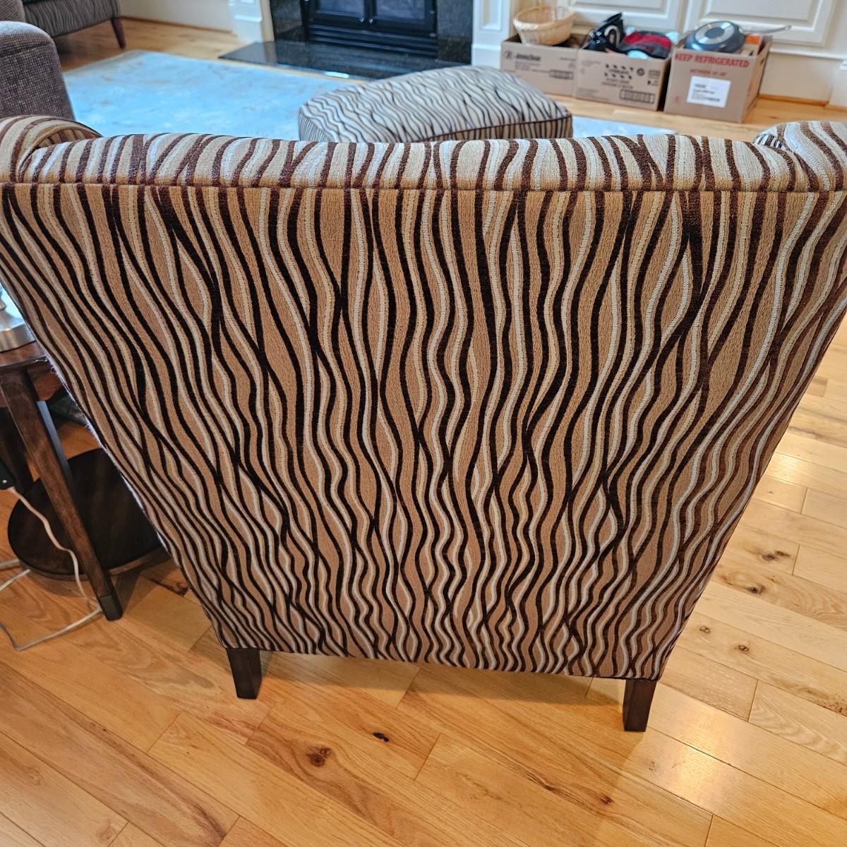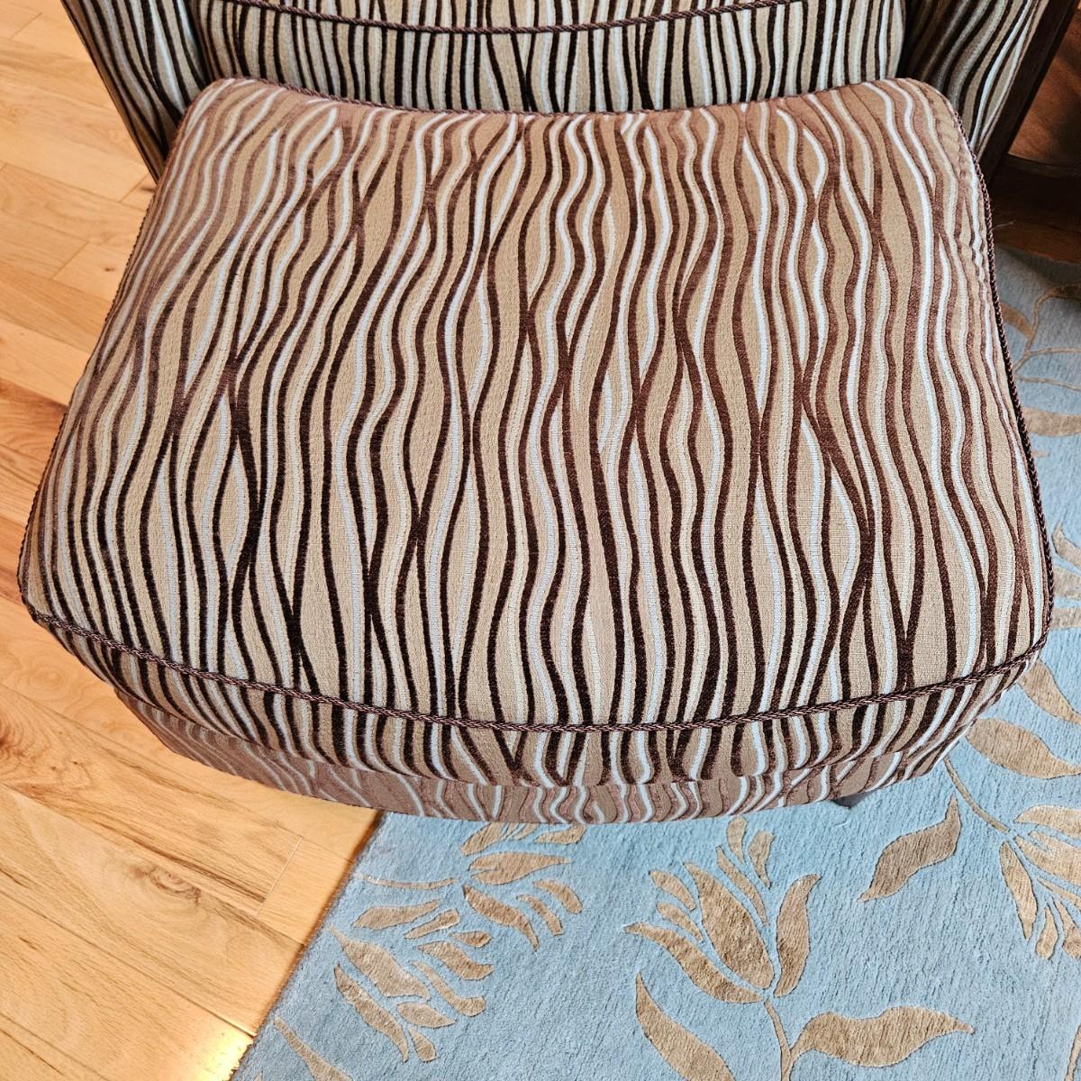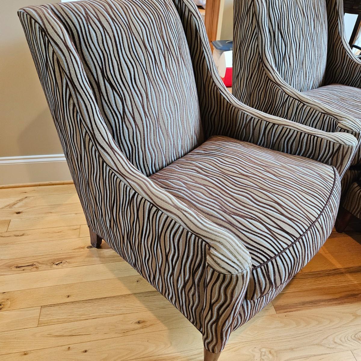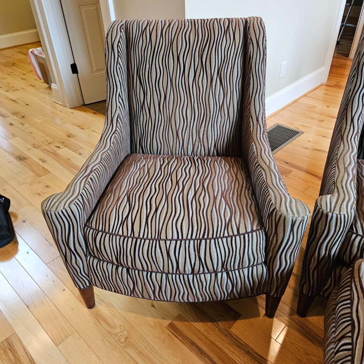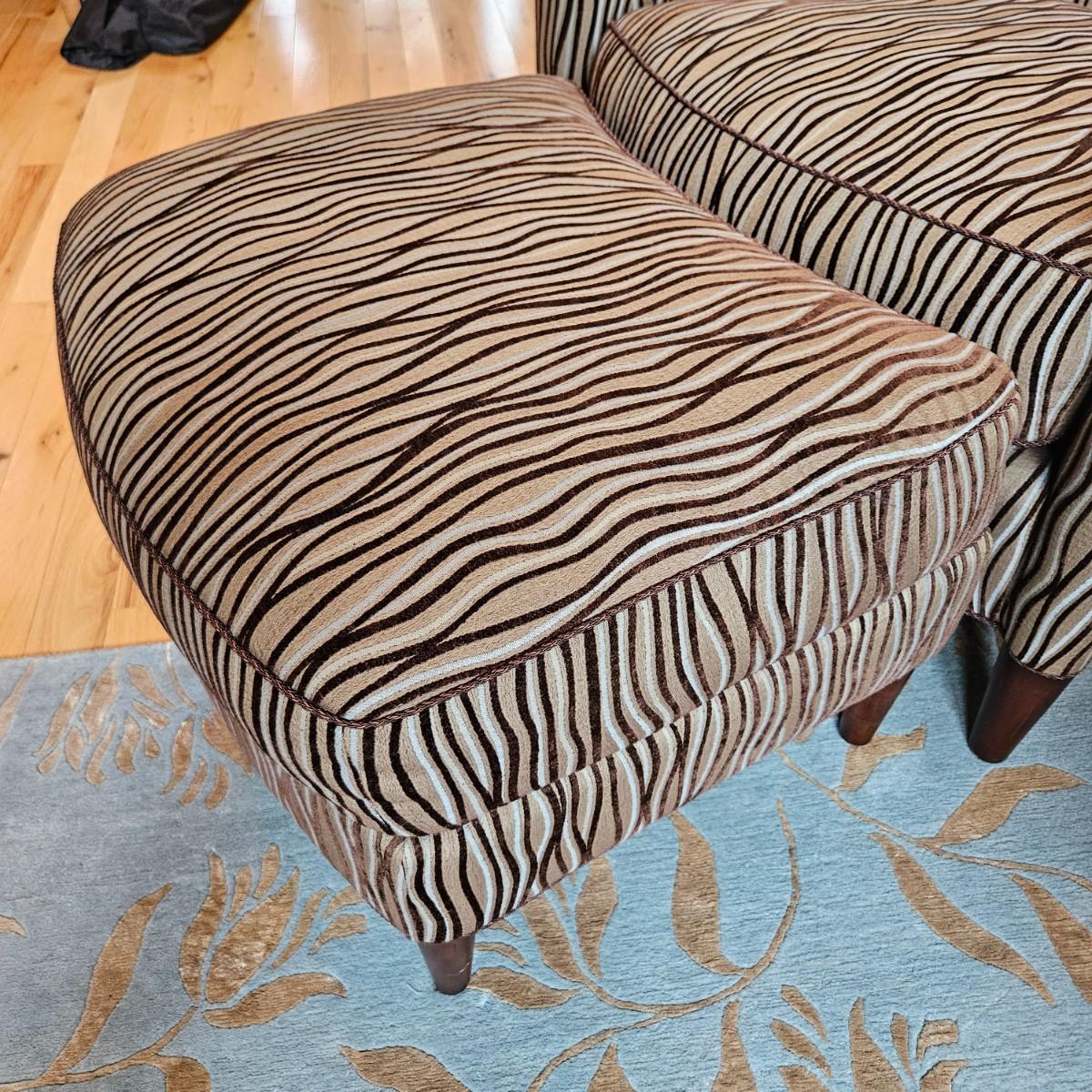 A pair of Vanguard chairs with a modern upholstery pattern. Each chair measures approximately 33" x 36" x 37"H with a seat height of 19". This lot also includes a matching footstool. Local pickup only. Winning bidder must bring assistance to help move and load this item due to its weight and/or size.