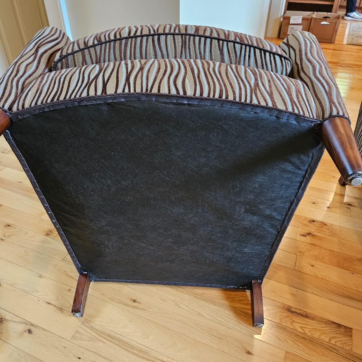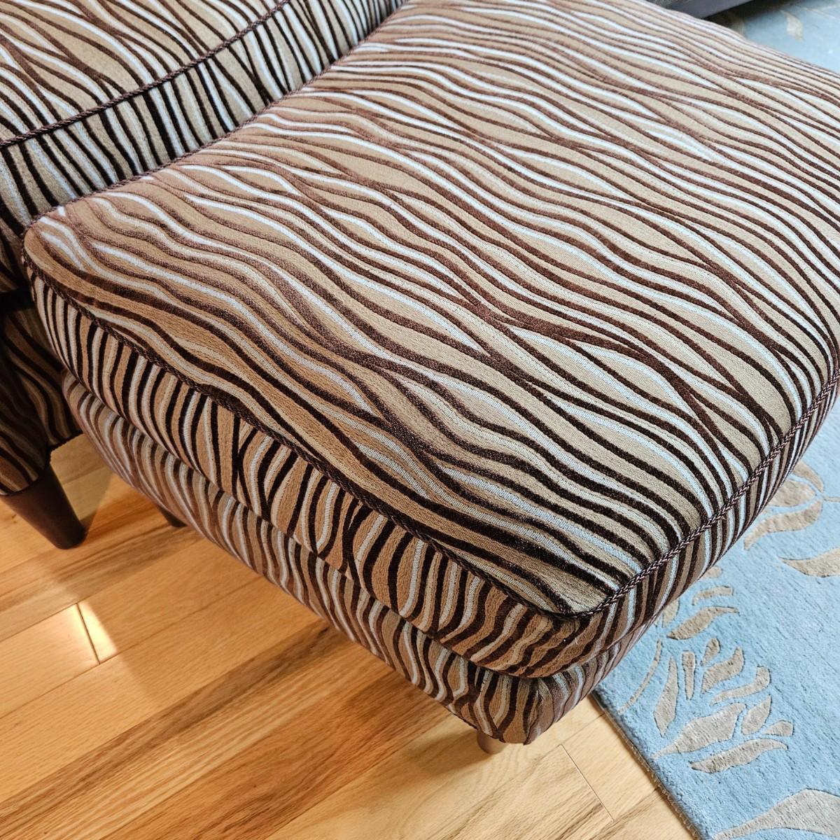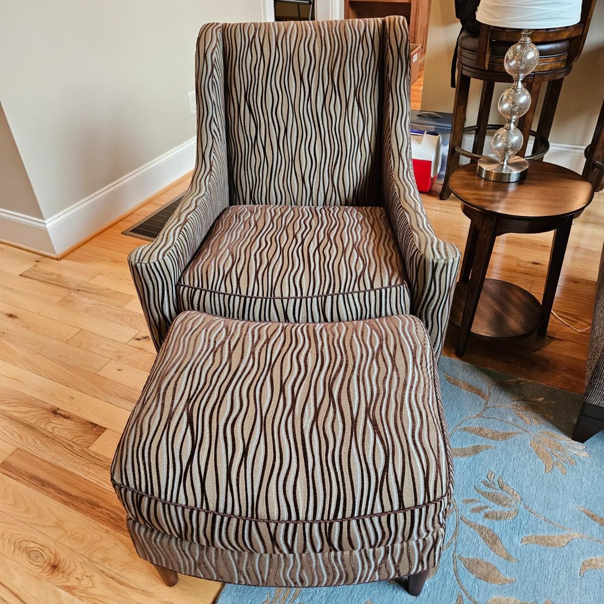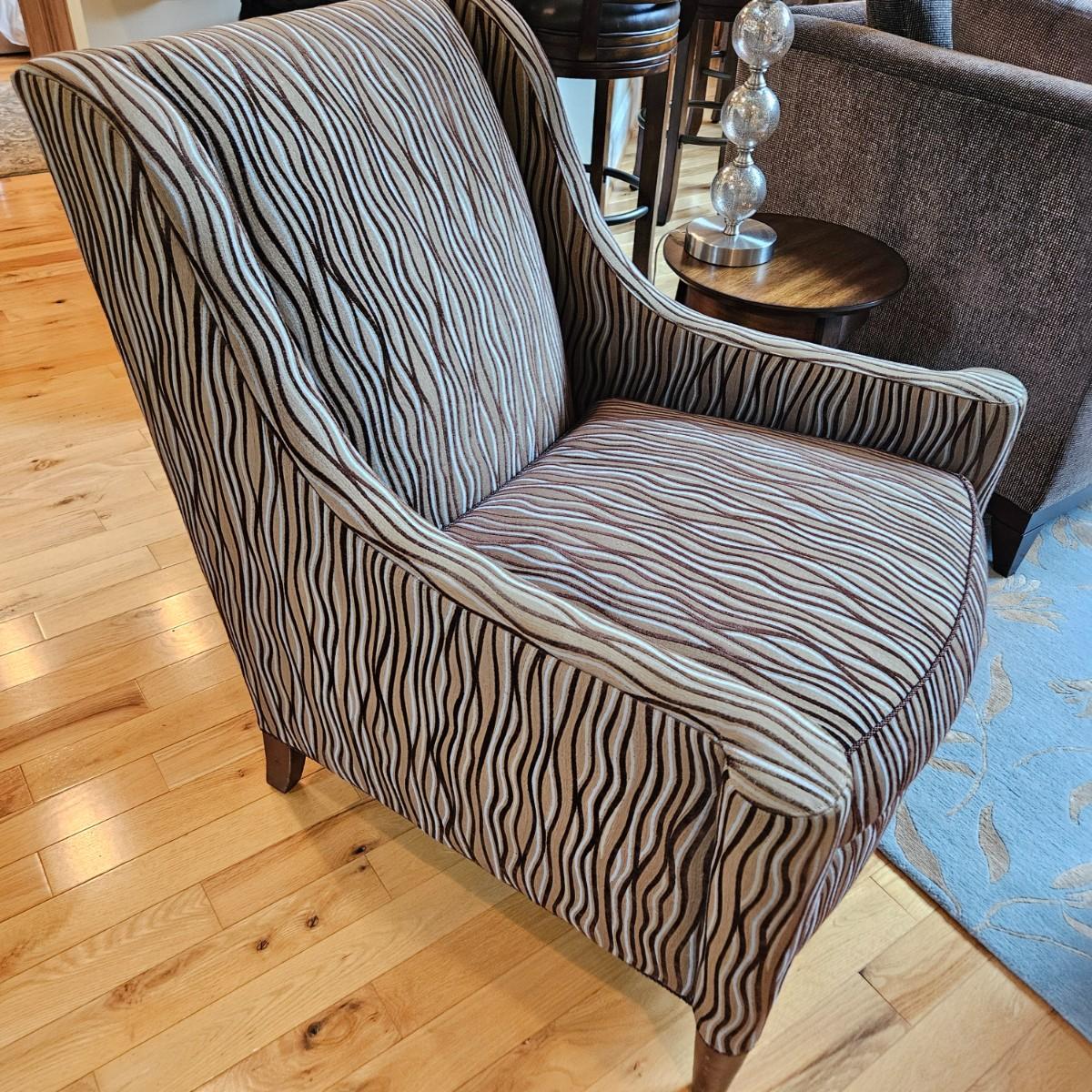 A pair of Vanguard chairs with a modern upholstery pattern. Each chair measures approximately 33" x 36" x 37"H with a seat height of 19". This lot also includes a matching footstool. Local pickup only. Winning bidder must bring assistance to help move and load this item due to its weight and/or size.