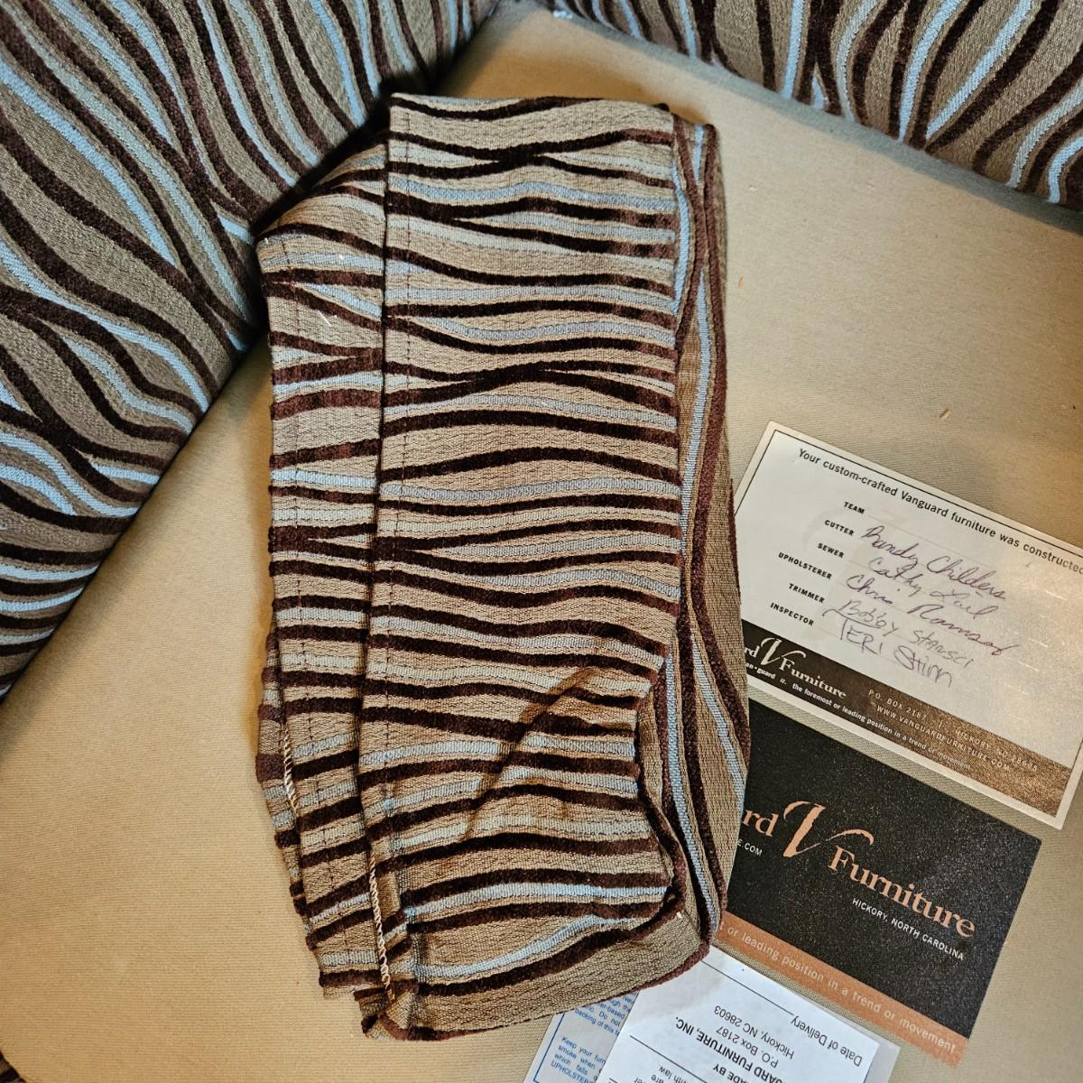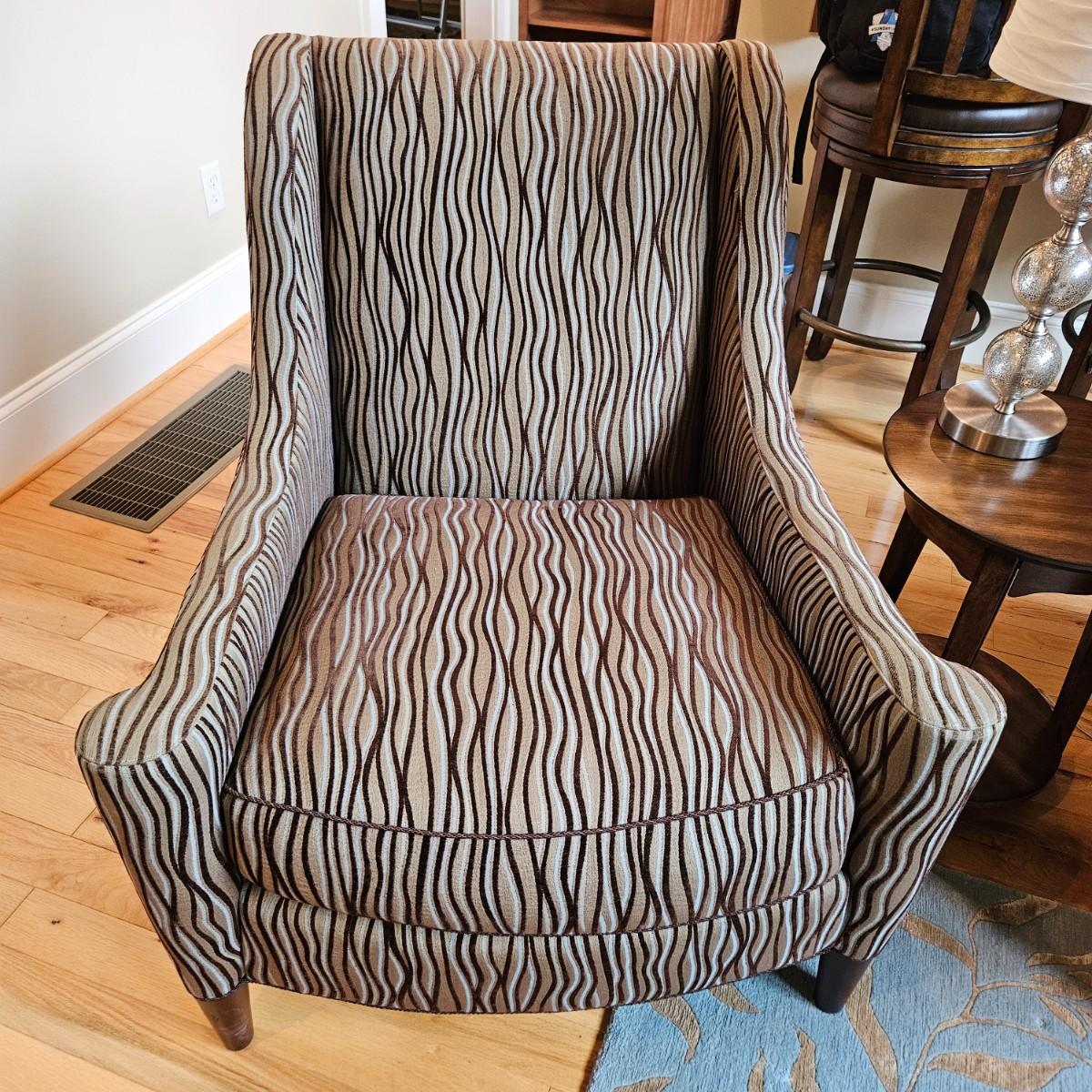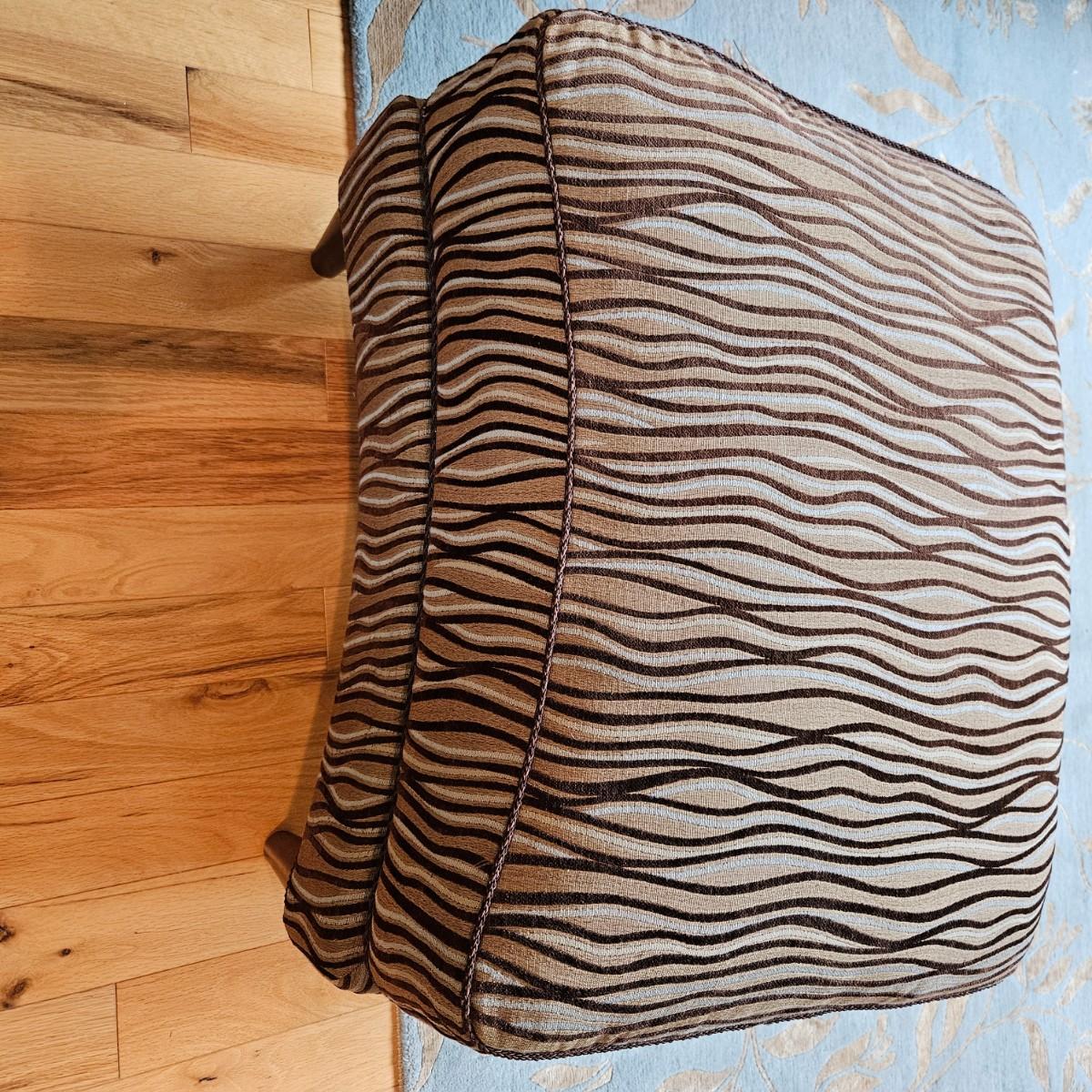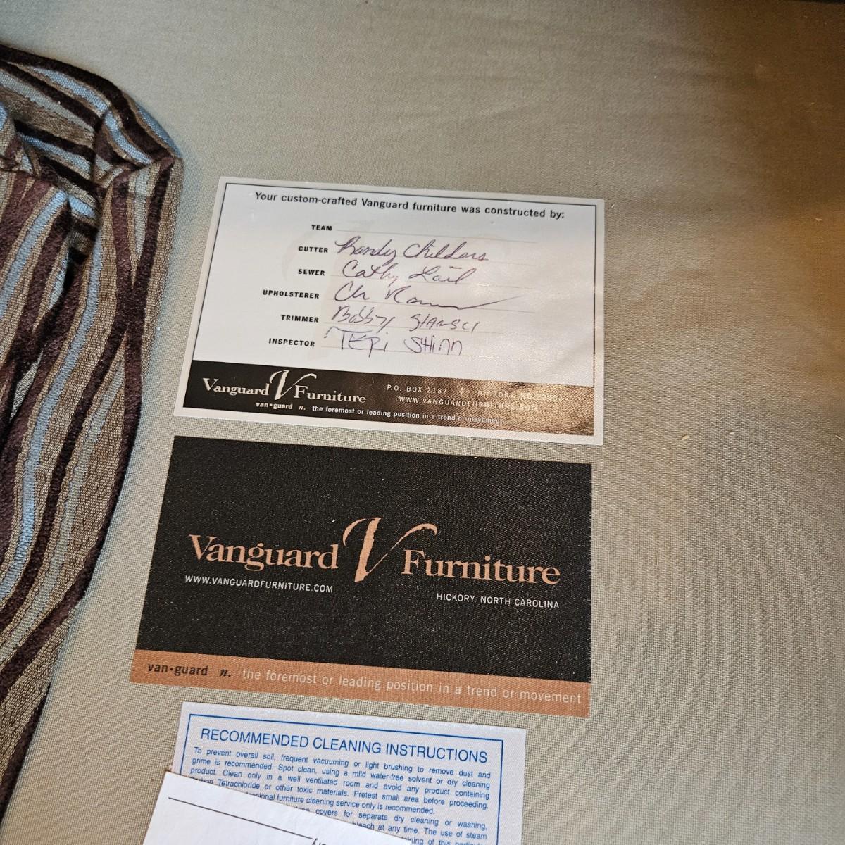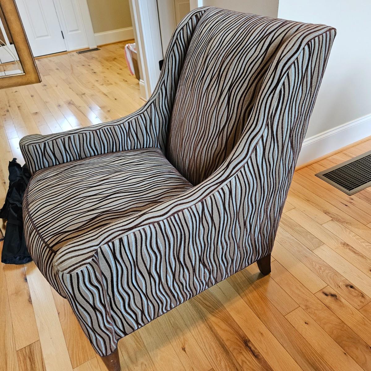 A pair of Vanguard chairs with a modern upholstery pattern. Each chair measures approximately 33" x 36" x 37"H with a seat height of 19". This lot also includes a matching footstool. Local pickup only. Winning bidder must bring assistance to help move and load this item due to its weight and/or size.