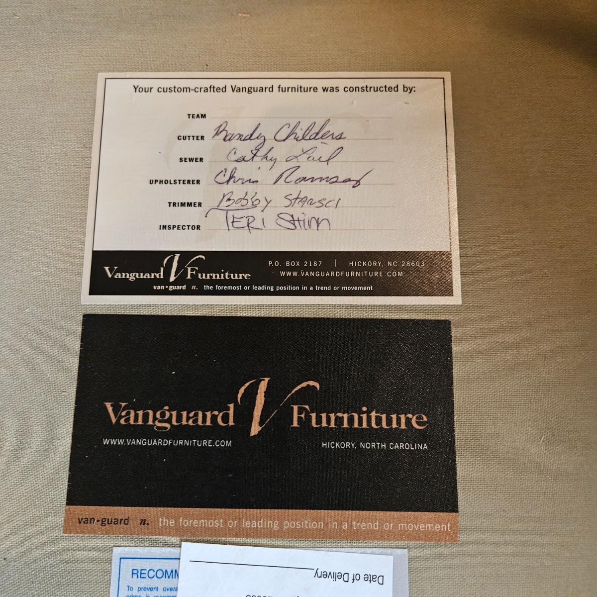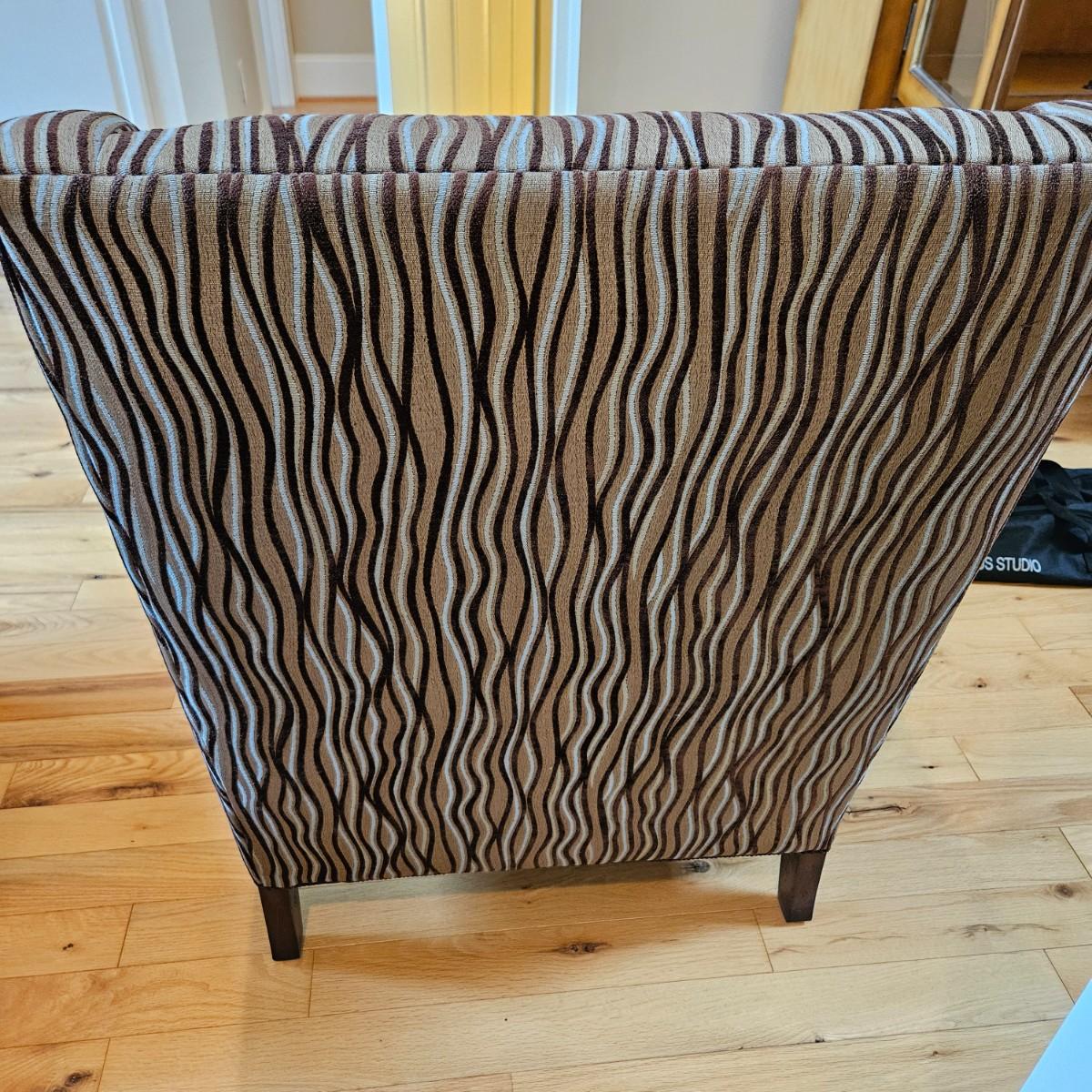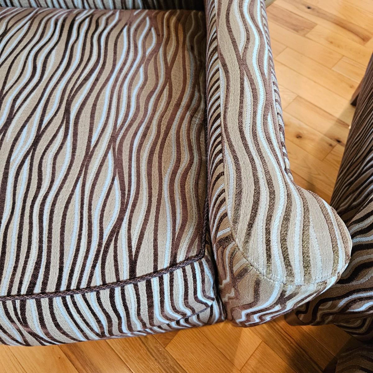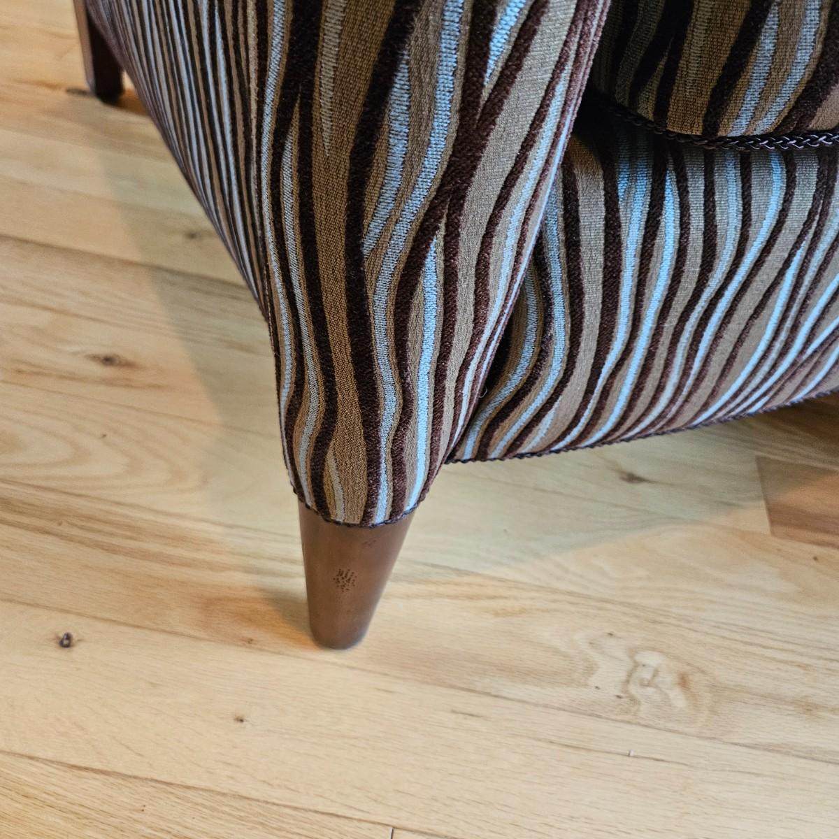A pair of Vanguard chairs with a modern upholstery pattern. Each chair measures approximately 33" x 36" x 37"H with a seat height of 19". This lot also includes a matching footstool. Local pickup only. Winning bidder must bring assistance to help move and load this item due to its weight and/or size.