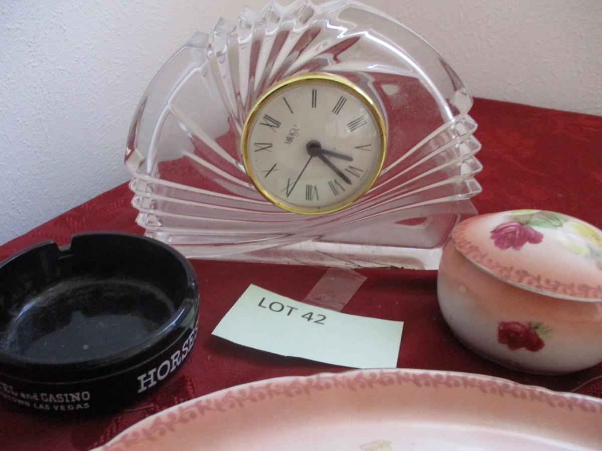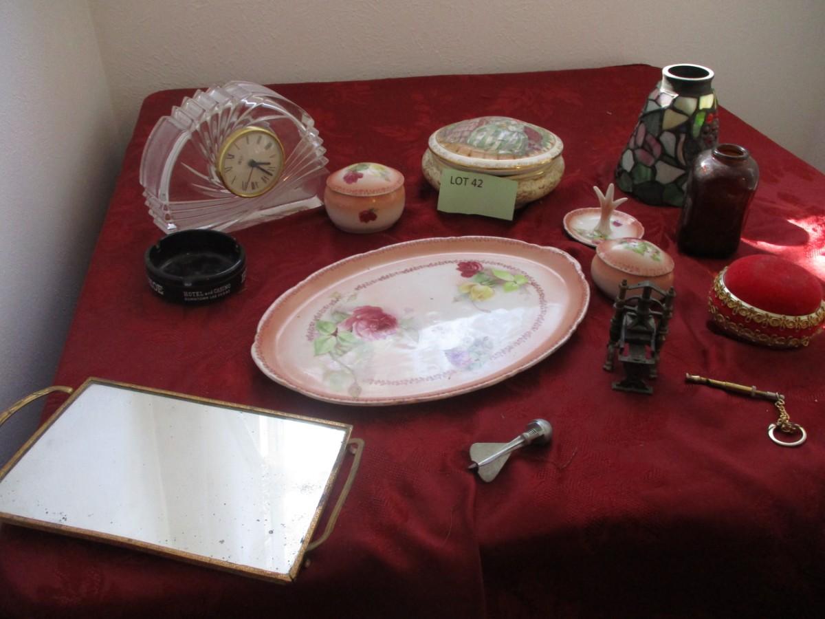 Mikasa Clocks-- face falls off. no guarantee it works. Tulip lamp shade. Brown pill bottle. Ringholder. Red pin cushion.