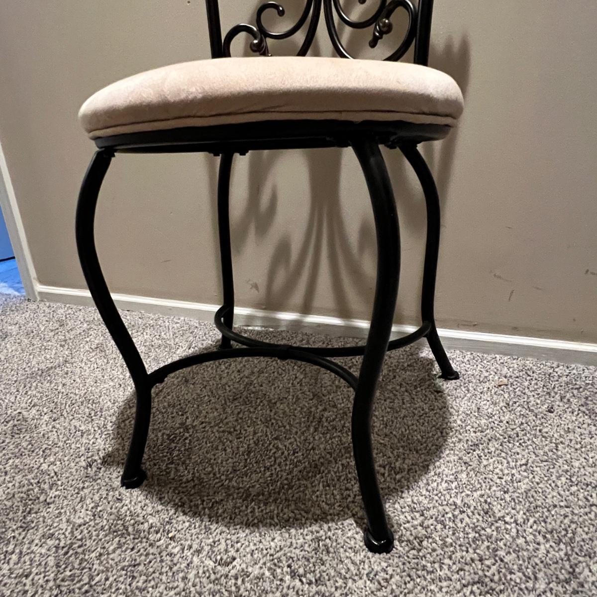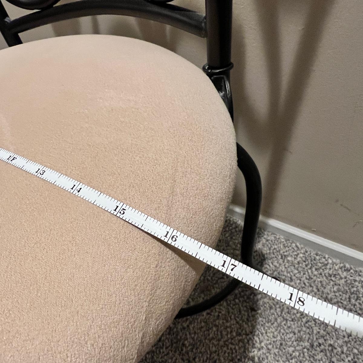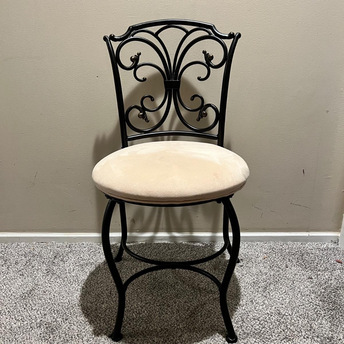 French-inspired metal vanity chair with fleur-de-lis decorative back, sparkling black and gold finish with 100% beige polyester upholstery, classic design and cabriole legs from durable tubular steel metal. 32.5H x 16W x 18.5D; Seat Diameter: 16; Seat Height: 19H. In good used condition. Seat barely shows any ware. NOTE: PICK UP ONLY IN DUNKIRK MD.