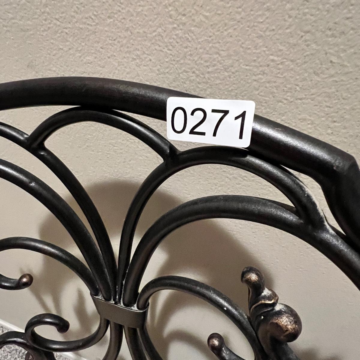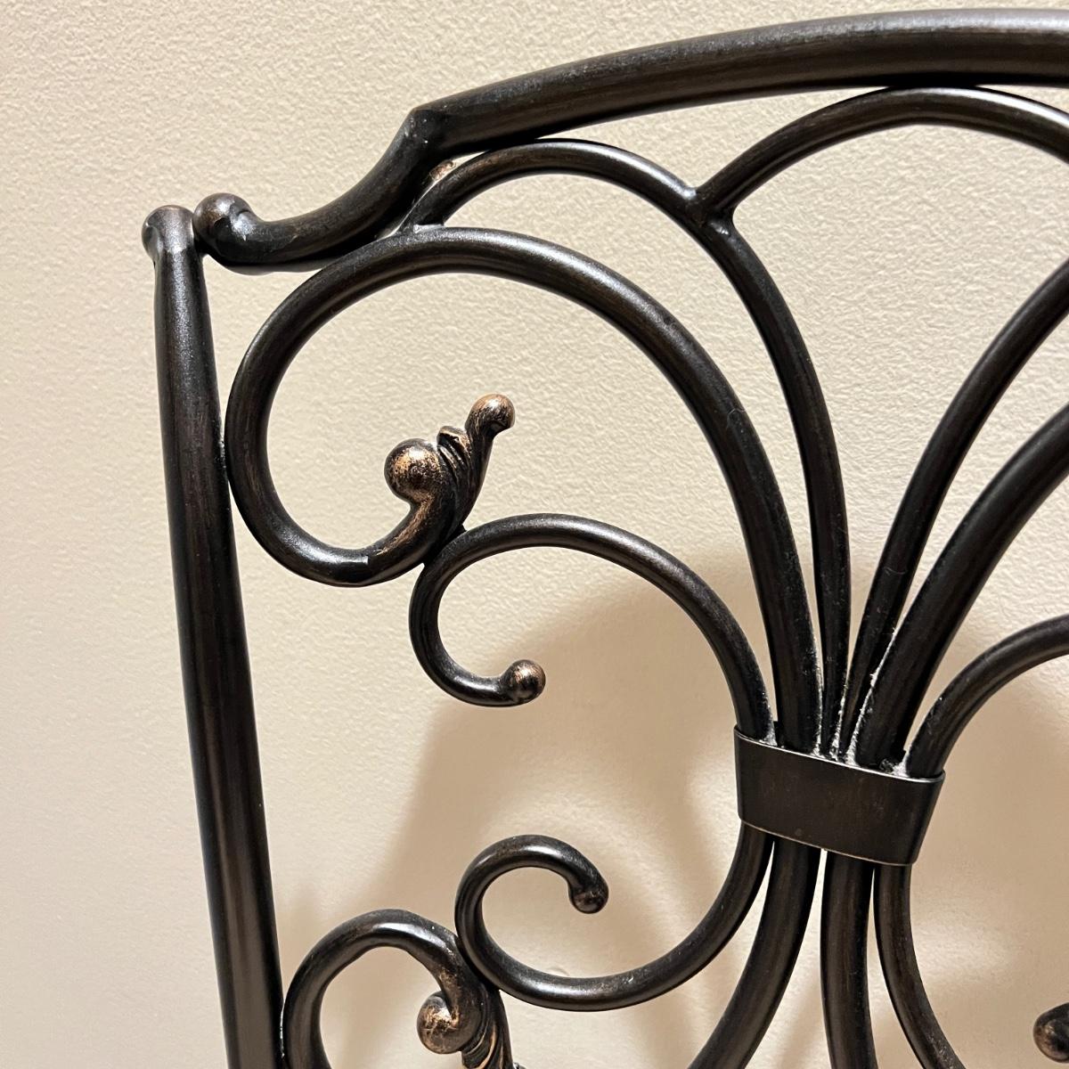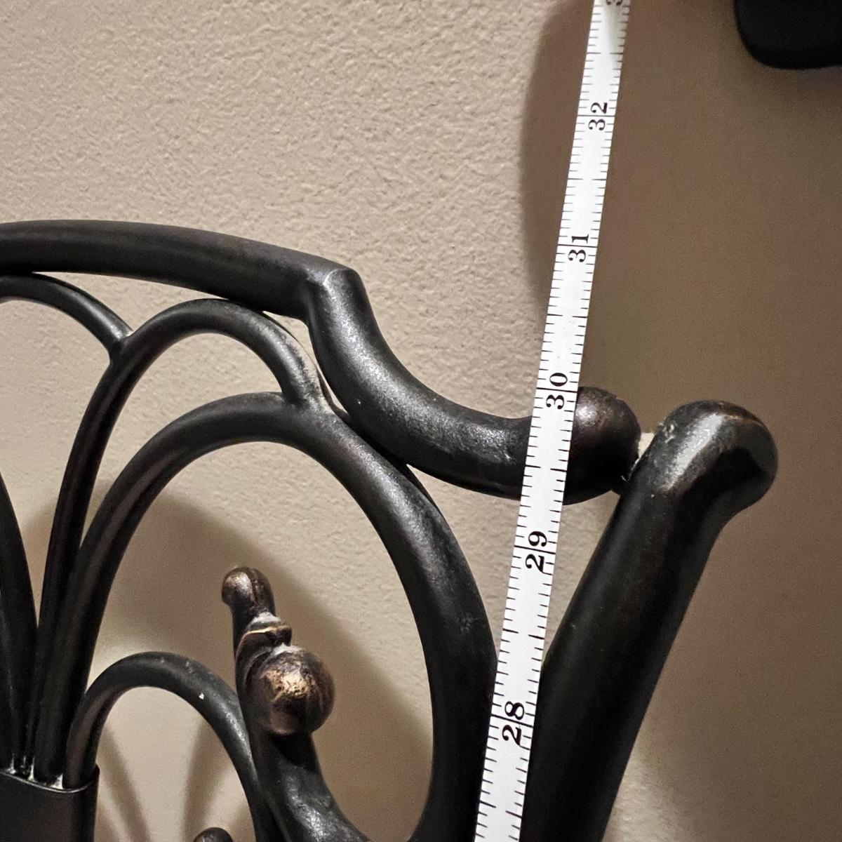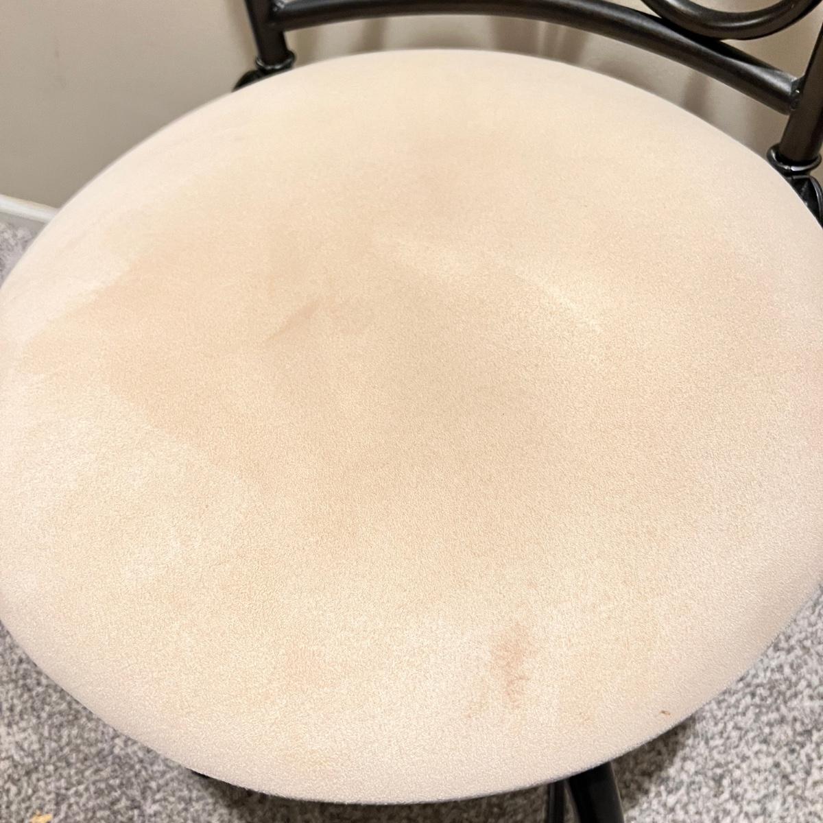 French-inspired metal vanity chair with fleur-de-lis decorative back, sparkling black and gold finish with 100% beige polyester upholstery, classic design and cabriole legs from durable tubular steel metal. 32.5H x 16W x 18.5D; Seat Diameter: 16; Seat Height: 19H. In good used condition. Seat barely shows any ware. NOTE: PICK UP ONLY IN DUNKIRK MD.
