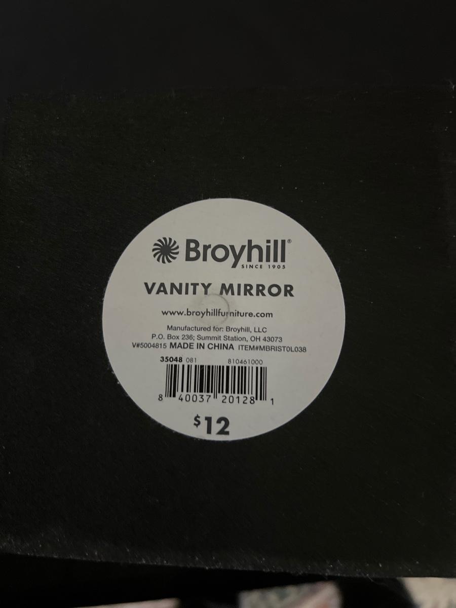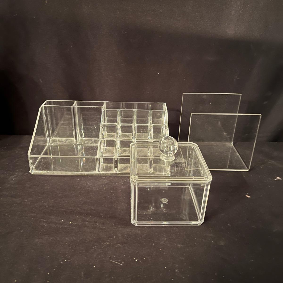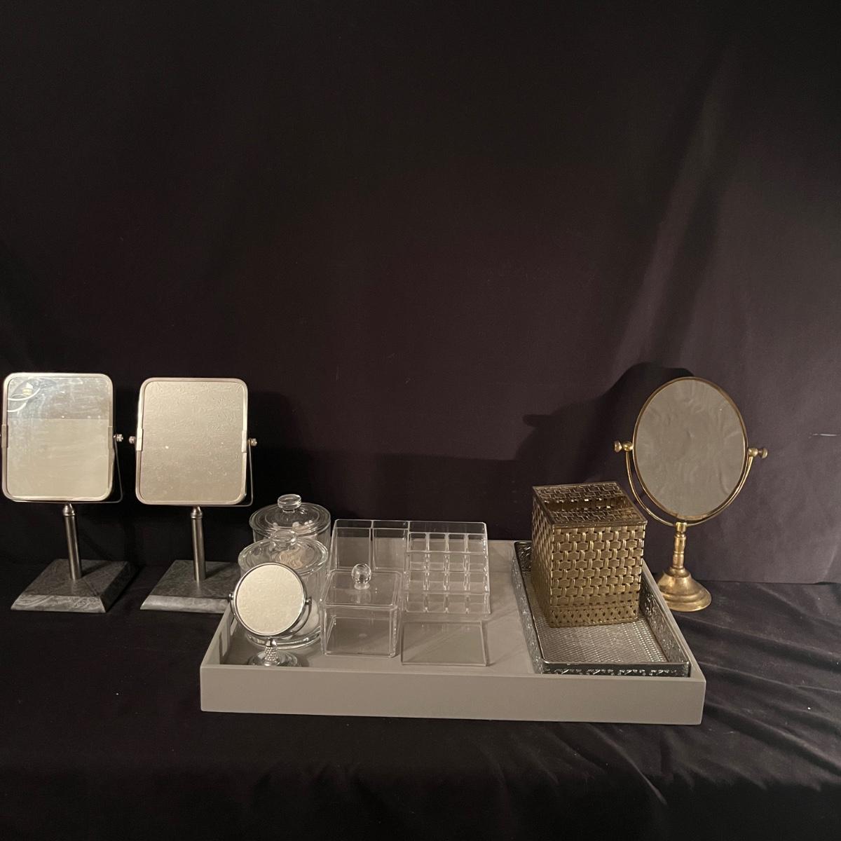 Lit includes an Artex D&T tray, a brass vanity mirror, two Broyhill vanity mirrors, two glass jars with lids, a metal tray and tissue box cover, an acrylic box, tray and stand, and one small vanity mirror. Larger tray measures 13” x 22” x 2”H.