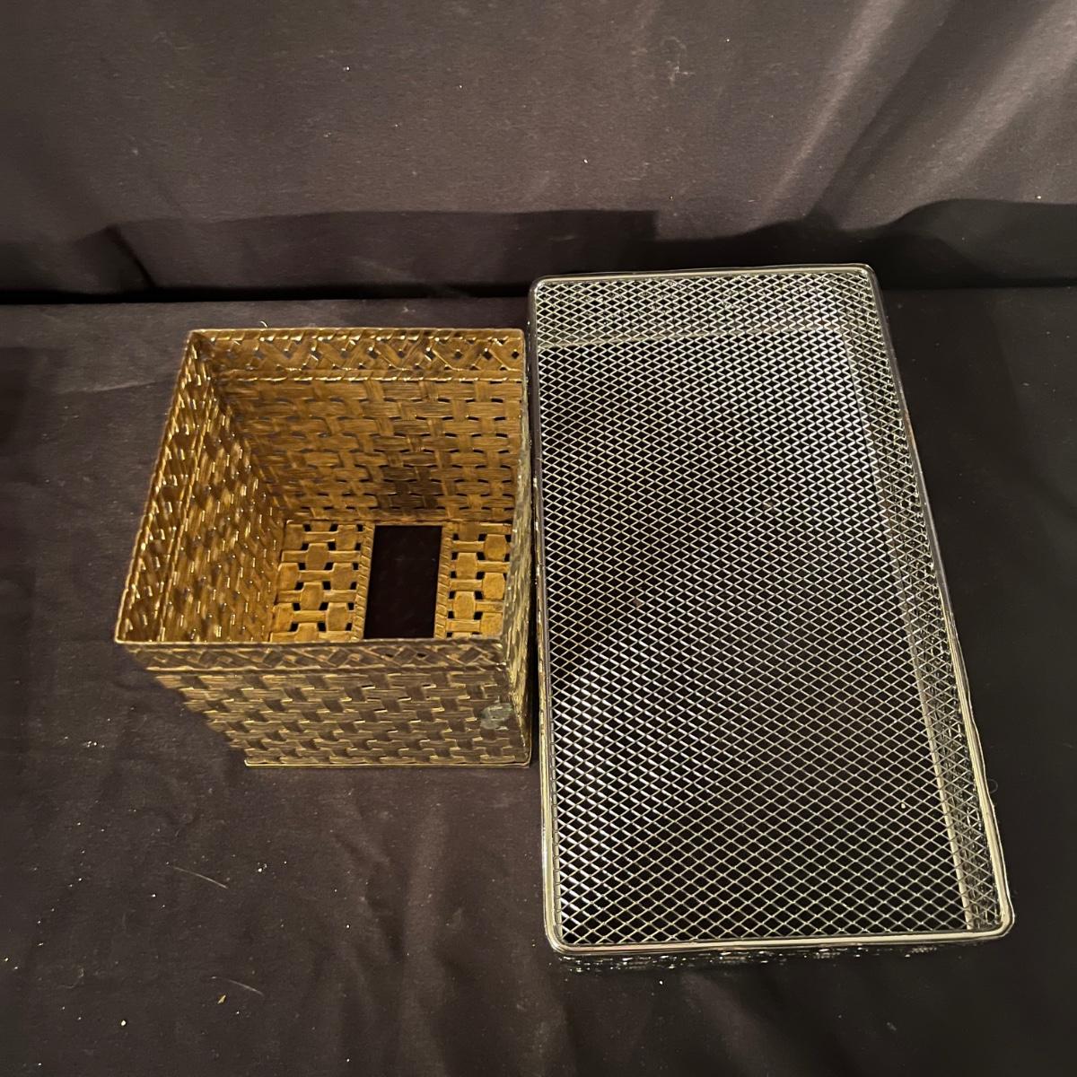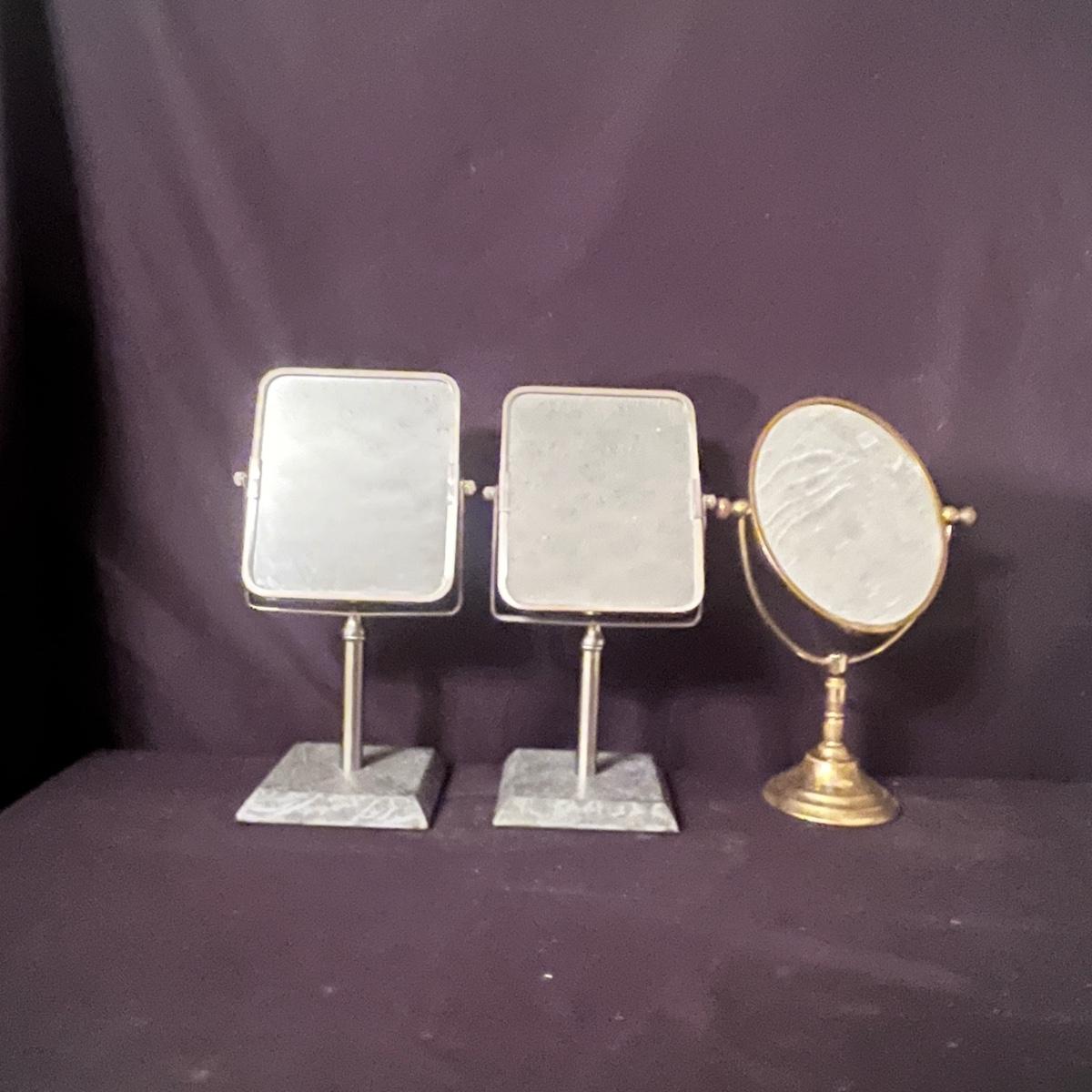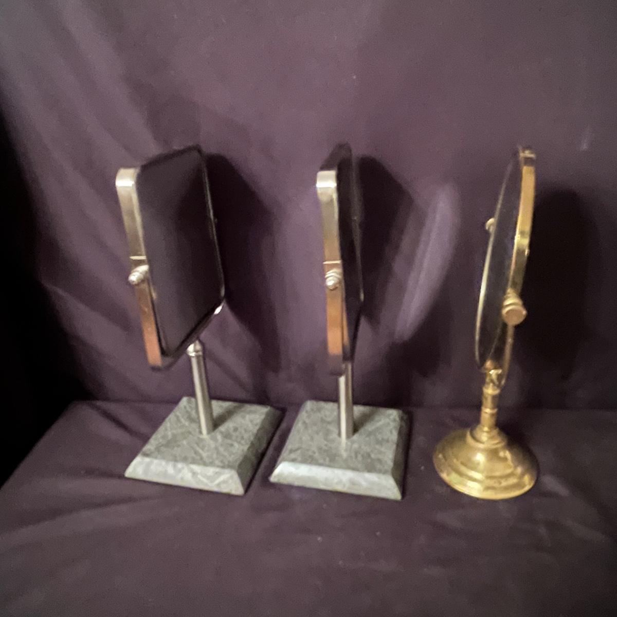 Lit includes an Artex D&T tray, a brass vanity mirror, two Broyhill vanity mirrors, two glass jars with lids, a metal tray and tissue box cover, an acrylic box, tray and stand, and one small vanity mirror. Larger tray measures 13” x 22” x 2”H.