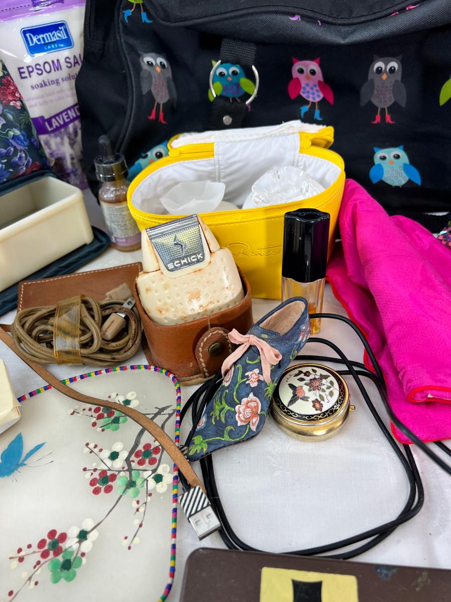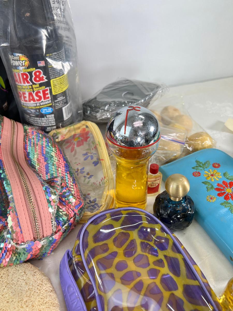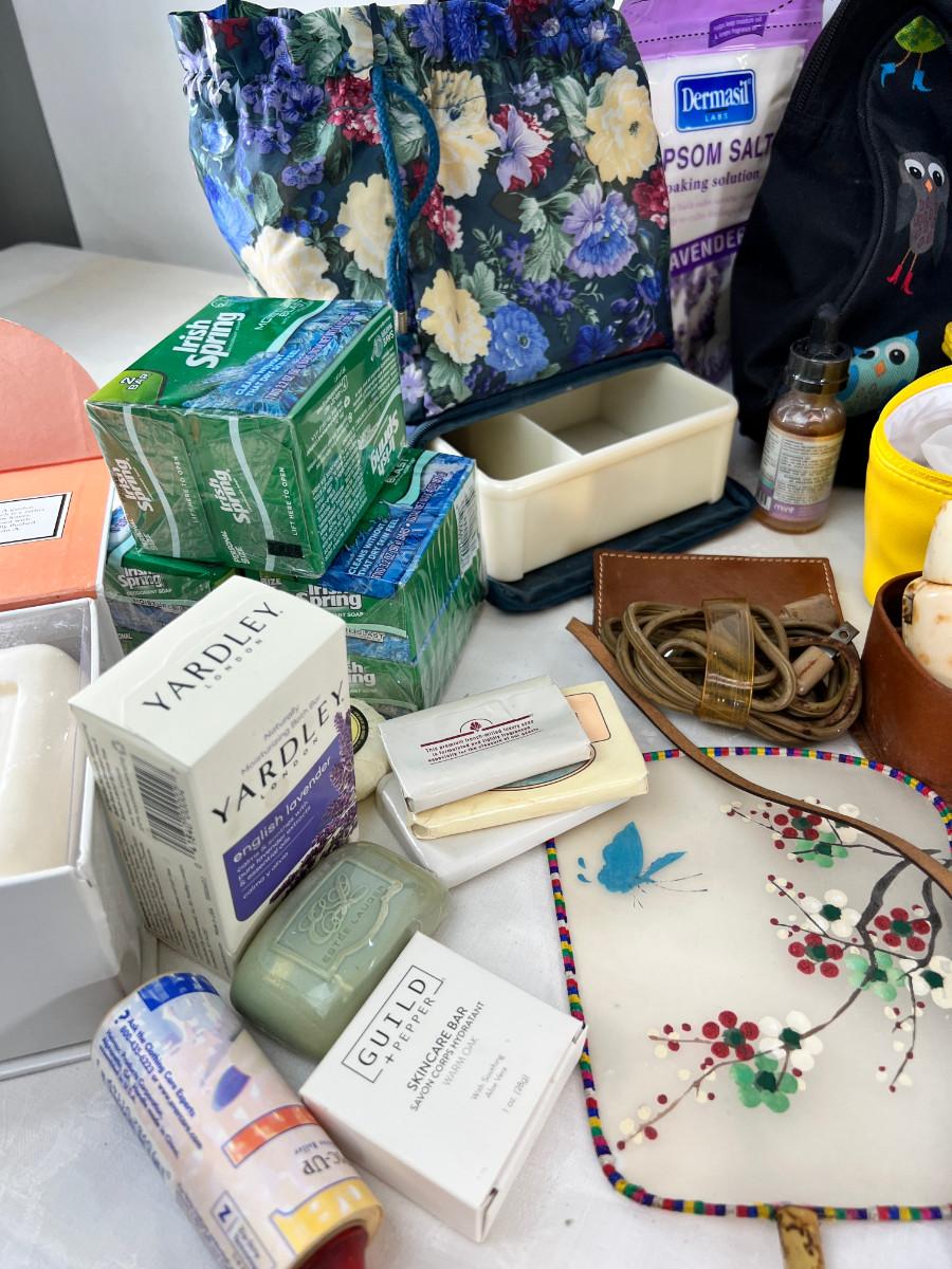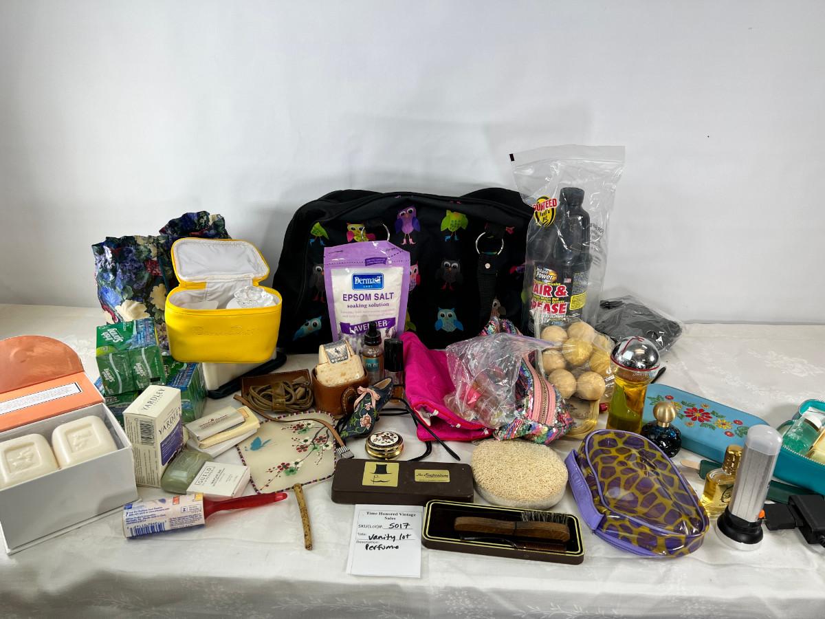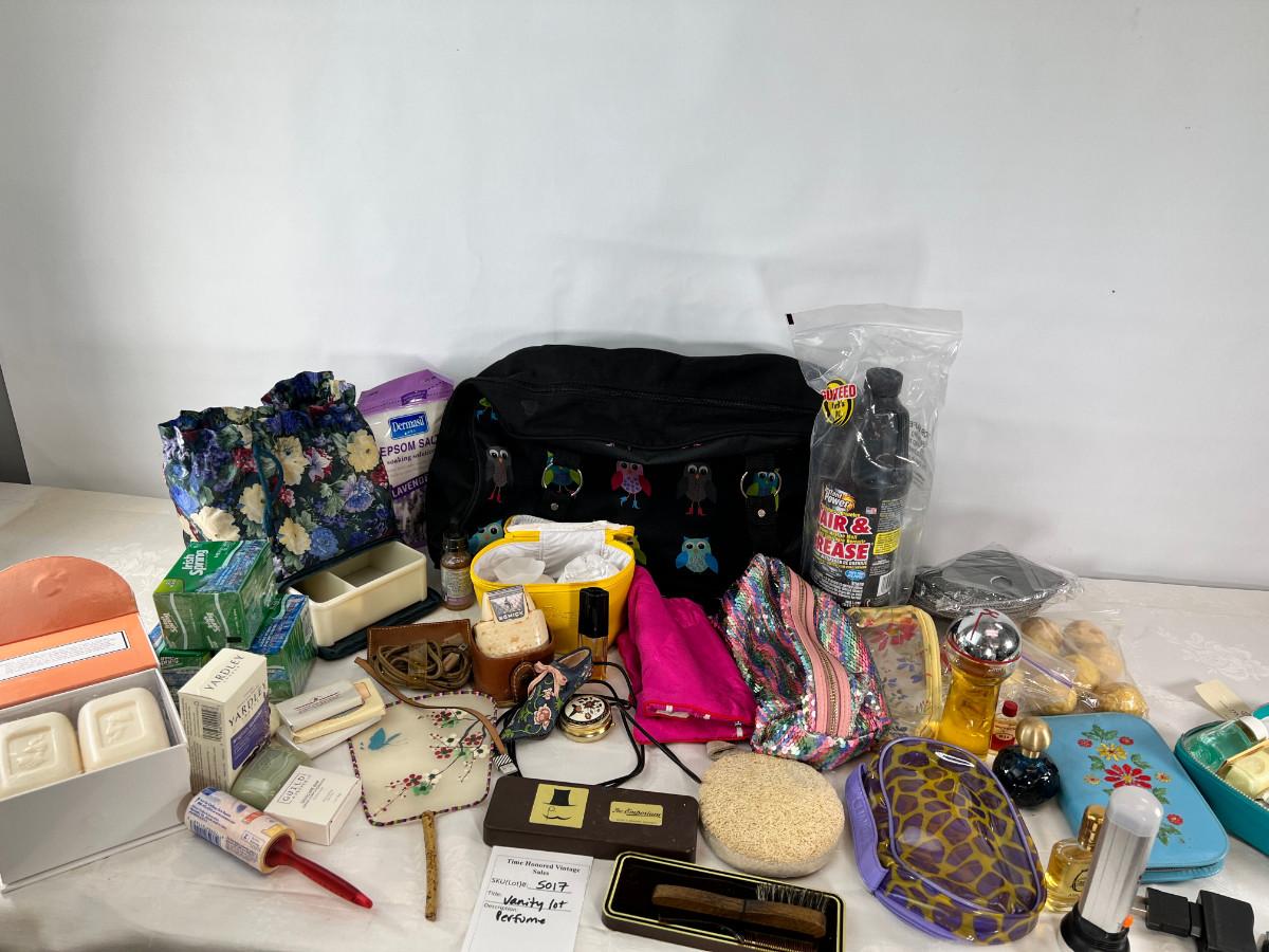Owl duffle bag , cosmetic bags, vintage vanity items, scented soaps, fan, perfumes and cologne.