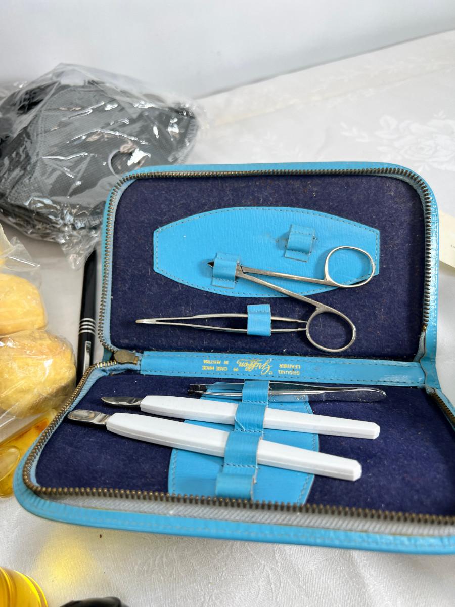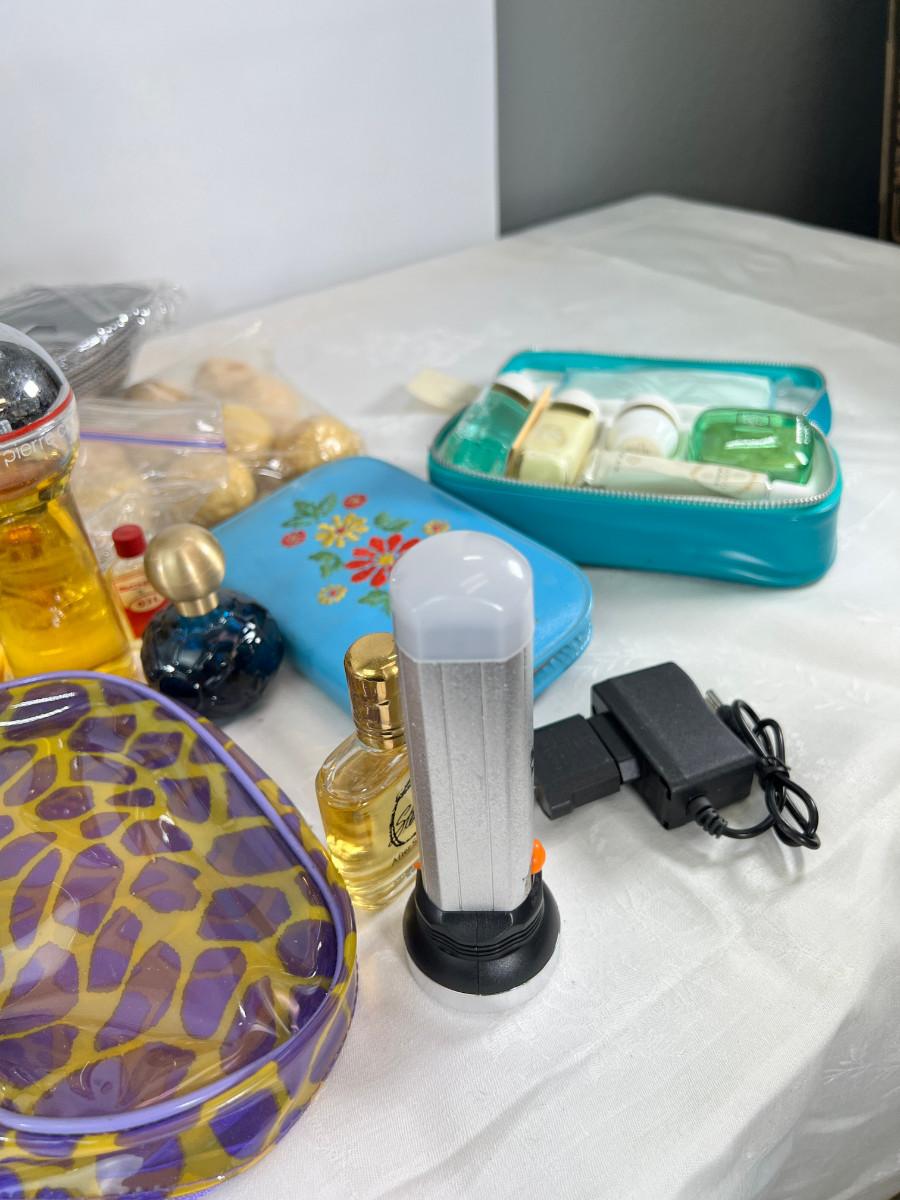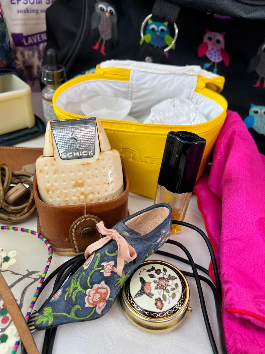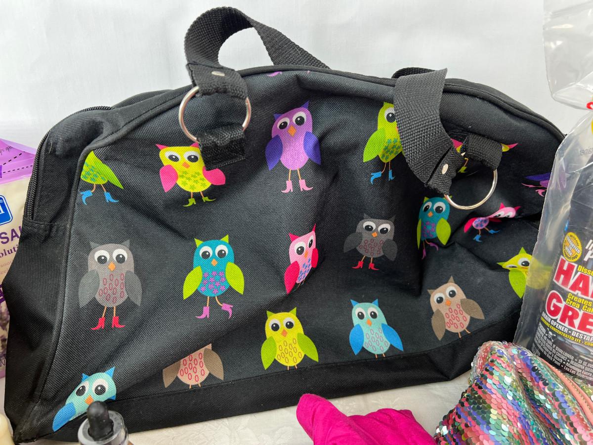 Owl duffle bag , cosmetic bags, vintage vanity items, scented soaps, fan, perfumes and cologne.
