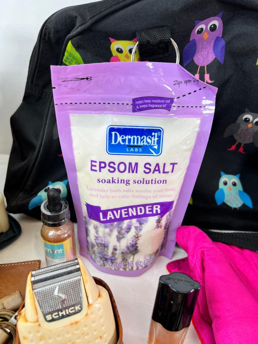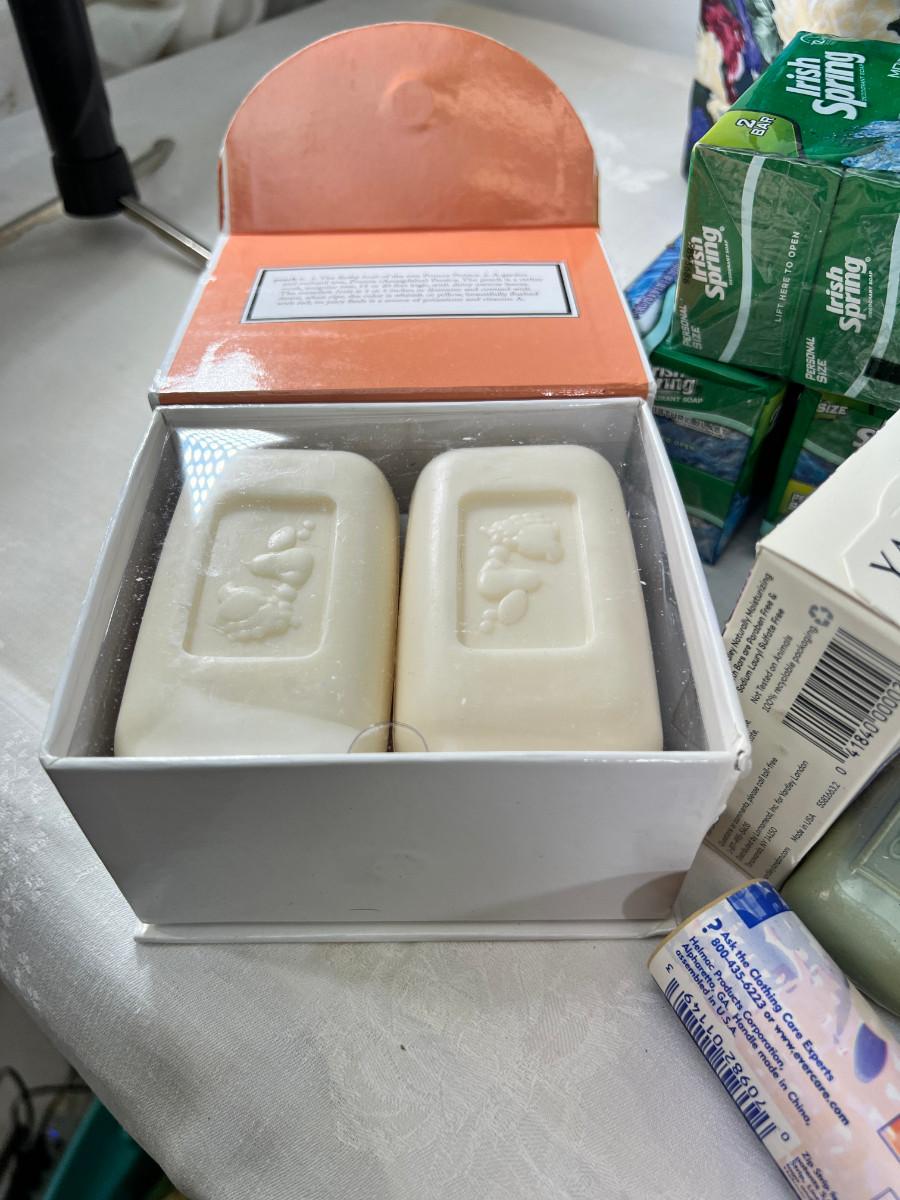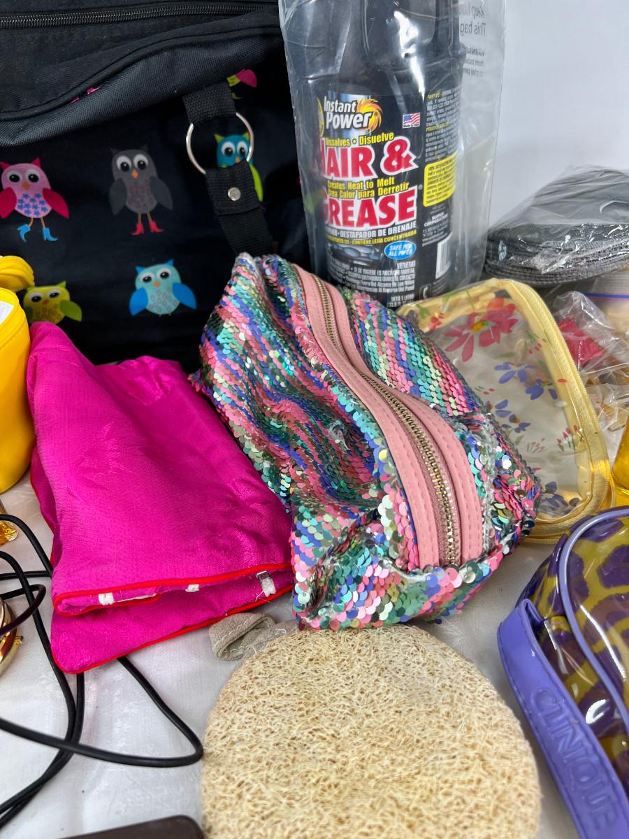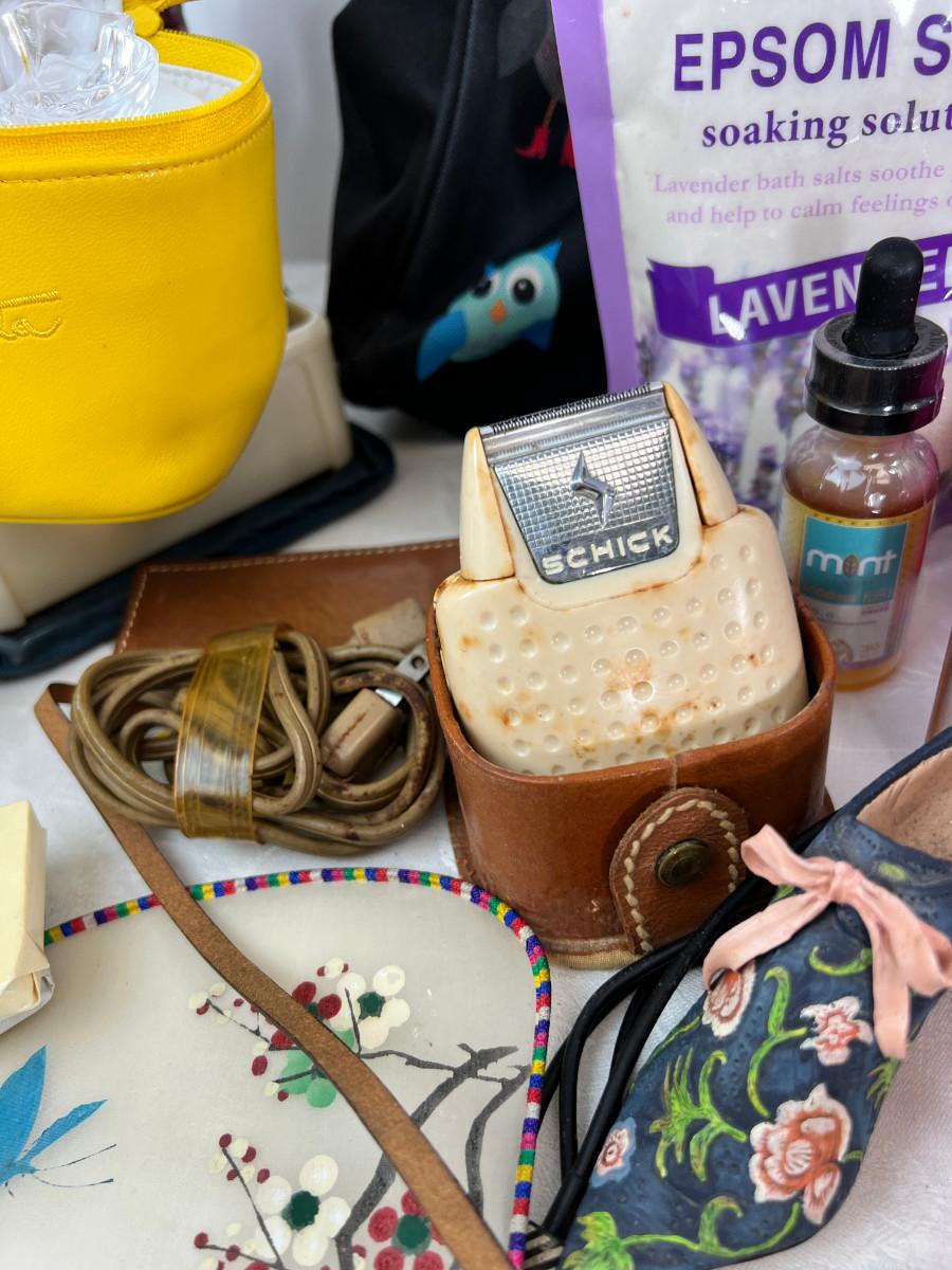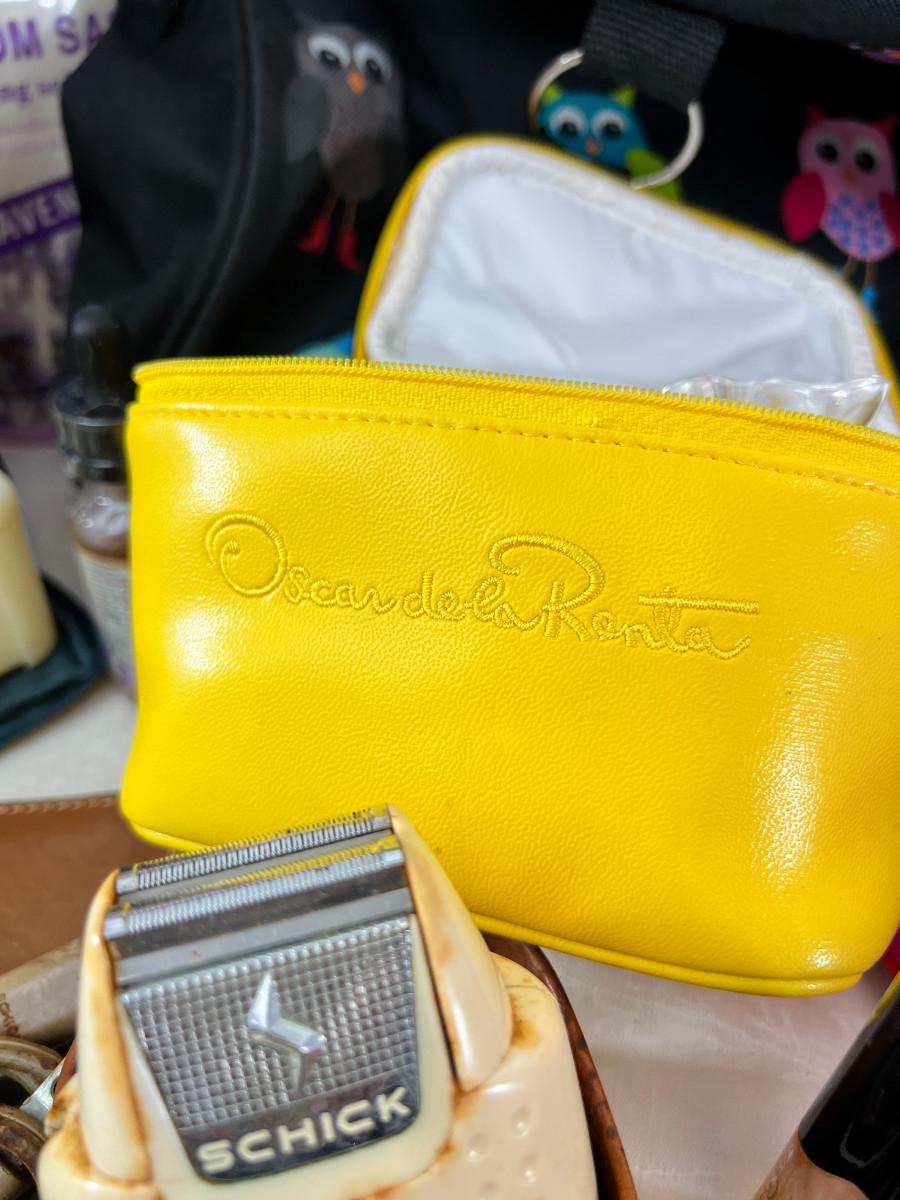Owl duffle bag , cosmetic bags, vintage vanity items, scented soaps, fan, perfumes and cologne.