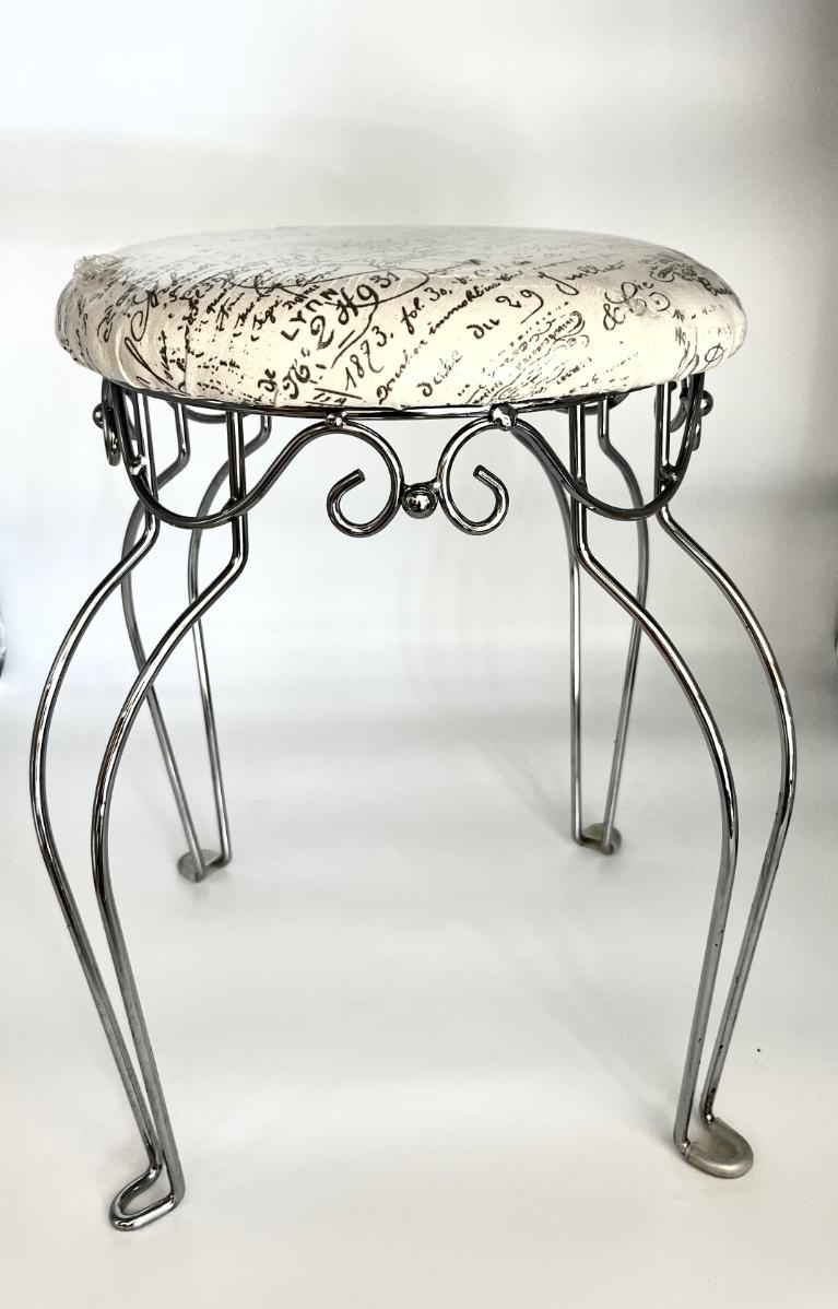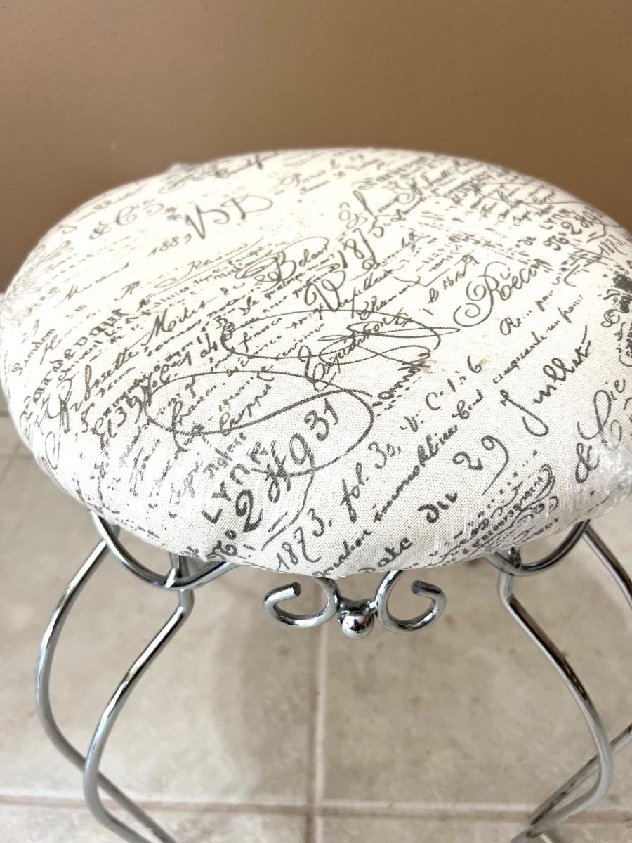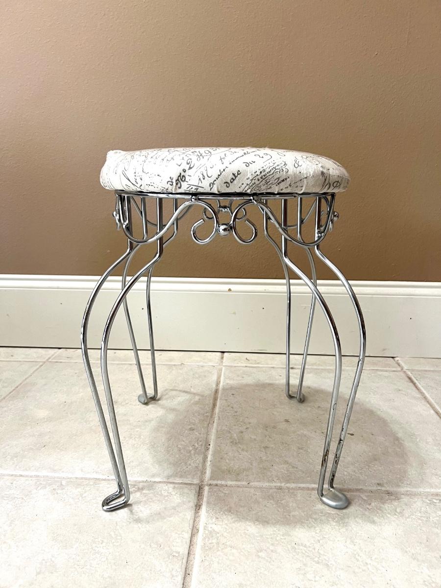 Silver base vanity stool seat is still wrapped in the plastic! Cushion is off white with greyish writing. Measures 18 inches tall, 14 inches wide and 14 inches deep.