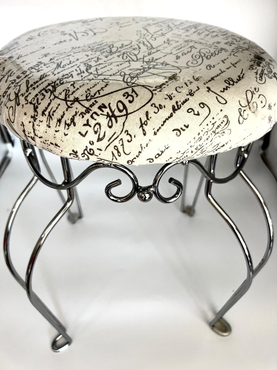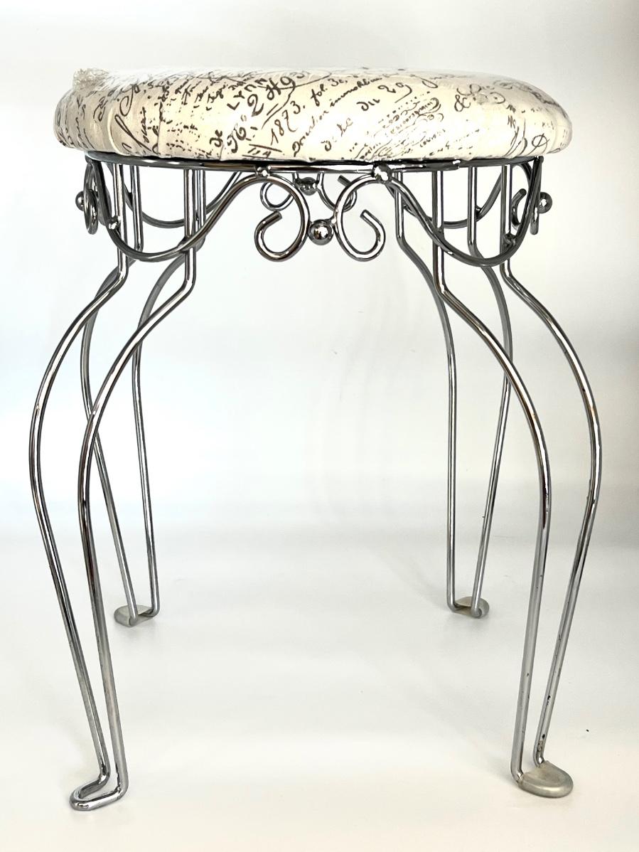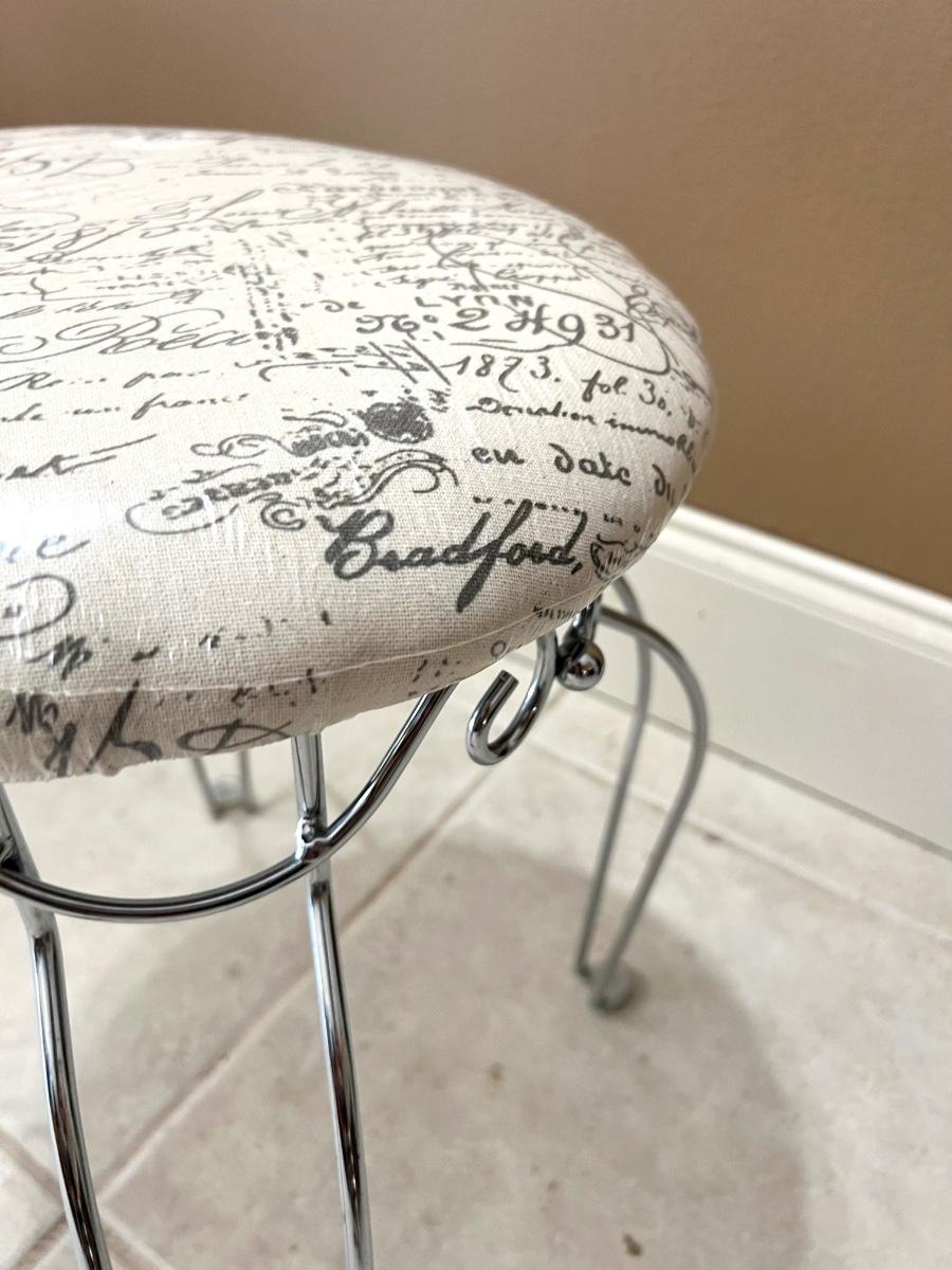 Silver base vanity stool seat is still wrapped in the plastic! Cushion is off white with greyish writing. Measures 18 inches tall, 14 inches wide and 14 inches deep.