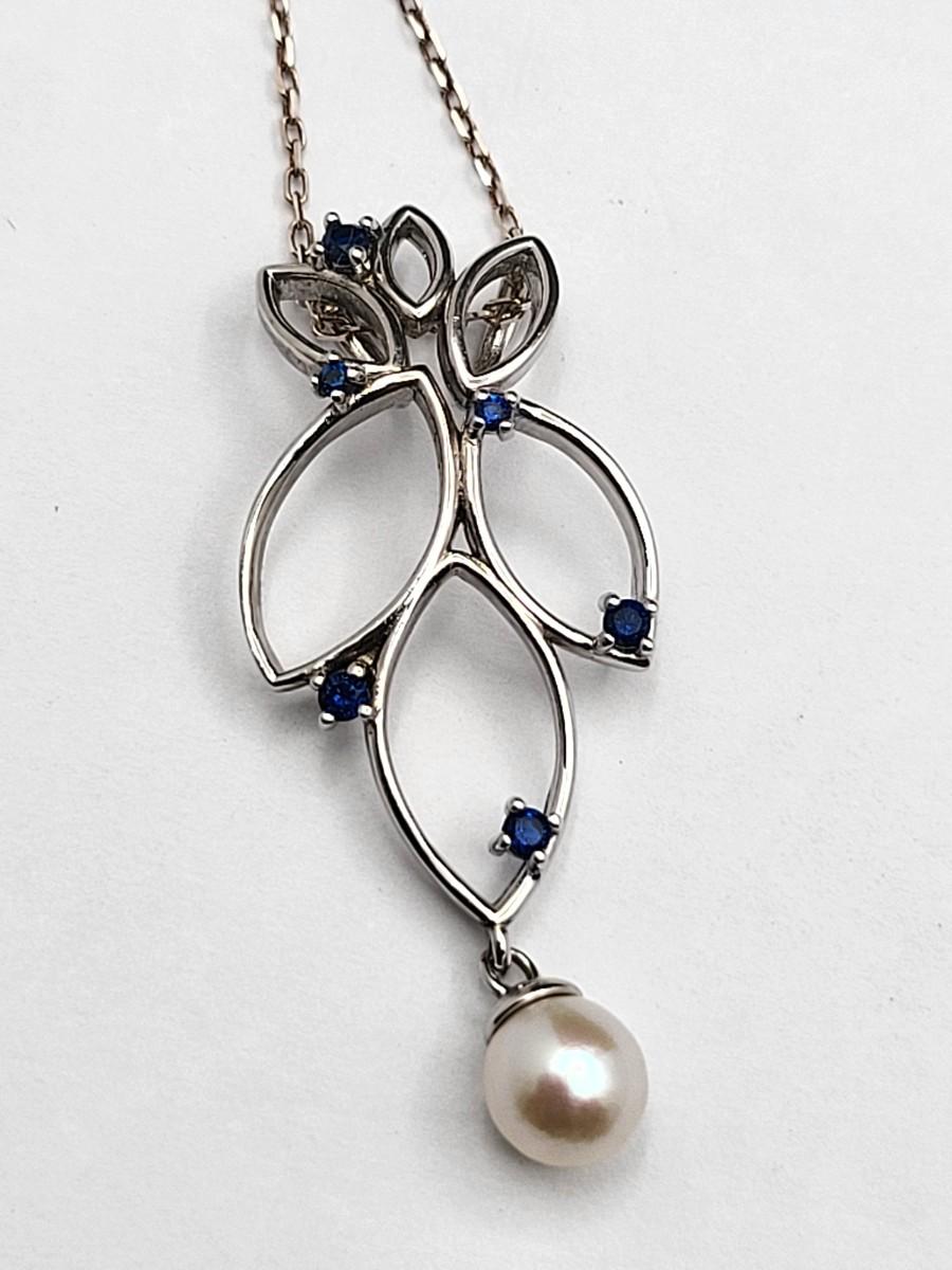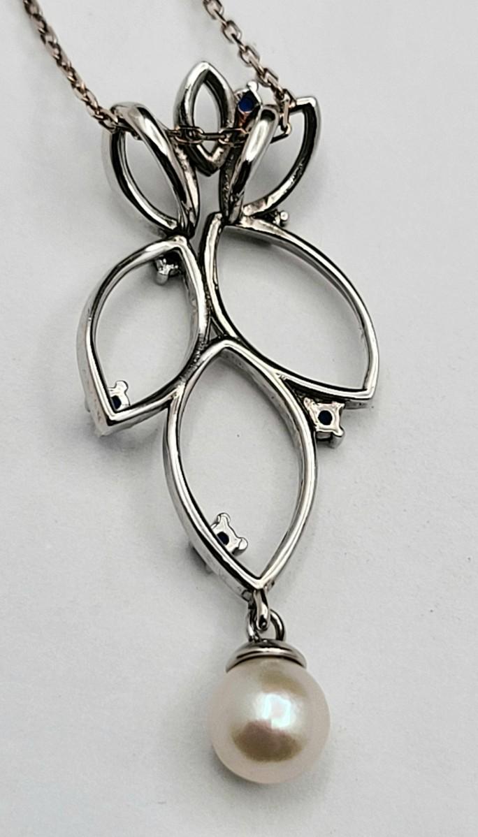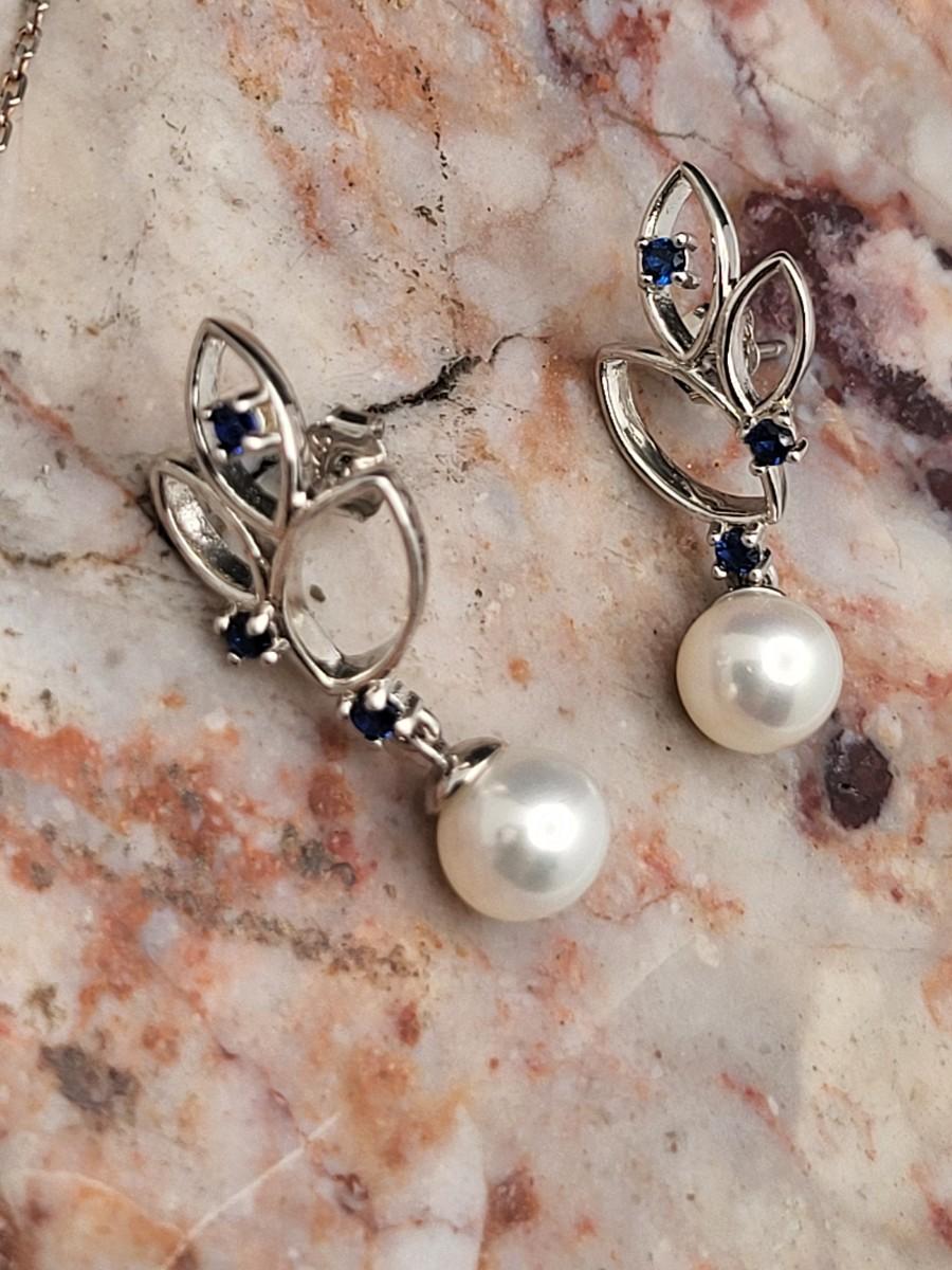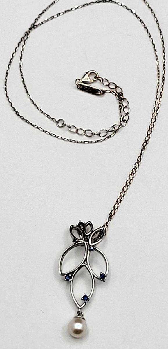 Custom crafted from hand-shucked pearls. Nice uniform color, deep blue sapphire accents and set in sterling silver. Chain is 18". Pearls are approximately 4mm. Earrings are 1" long and pendant is 1.5" long.