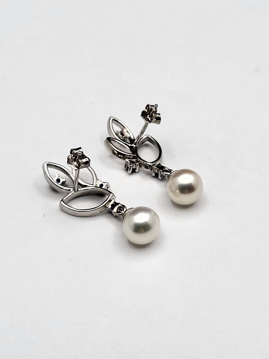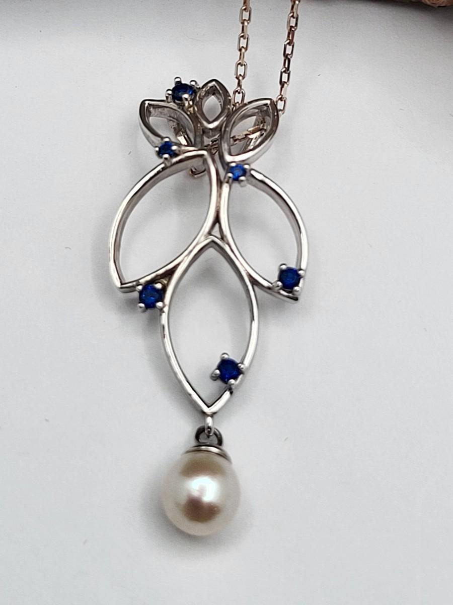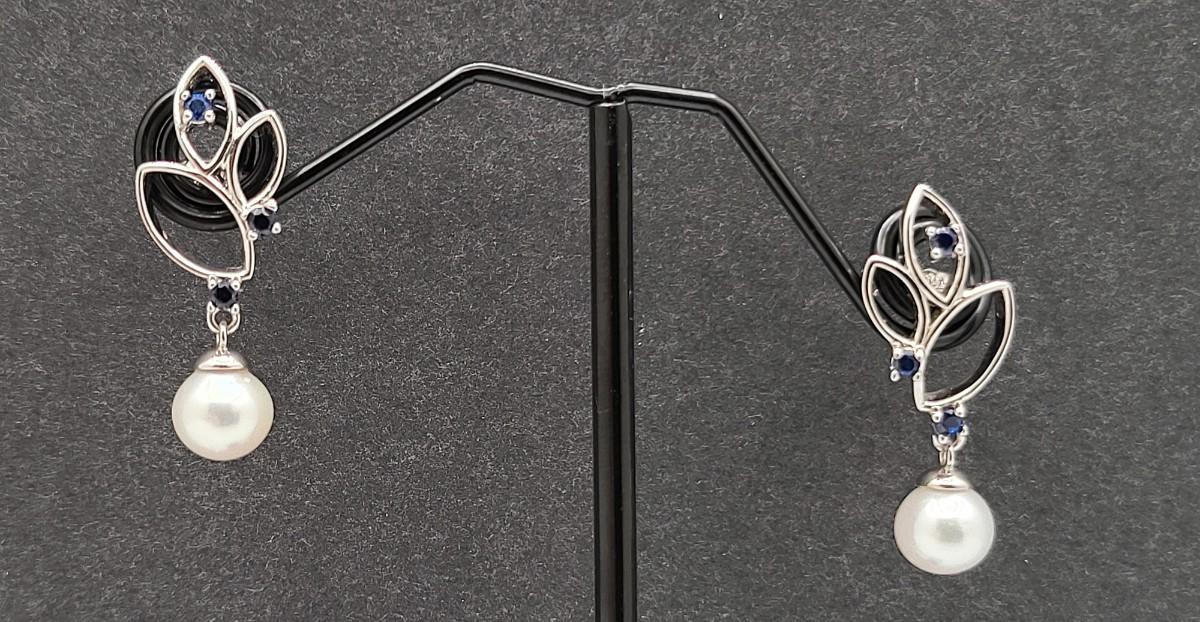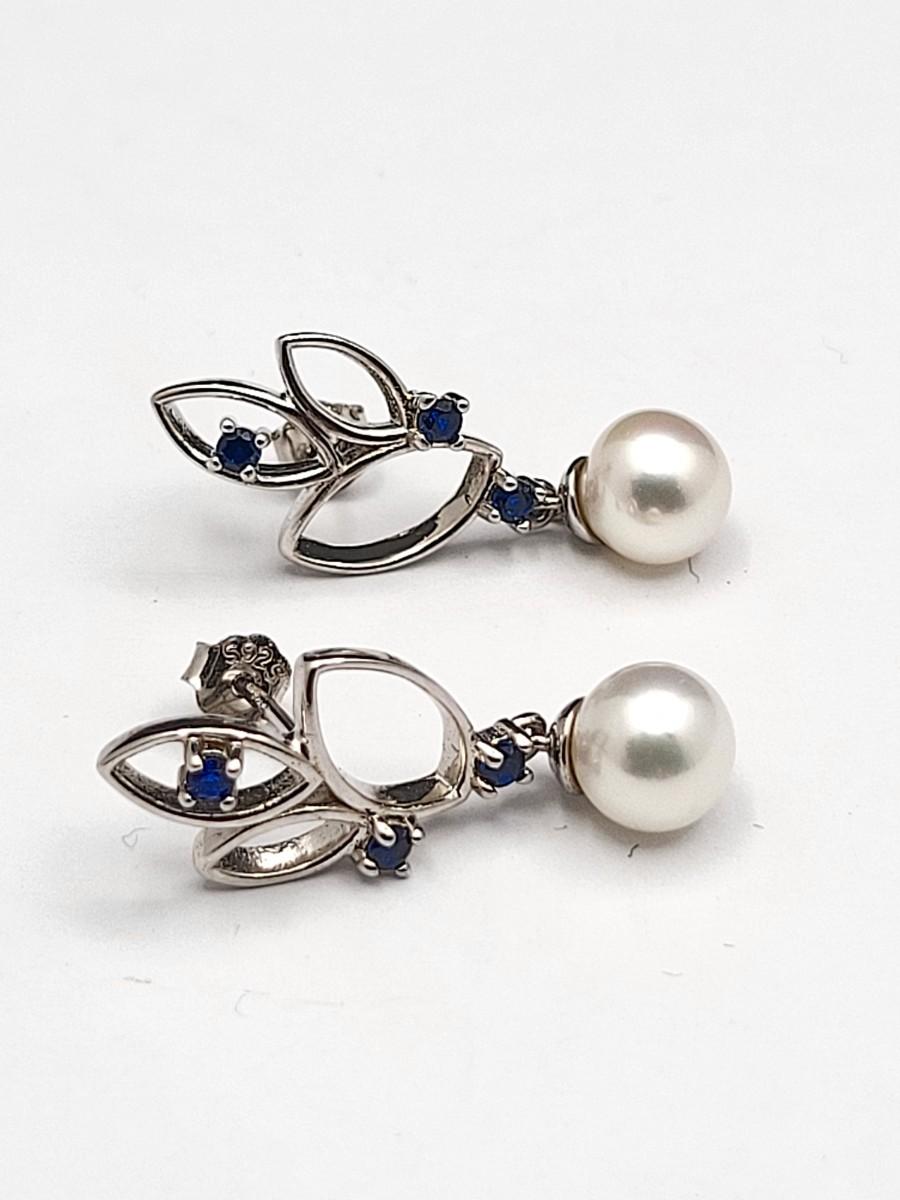 Custom crafted from hand-shucked pearls. Nice uniform color, deep blue sapphire accents and set in sterling silver. Chain is 18". Pearls are approximately 4mm. Earrings are 1" long and pendant is 1.5" long.