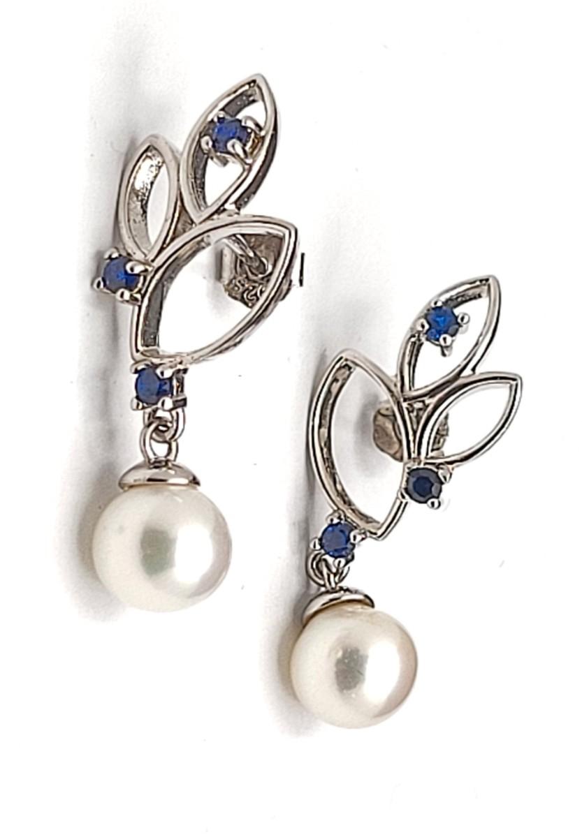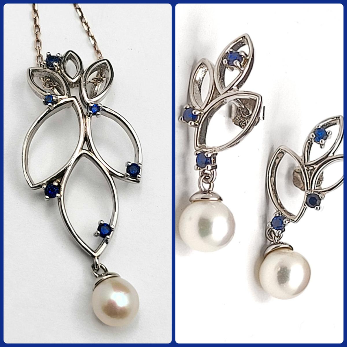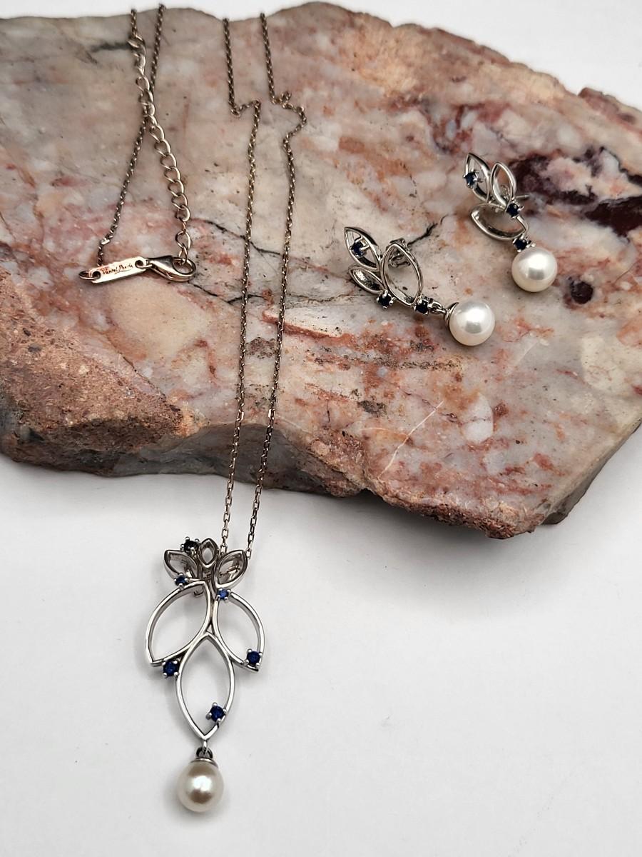 Vantel Genuine Pearl & Sapphire Necklace Earring Set 925