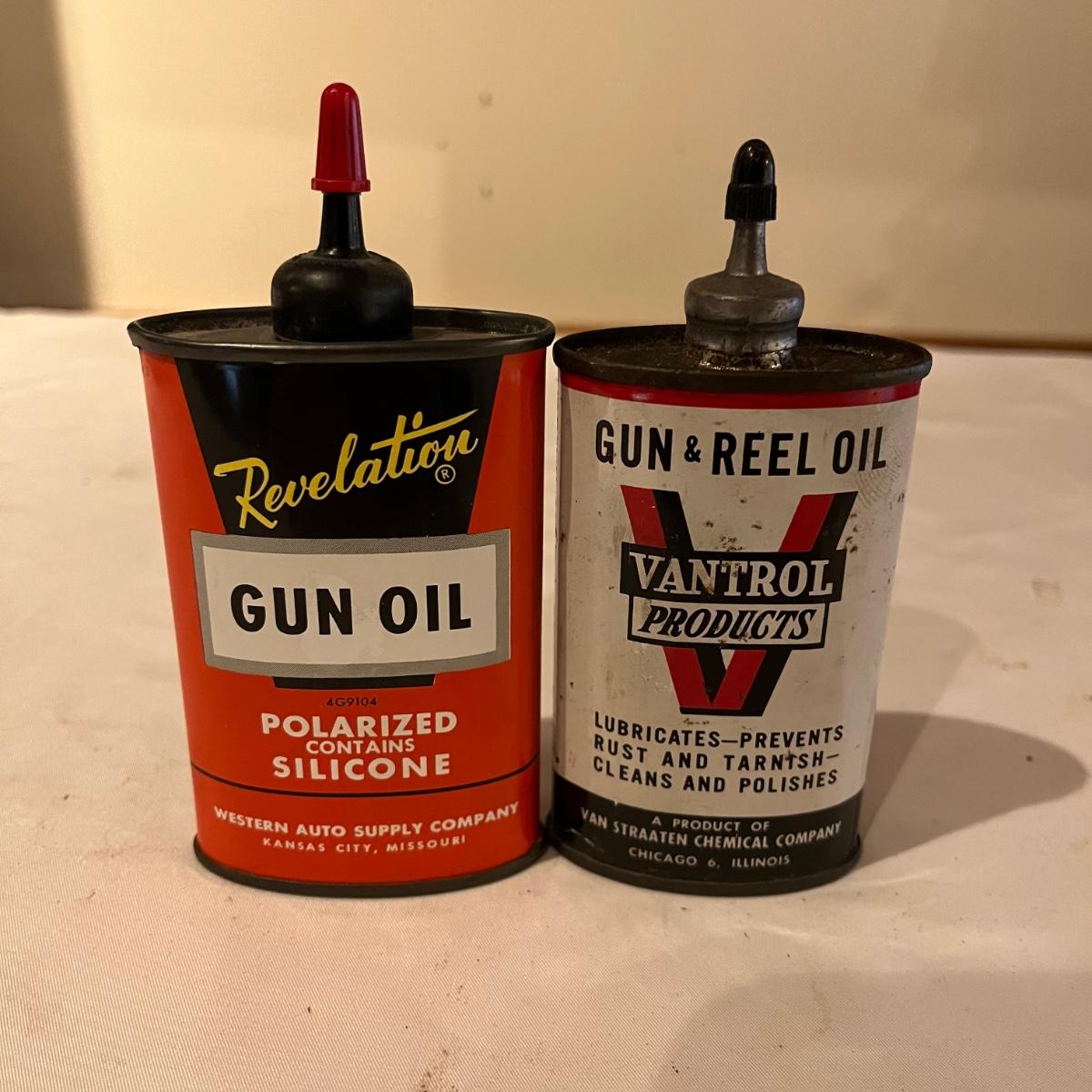 Lot includes a Vantrol gun oil can and a Revelation gun oil can.