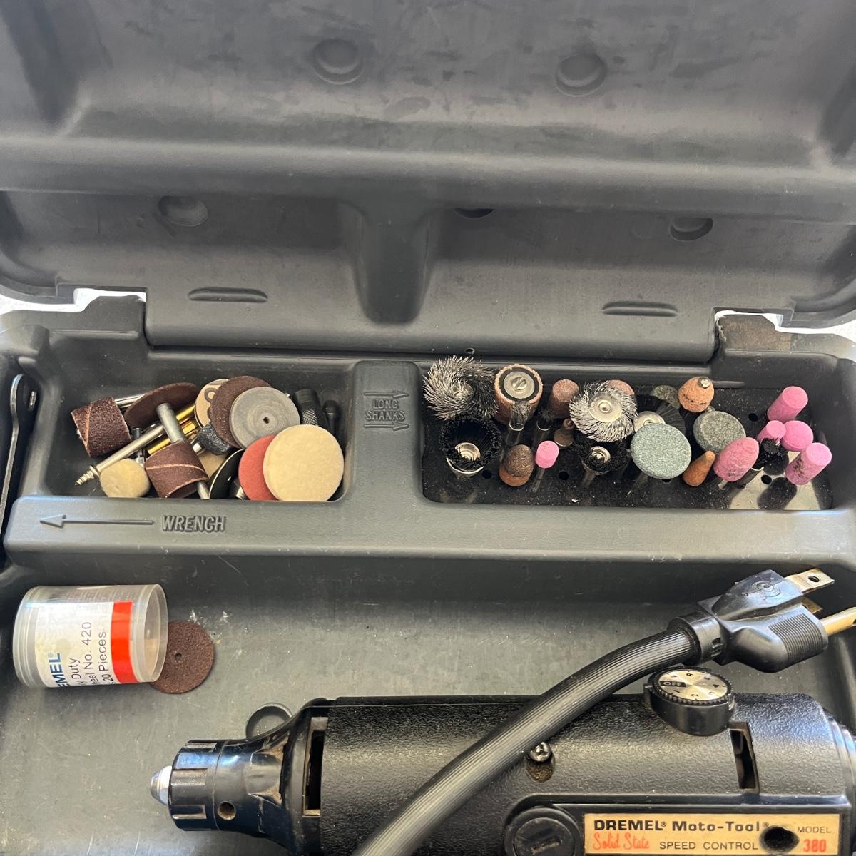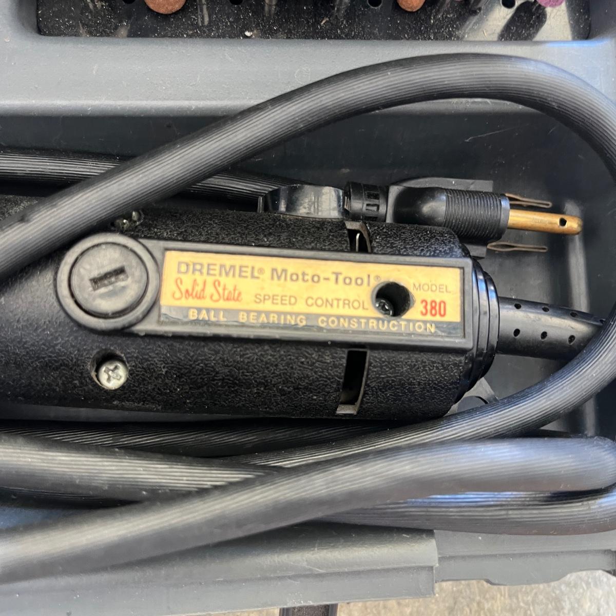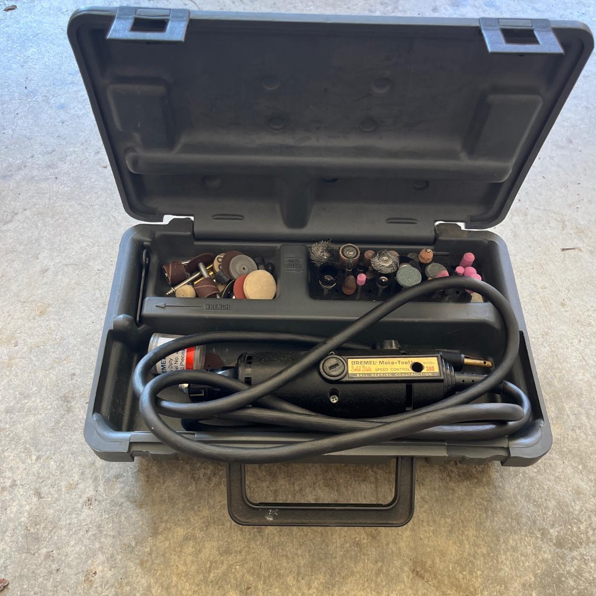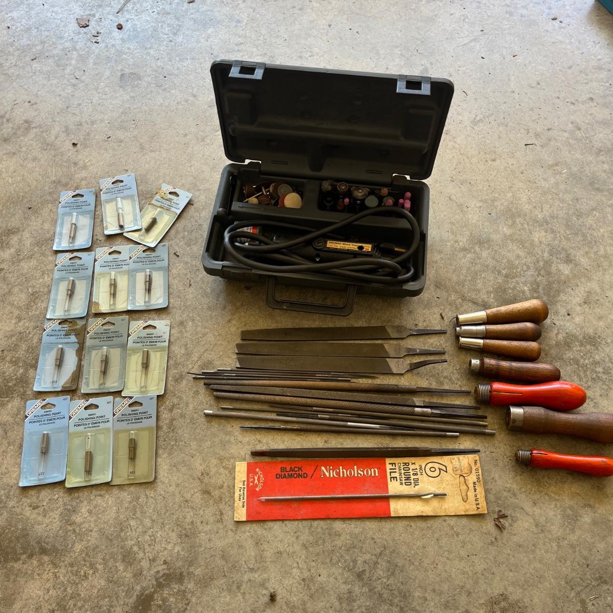 Lot includes a variable speed Dremel tool with plastic carrying case and accessories, over 10 metal files with six wooden handles and 12 Dremel polishing points. Dremel case measures 11” x 7” x 3”H. Dremel powered on when plugged in.