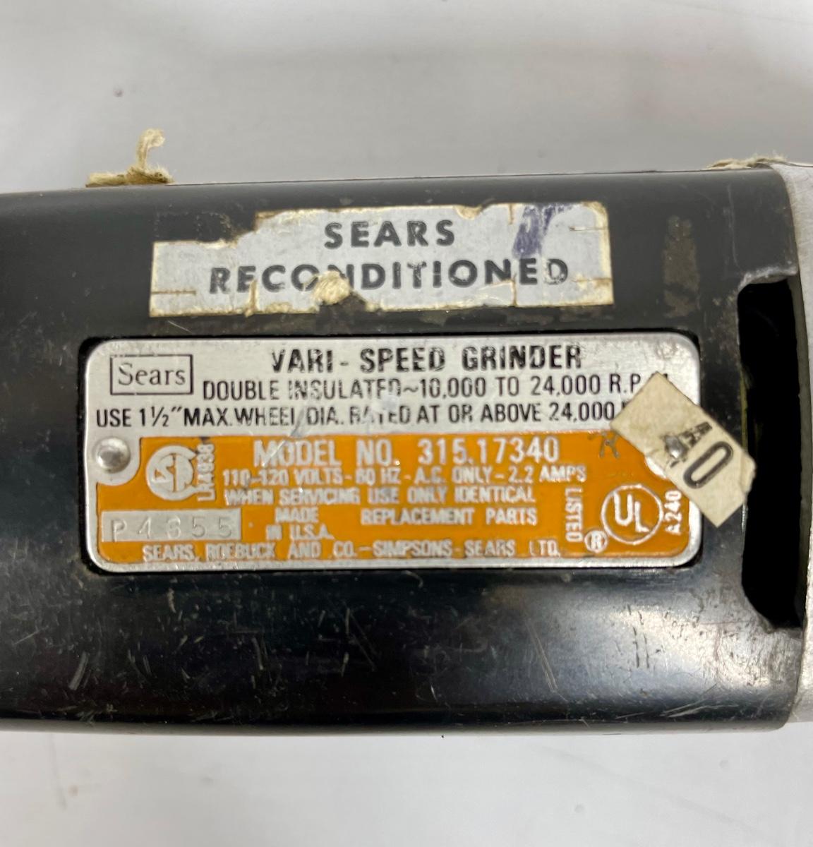 Sears craftsman Vari-Speed Grinder, model 315.17340. Includes case. steel wall rack, wrenches, and lot of misc. style grinding bits. Tested, runs strong.
