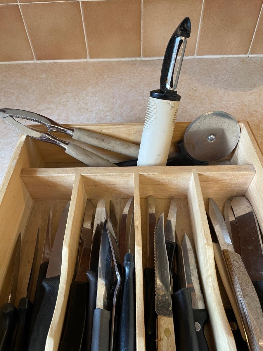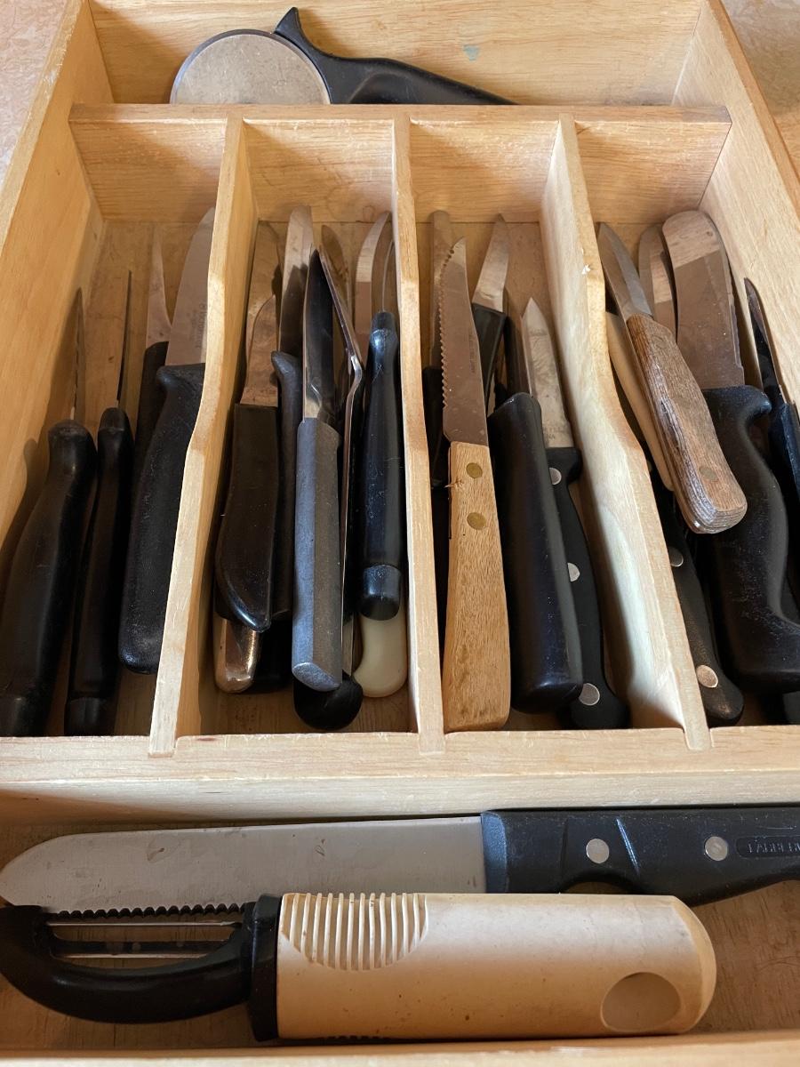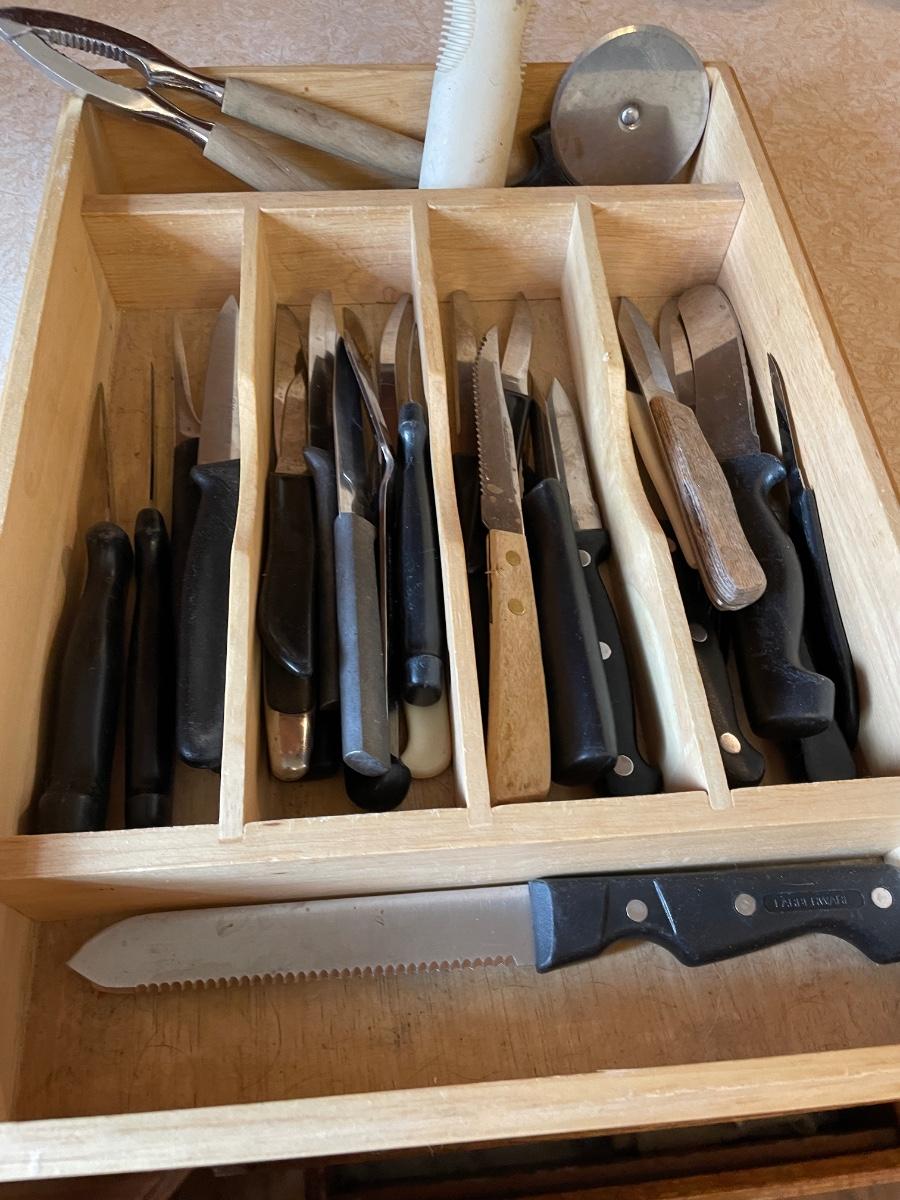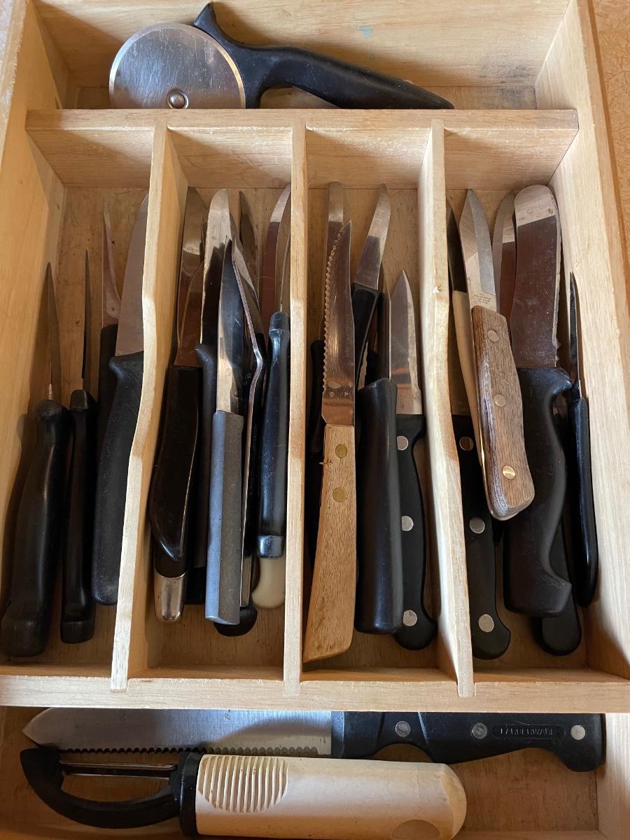 VARIETY OF KNIVES, PEELER, PIZZA CUTTER