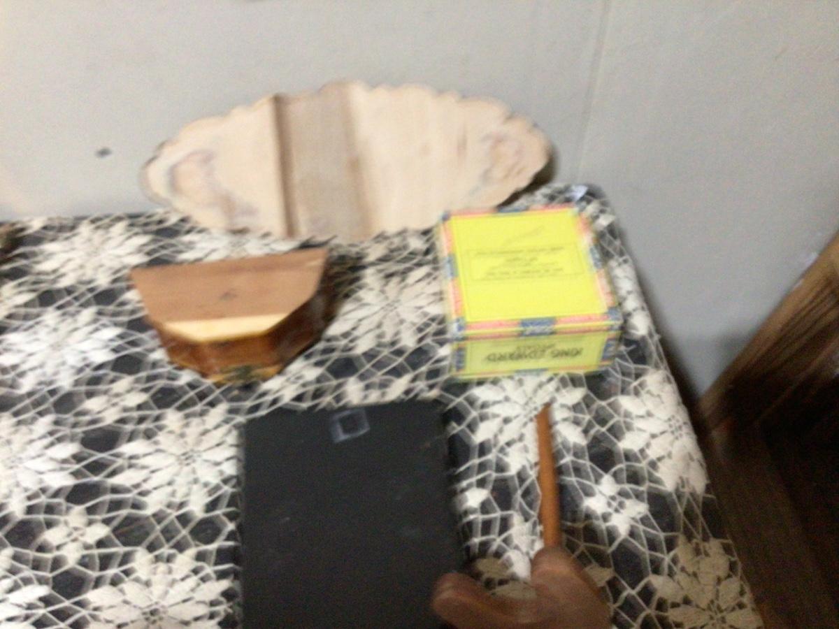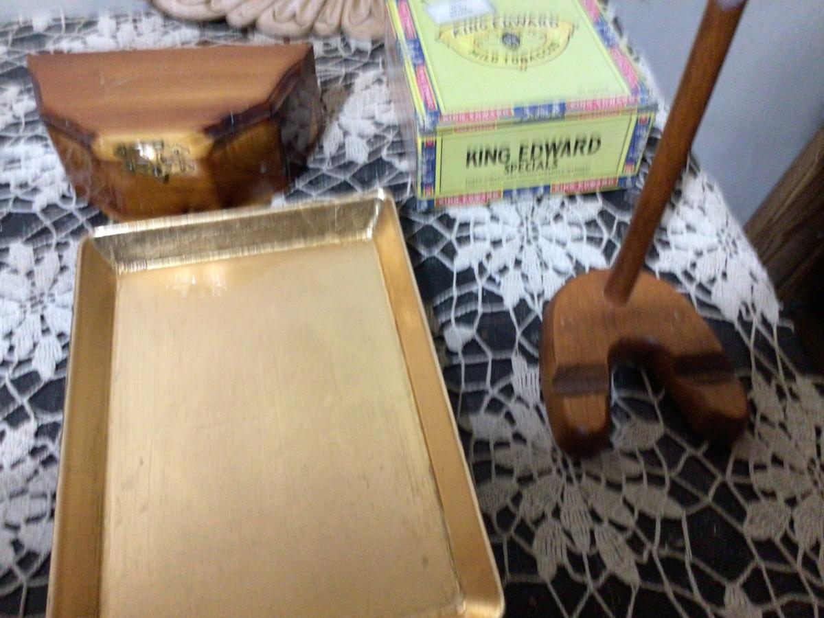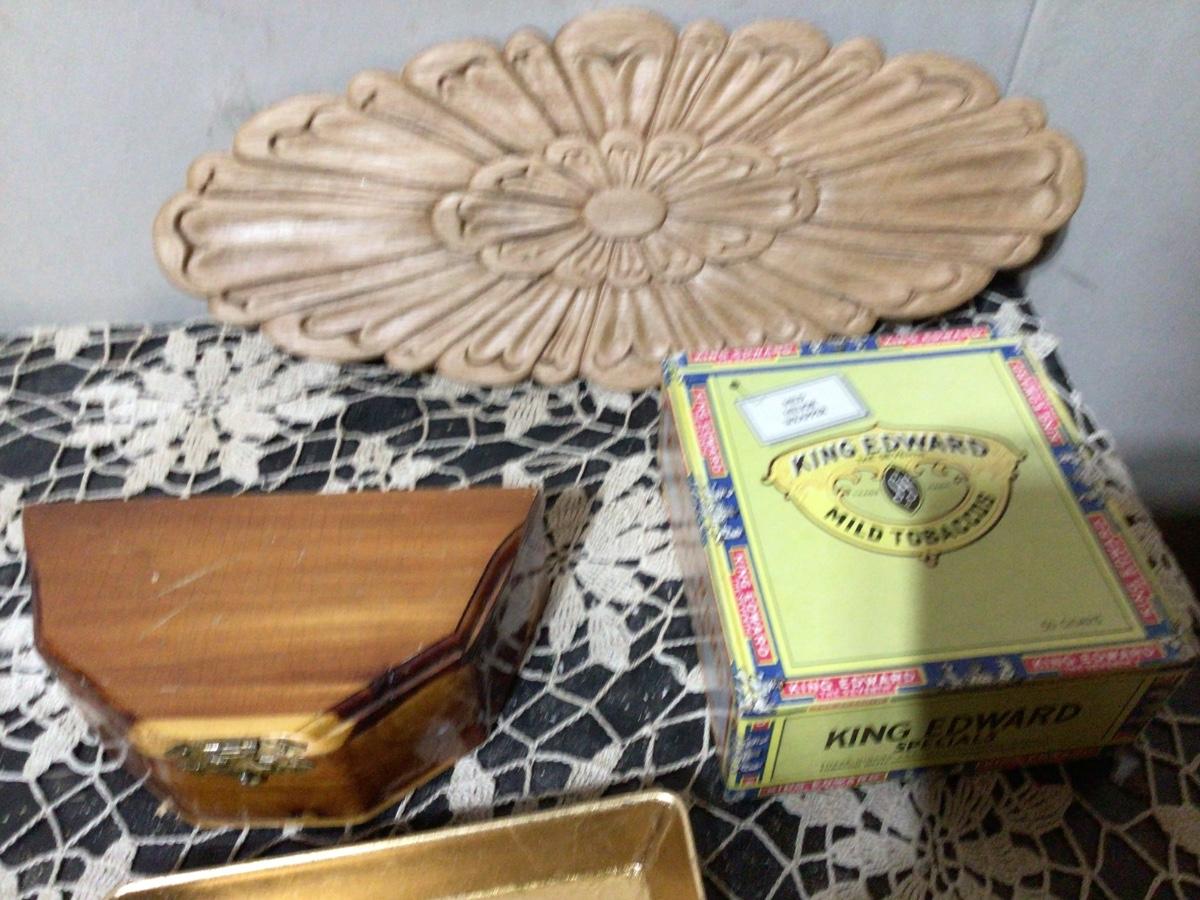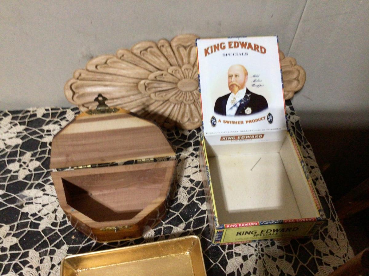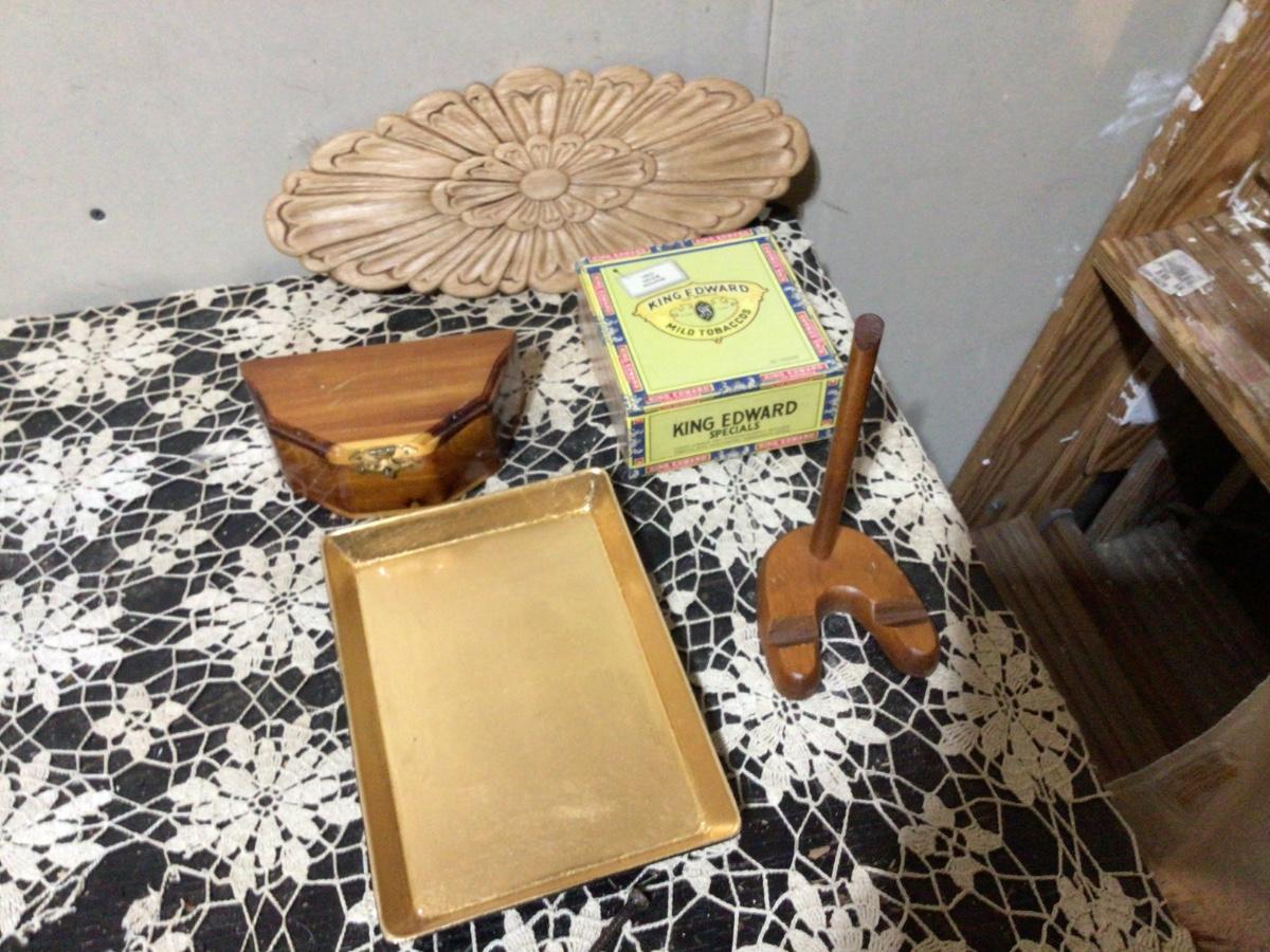 You ge5 unfinished wood oval plaque, King Edward’s cigar box, small wood box, wood plate stand, gold tray.