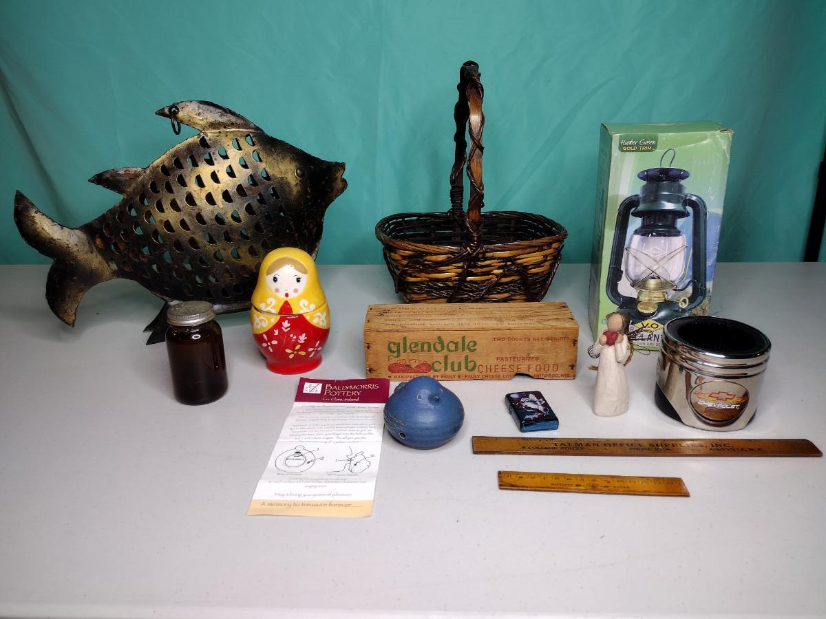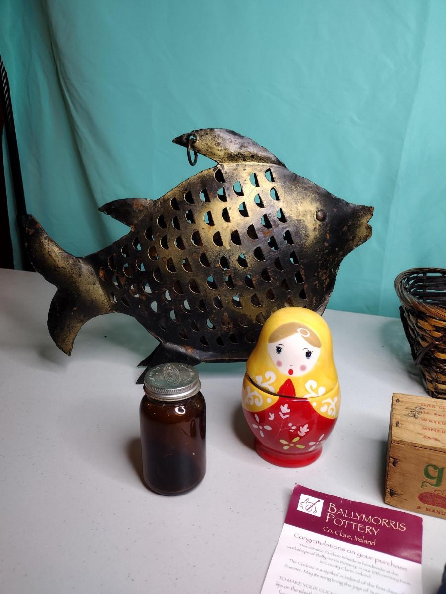 Wide variety of items including a metal art fish, a pottery bird whistle, and more! See pictures for details.