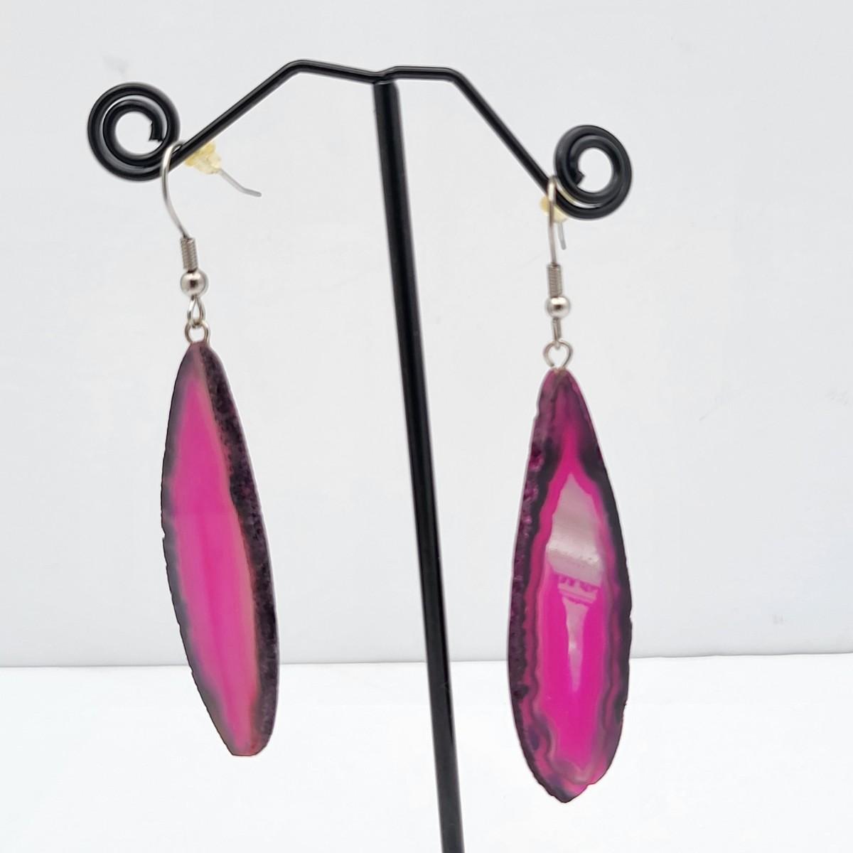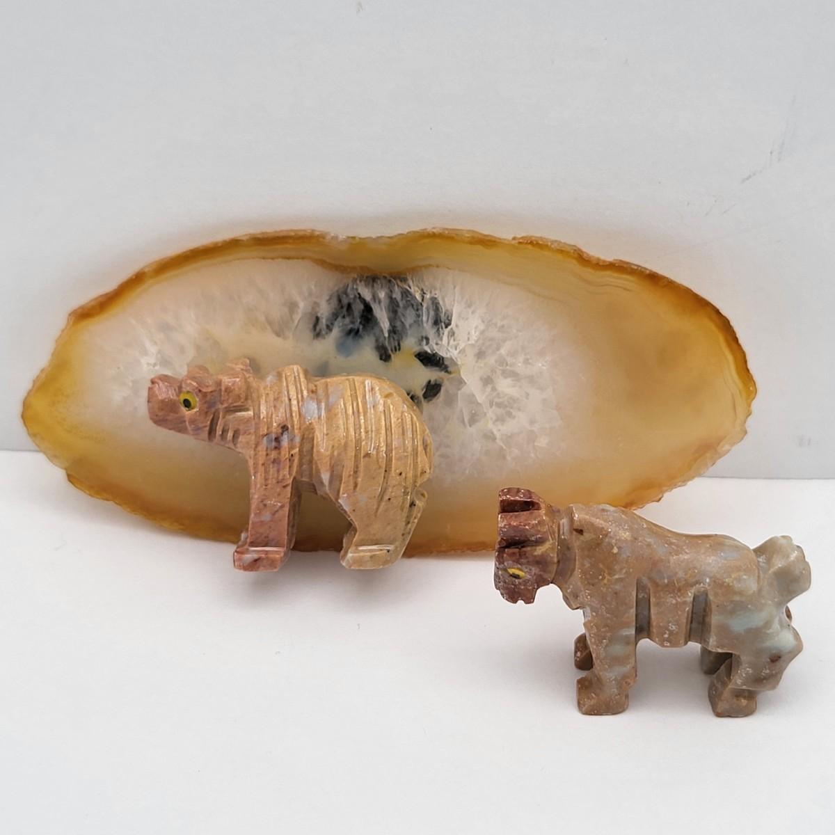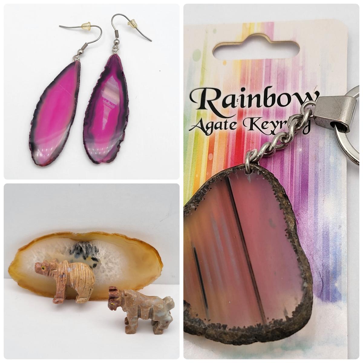 Pink agate earrings. Earthtones agate key chain. Agate magnet with stone carved bear. Stone carved goat. Earrings are 2" long x .75" wide. Key chain agate measures 2" x 1.75". Agate slab magnet measures 4" long x 1.75" tall. Stone carved animals are 1.5" x 1".