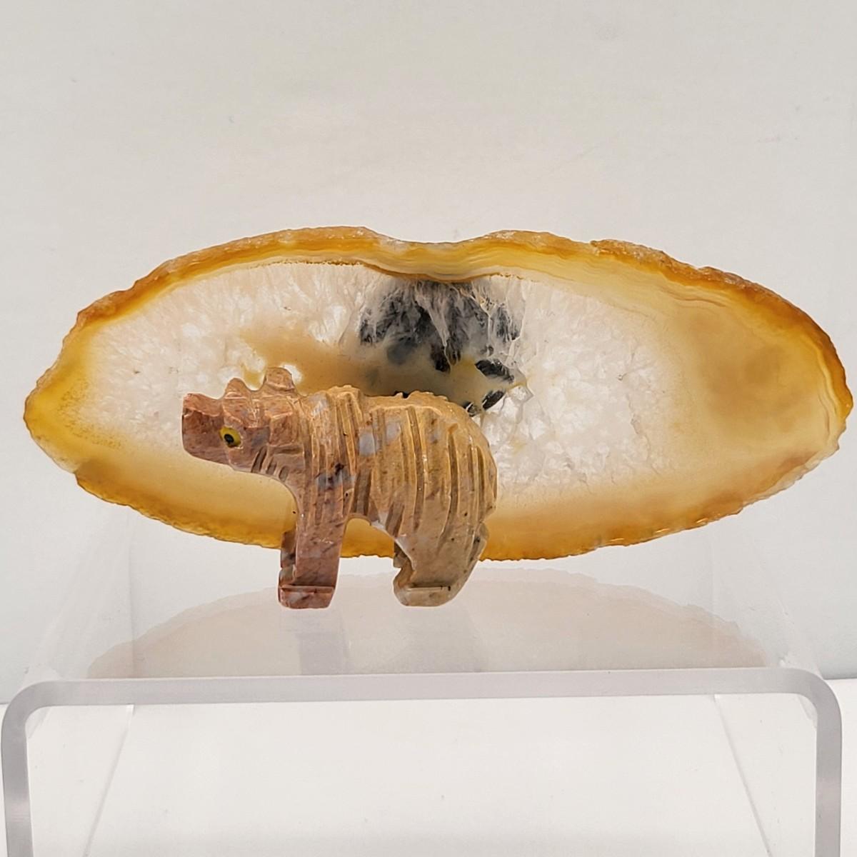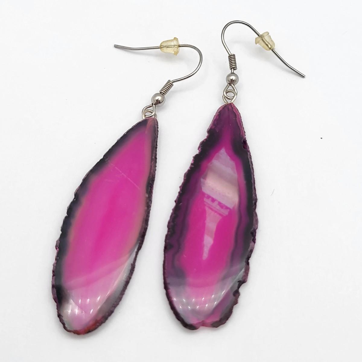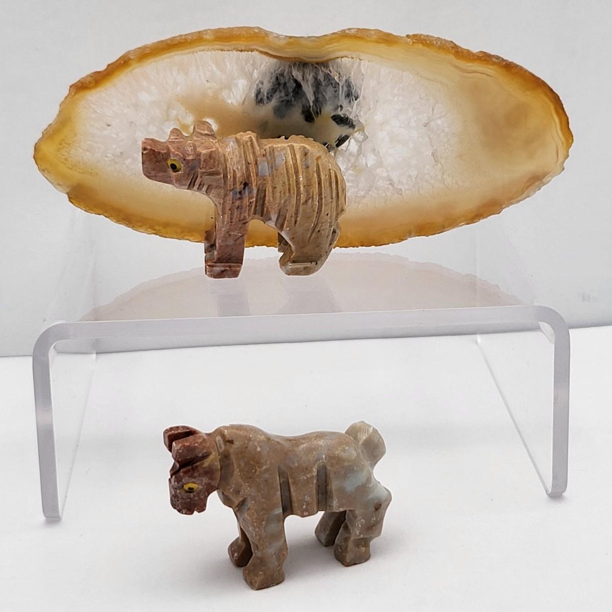 Pink agate earrings. Earthtones agate key chain. Agate magnet with stone carved bear. Stone carved goat. Earrings are 2" long x .75" wide. Key chain agate measures 2" x 1.75". Agate slab magnet measures 4" long x 1.75" tall. Stone carved animals are 1.5" x 1".