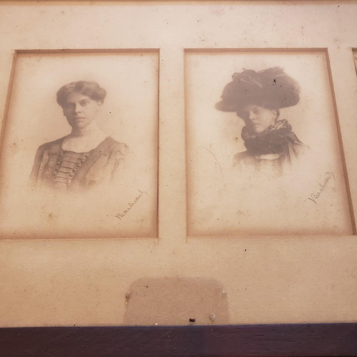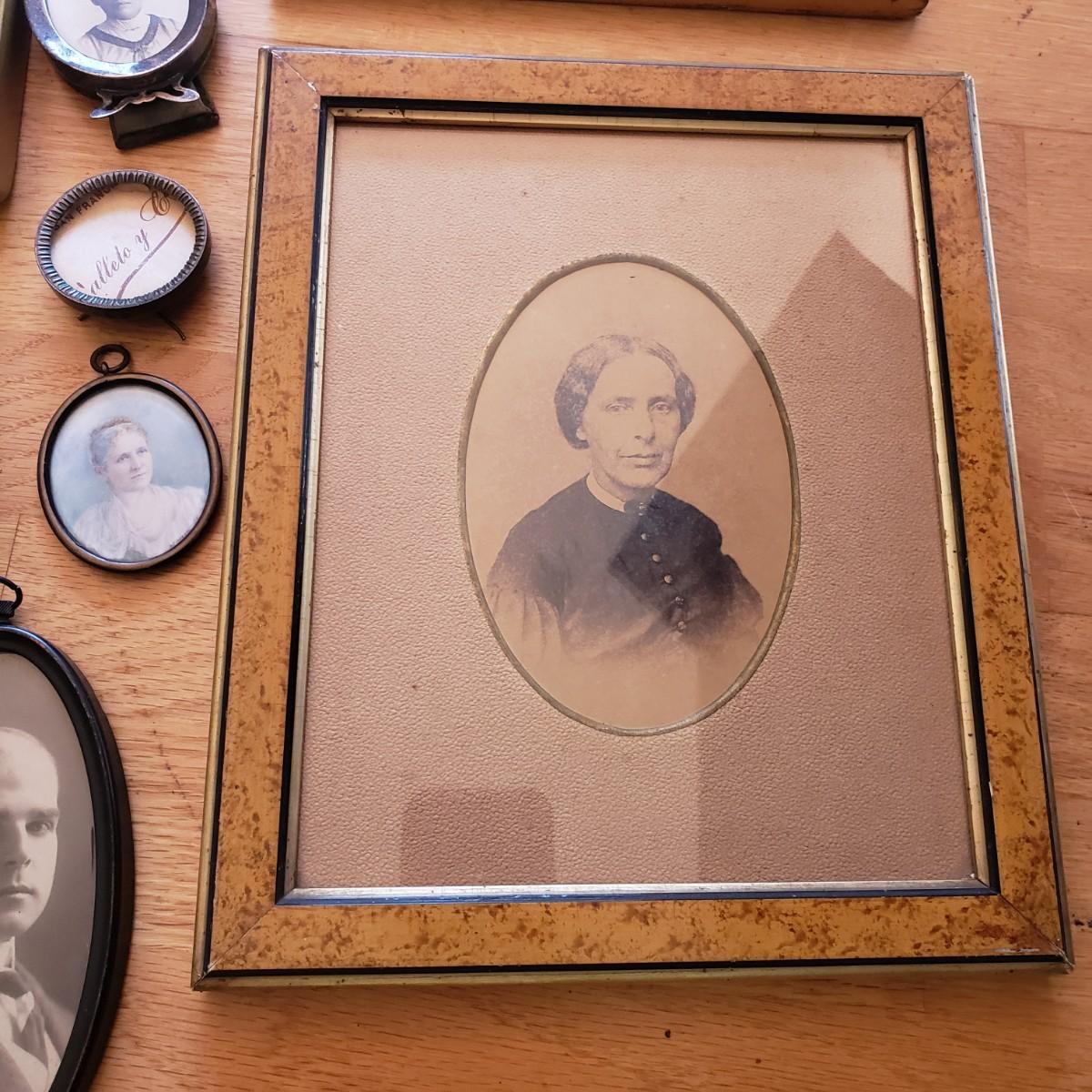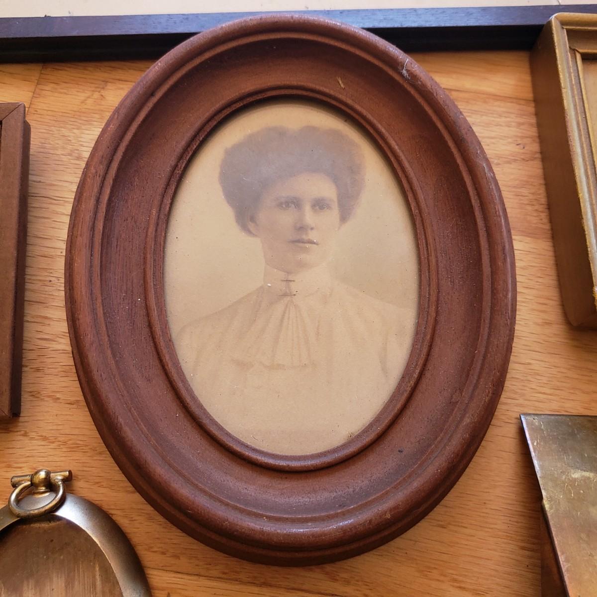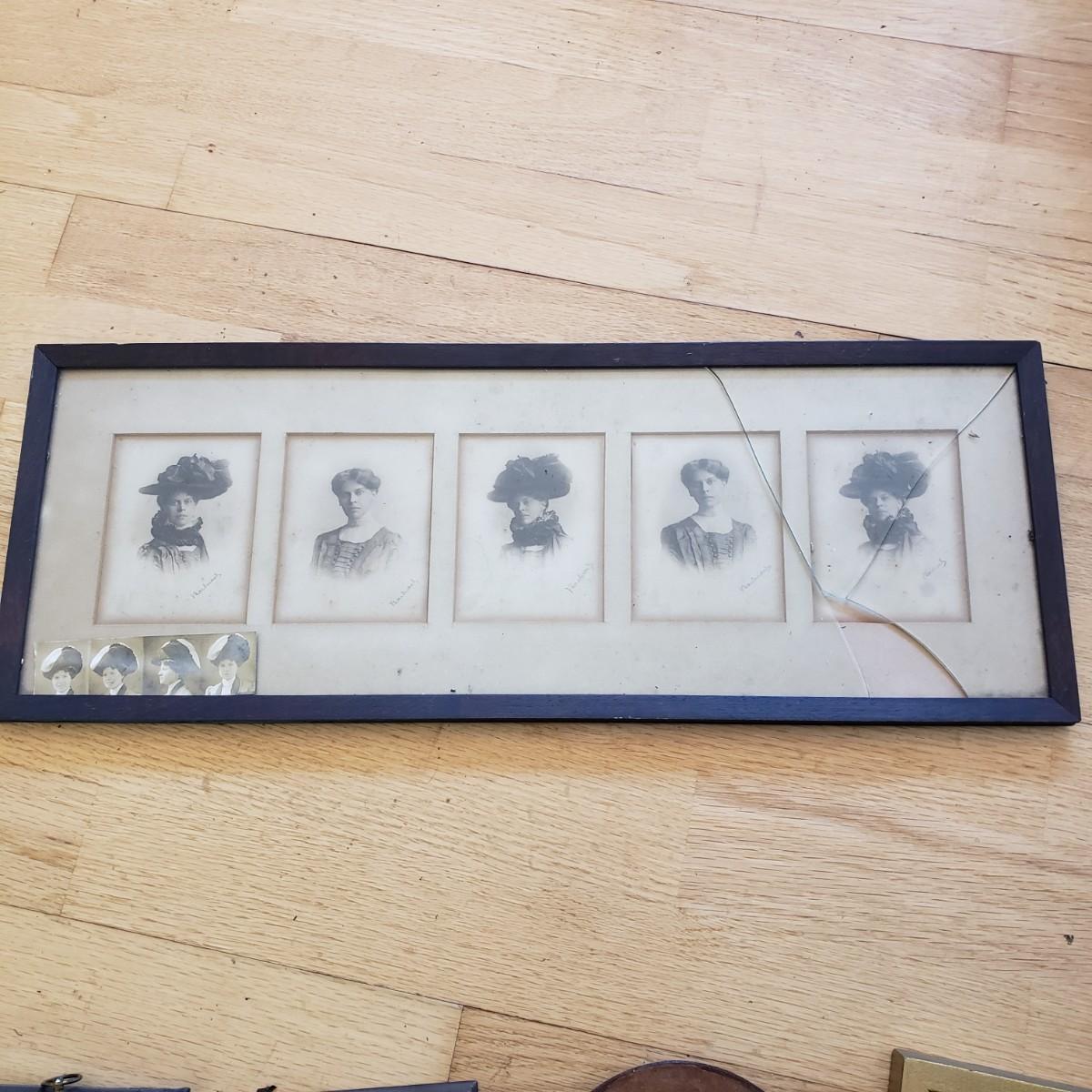This 17 piece lot is mostly vintage, possibly antique frames. Many of the frames contain antique-style portrait photographs. Some do not have glass. The largest frame with the photos of five women measures 21" x 8". The glass is broken on this frame, yet we didn't risk taking it off. Wear from age is seen on many of the frames, please see photos for conditions.