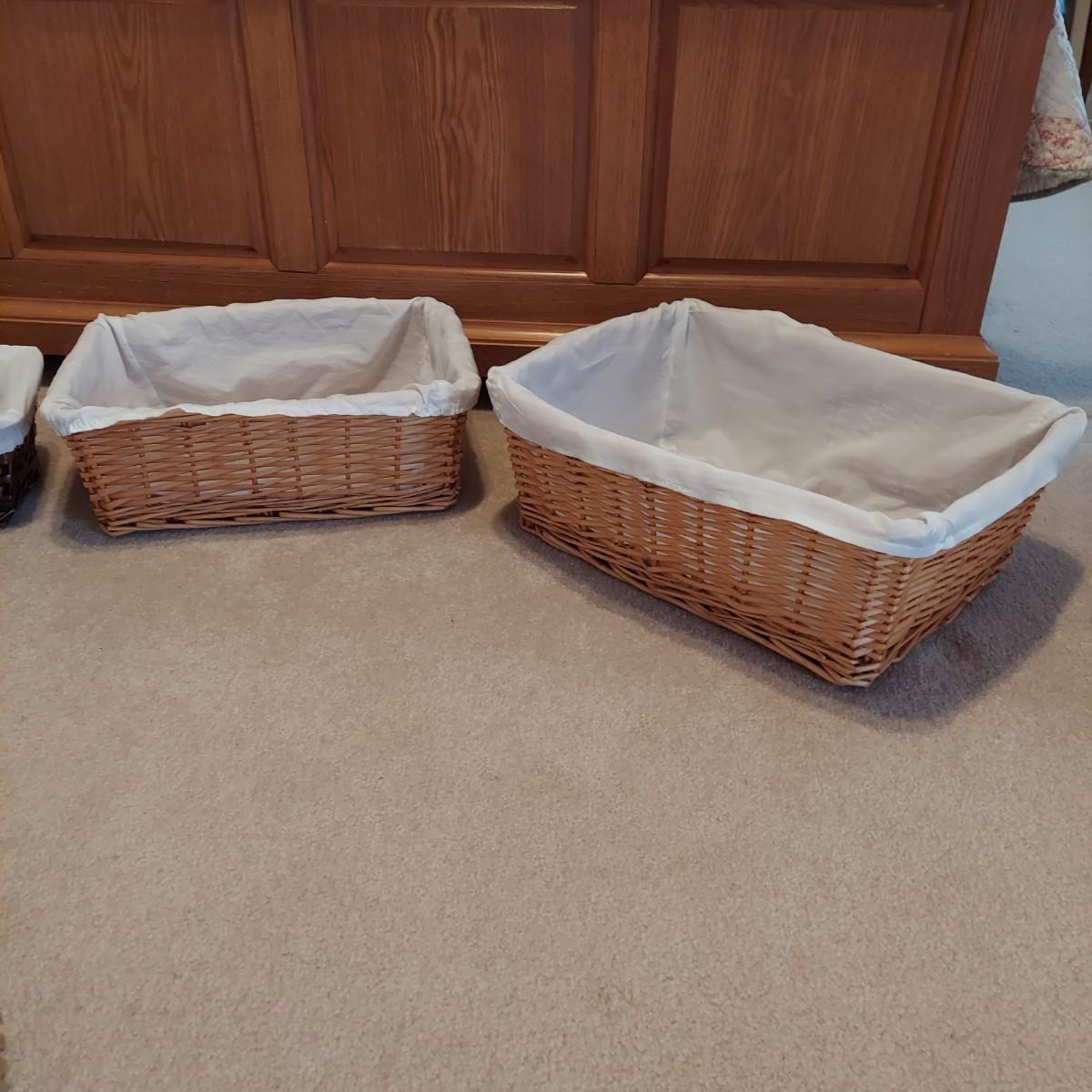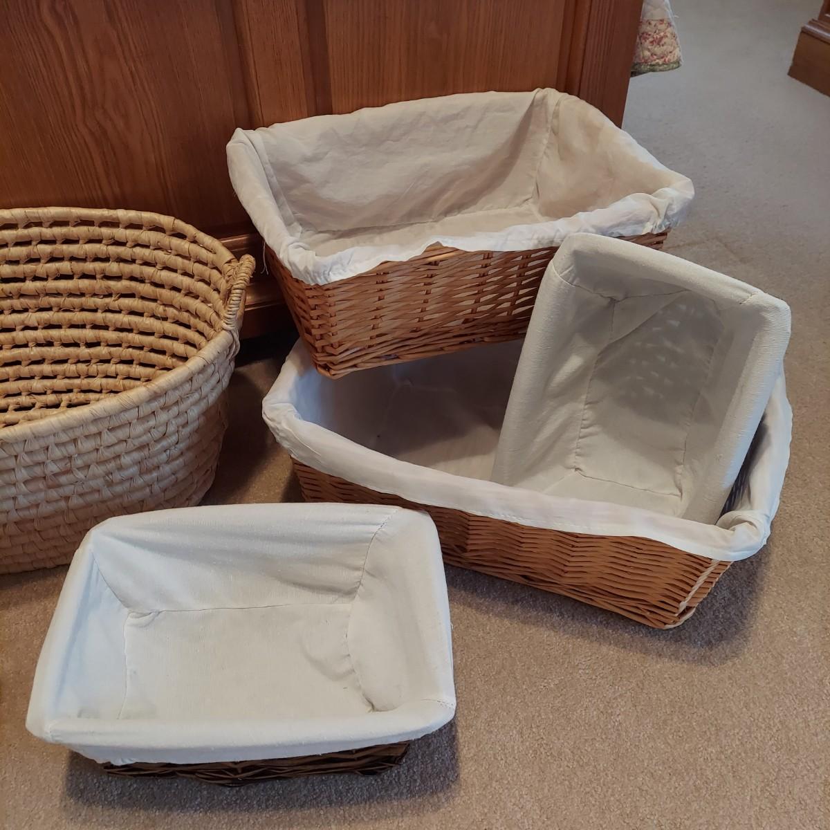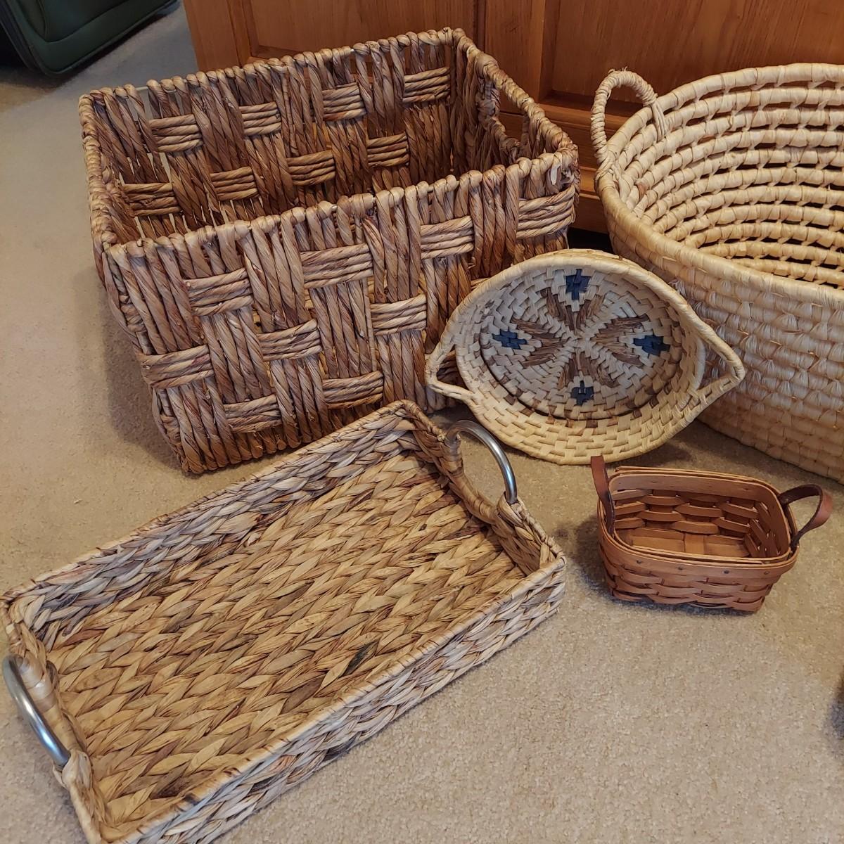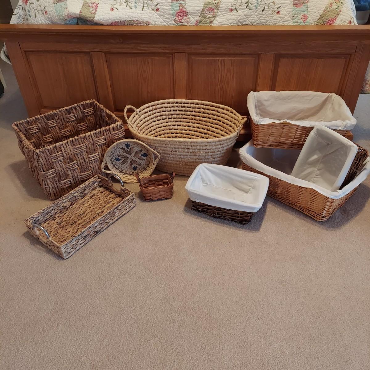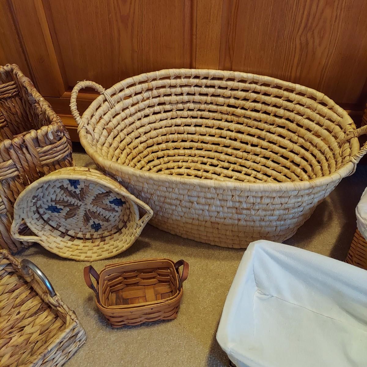 Nine baskets of various sizes and materials. The large, rectangular basket shown on the far left measures 16” x 12” x 11"H. The Longaberger basket is marked on bottom. It measures approximately 6” x 4” x 5"H including the leather handles. Shipping available.